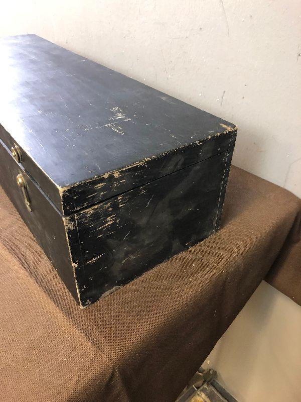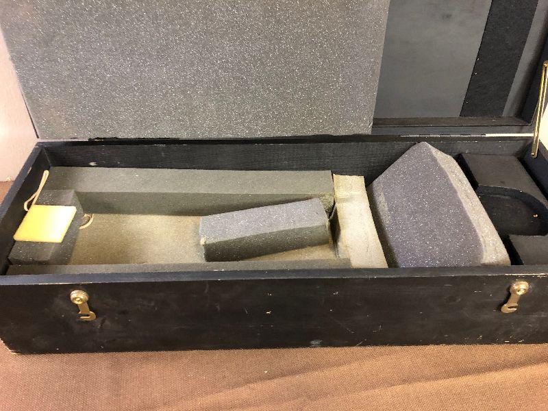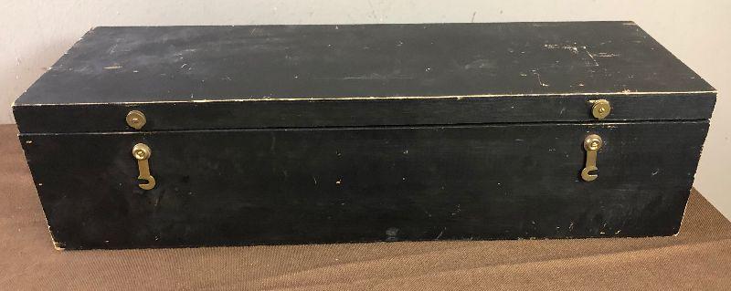 With Foam Padding on the inside. 30 x 10 x 8 Has brass hooks to close it.