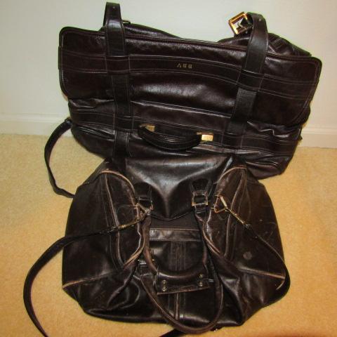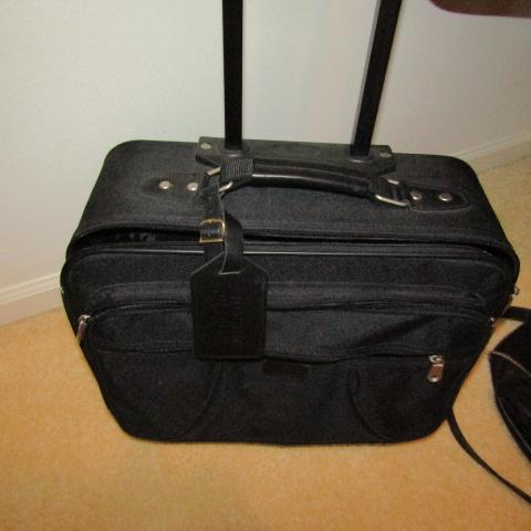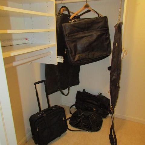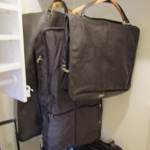 3 GARMENT BAGS, SMALL SUITCASE ON WHEELS AND 2 DUFFLE BAGS