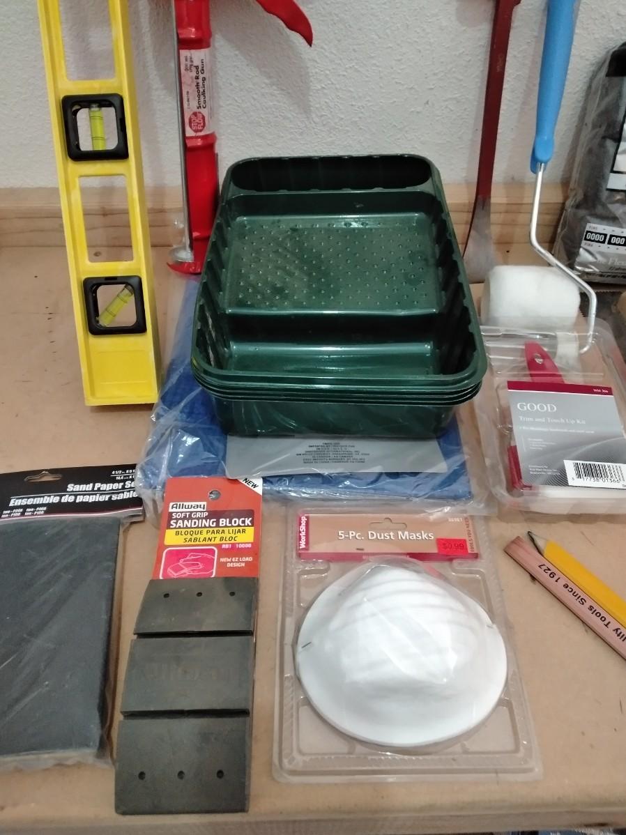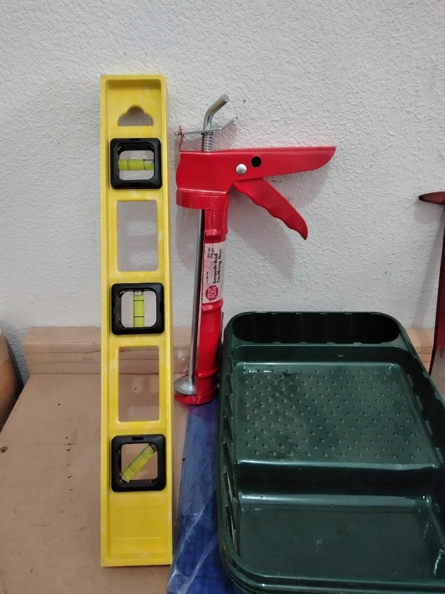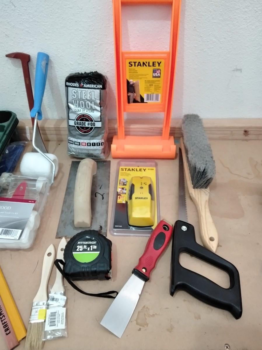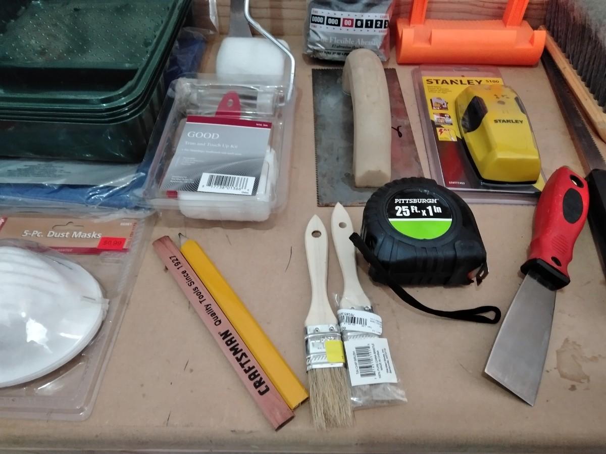 LEVEL, PAINTING ITEMS, CARRYING HELPER, TAPE MEASURE, PUTTY KNIVES, AND MORE