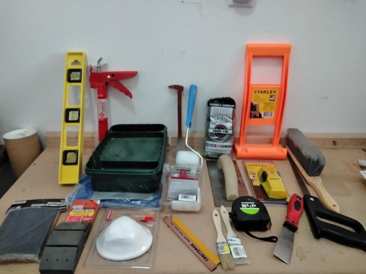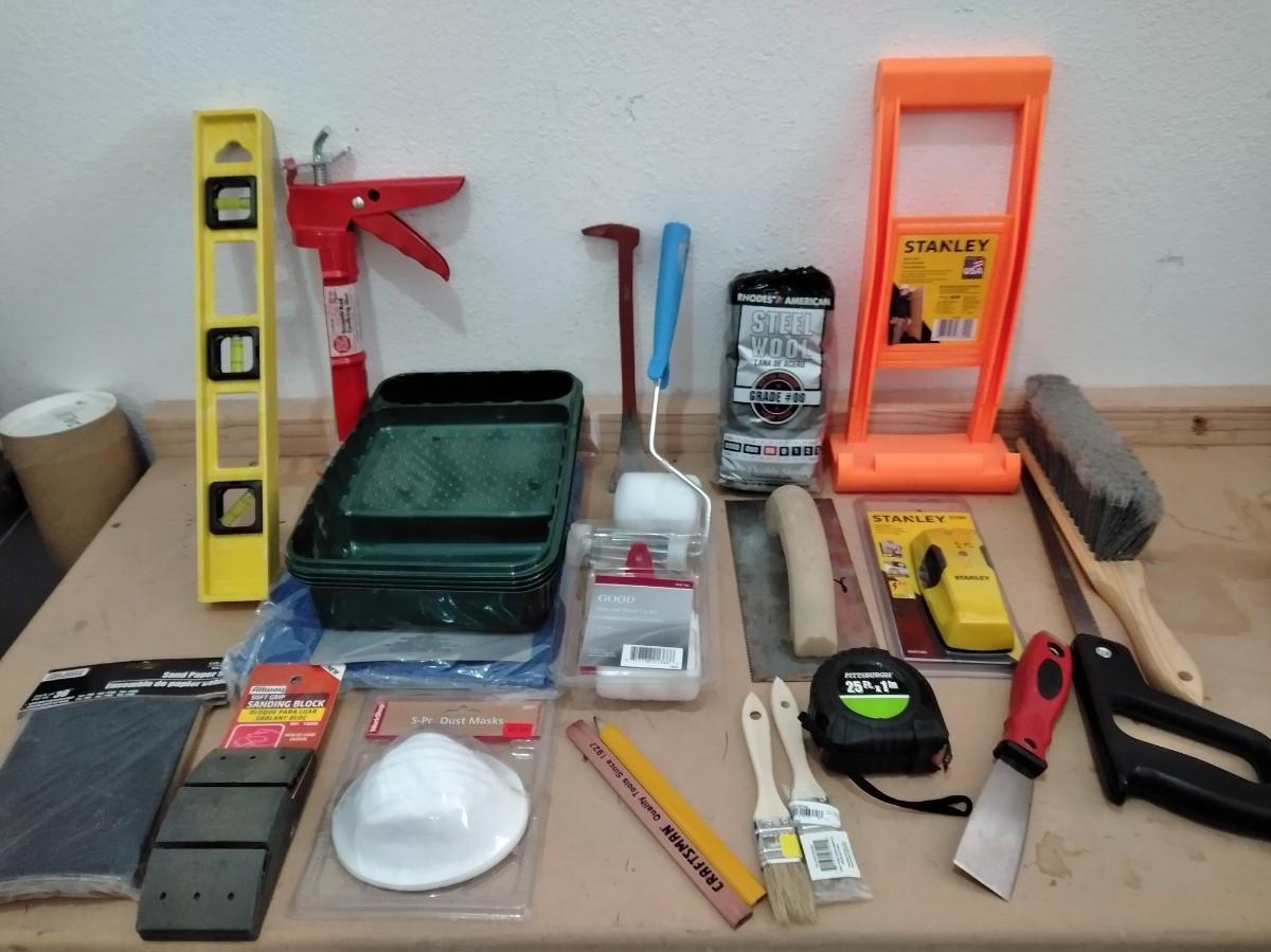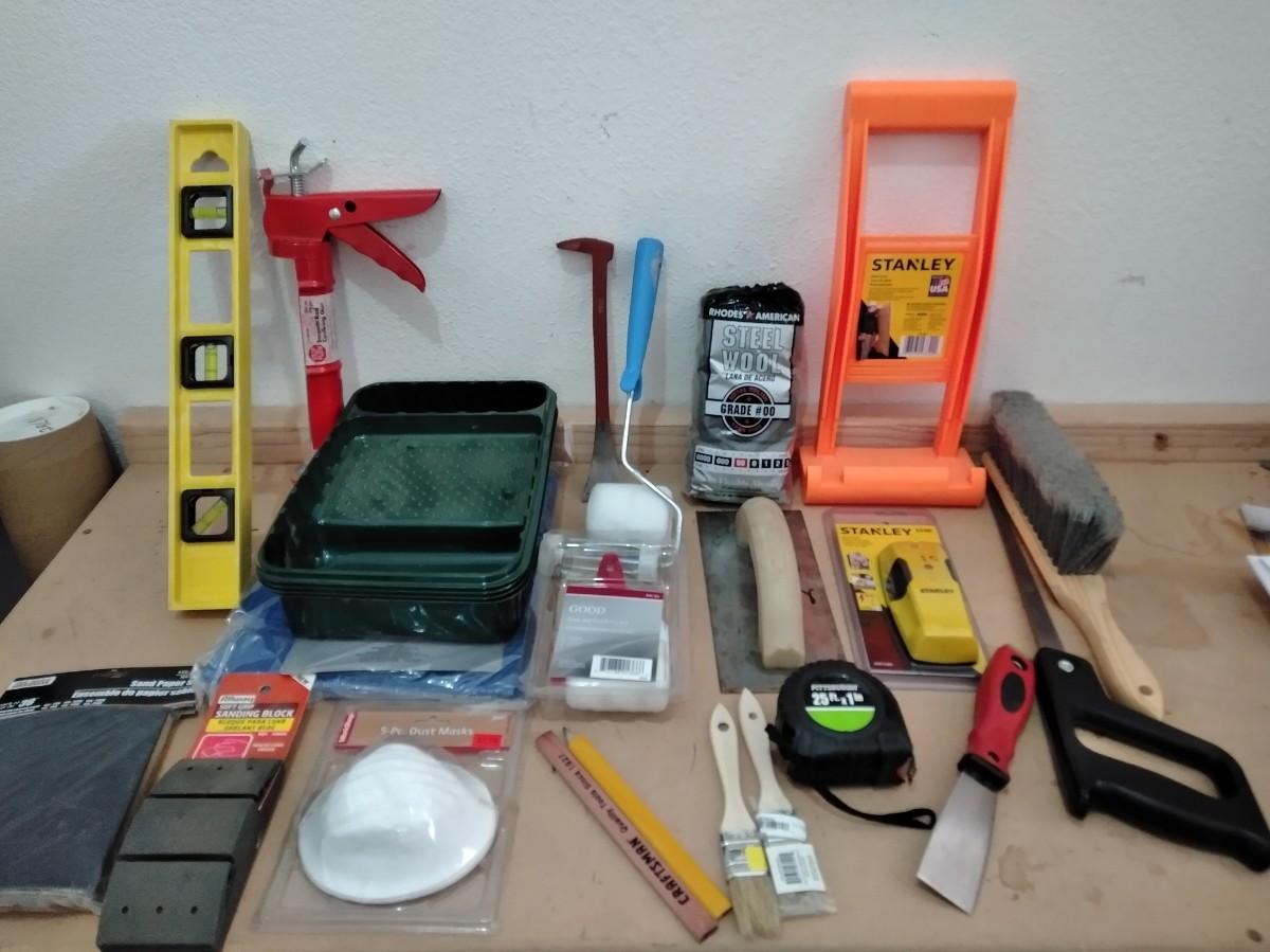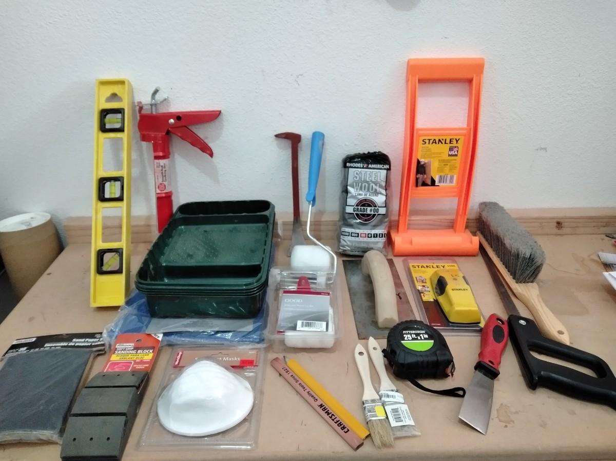 LEVEL, PAINTING ITEMS, CARRYING HELPER, TAPE MEASURE, PUTTY KNIVES, AND MORE