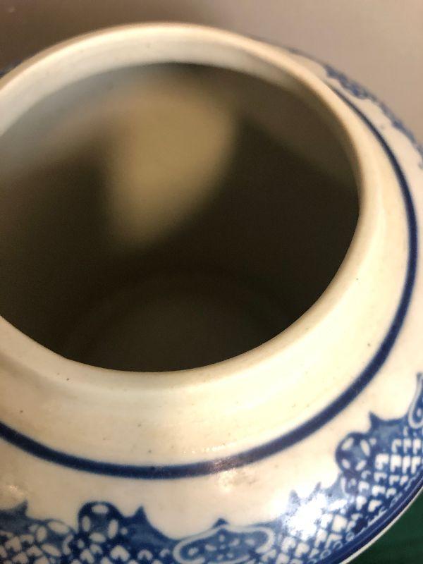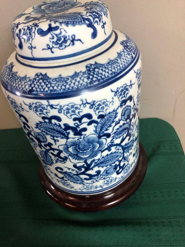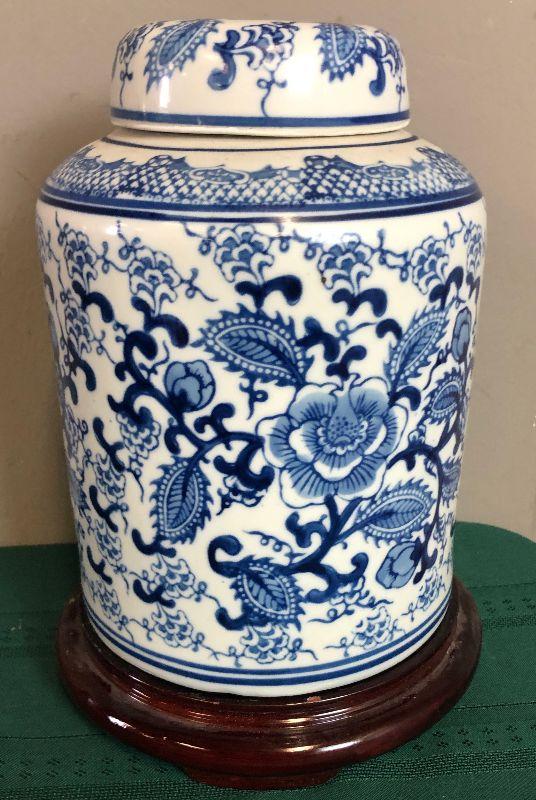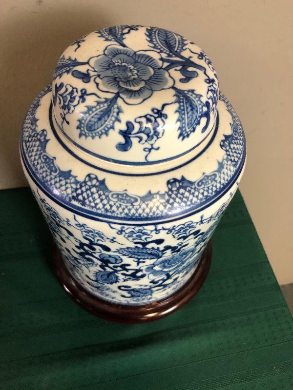 Lot # 281 Blue Transferware Ginger Jar on Rosewood Base