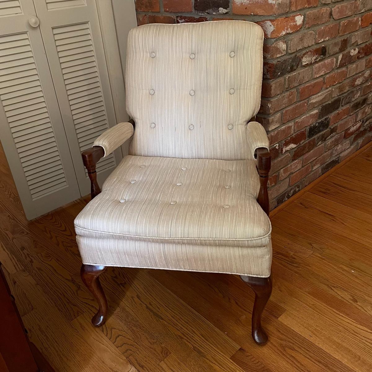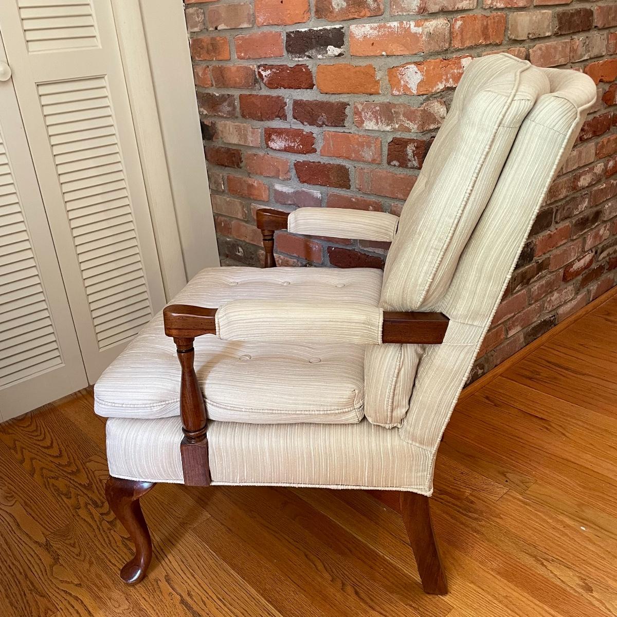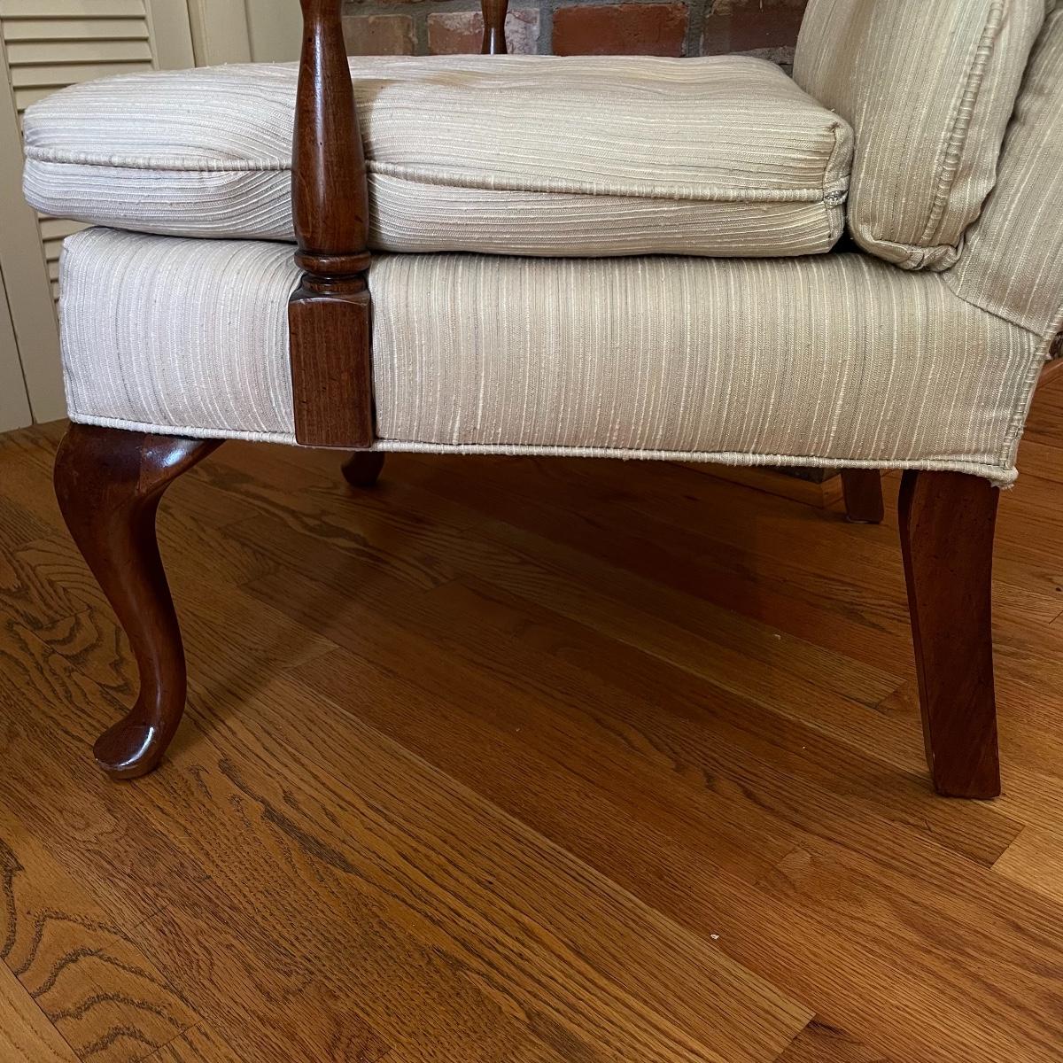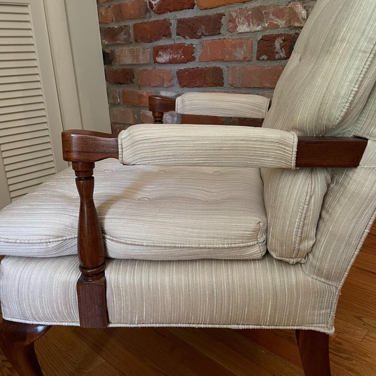 Here’s a stunning wooden framed arm chair with ivory striped upholstery. Chair has simple yet elegant designs with beautiful wood grains showing throughout. It is also very comfortable with well made cushions and padded arms. This piece measures 24” x 25” x 34.5” with a seat height at 18”. See images. Local pick up only.