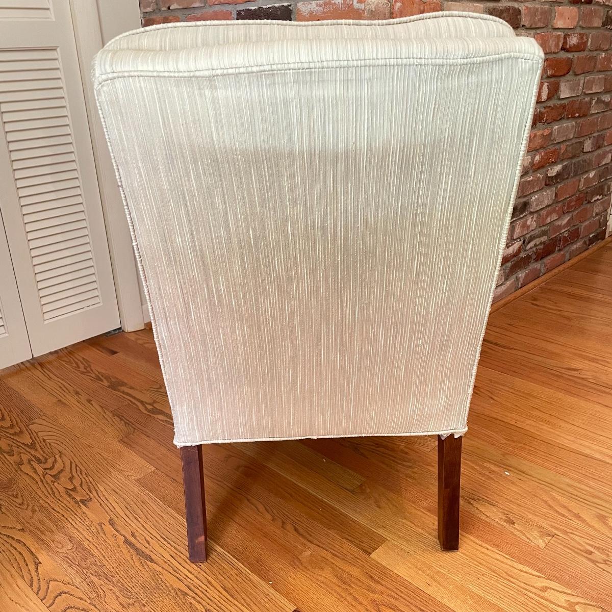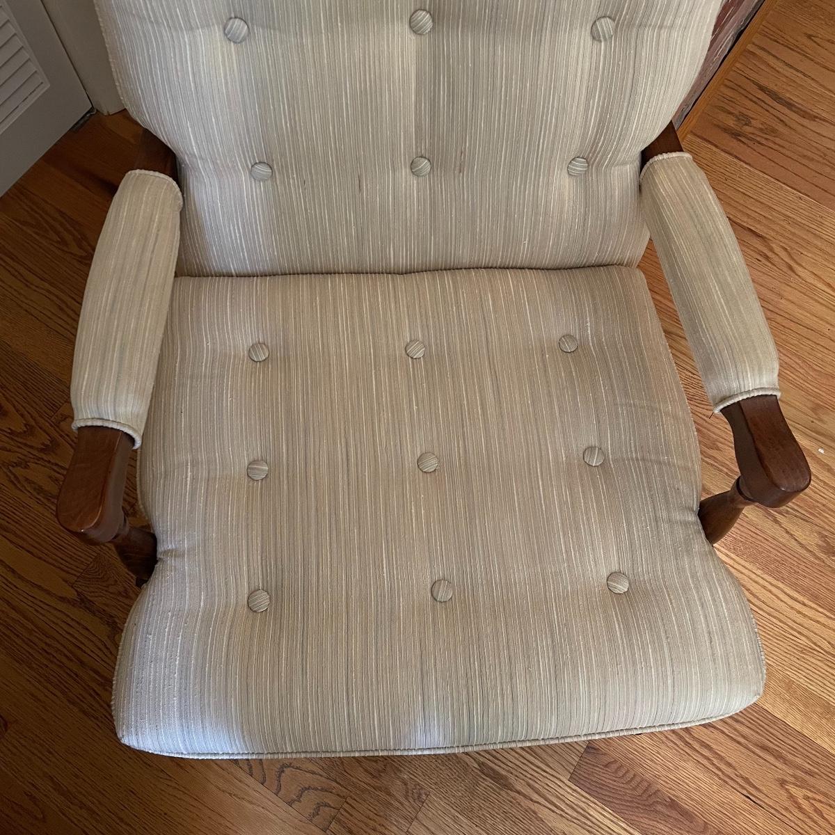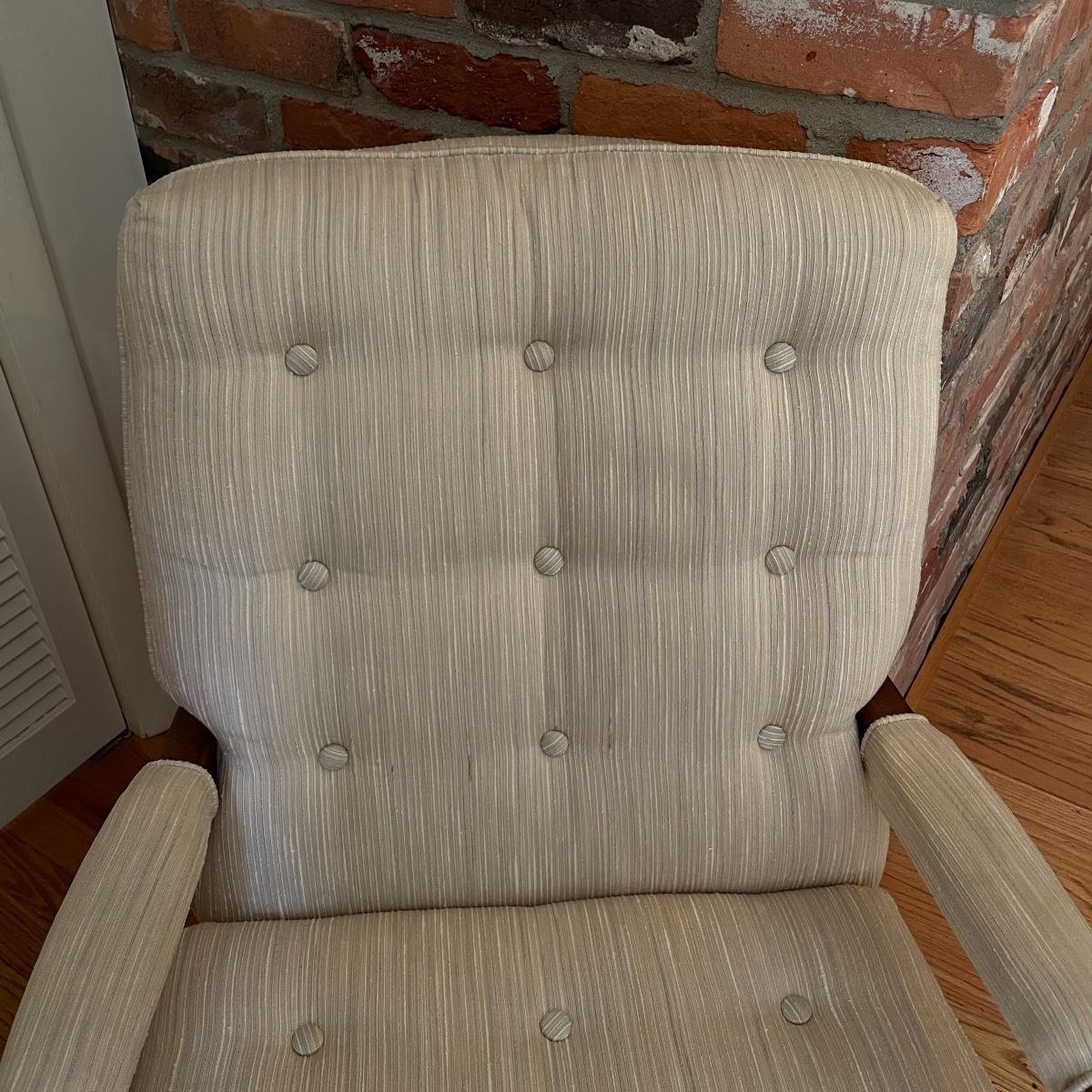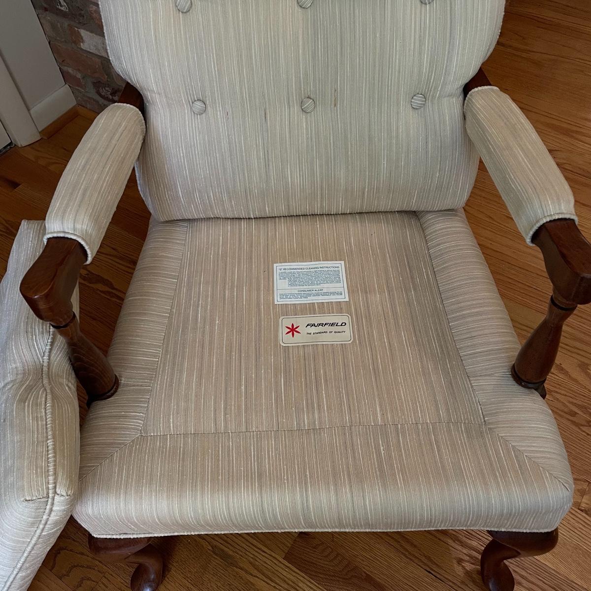 Here’s a stunning wooden framed arm chair with ivory striped upholstery. Chair has simple yet elegant designs with beautiful wood grains showing throughout. It is also very comfortable with well made cushions and padded arms. This piece measures 24” x 25” x 34.5” with a seat height at 18”. See images. Local pick up only.