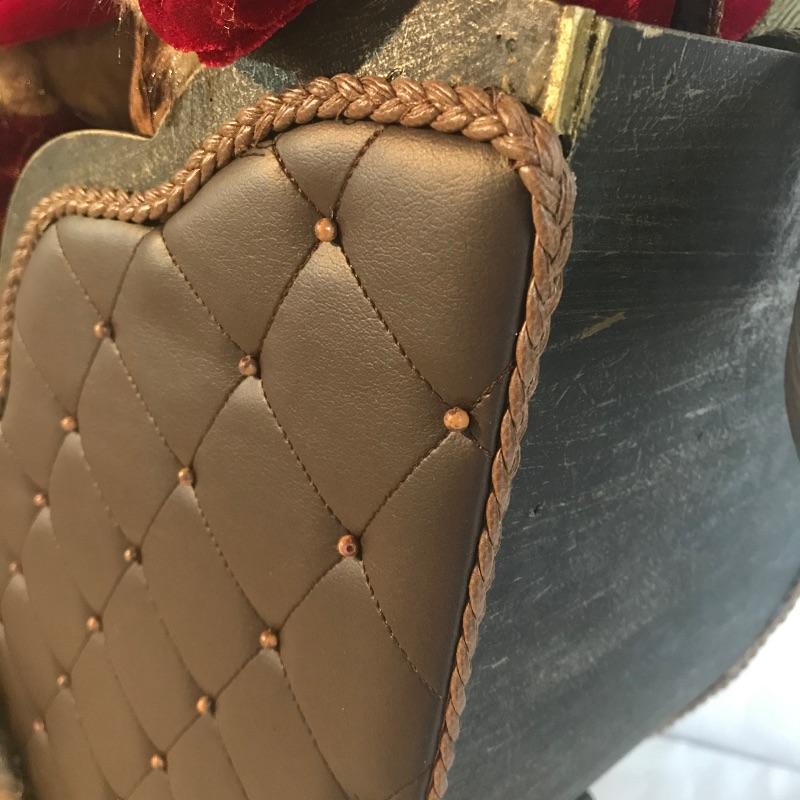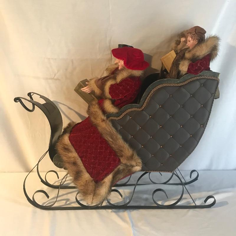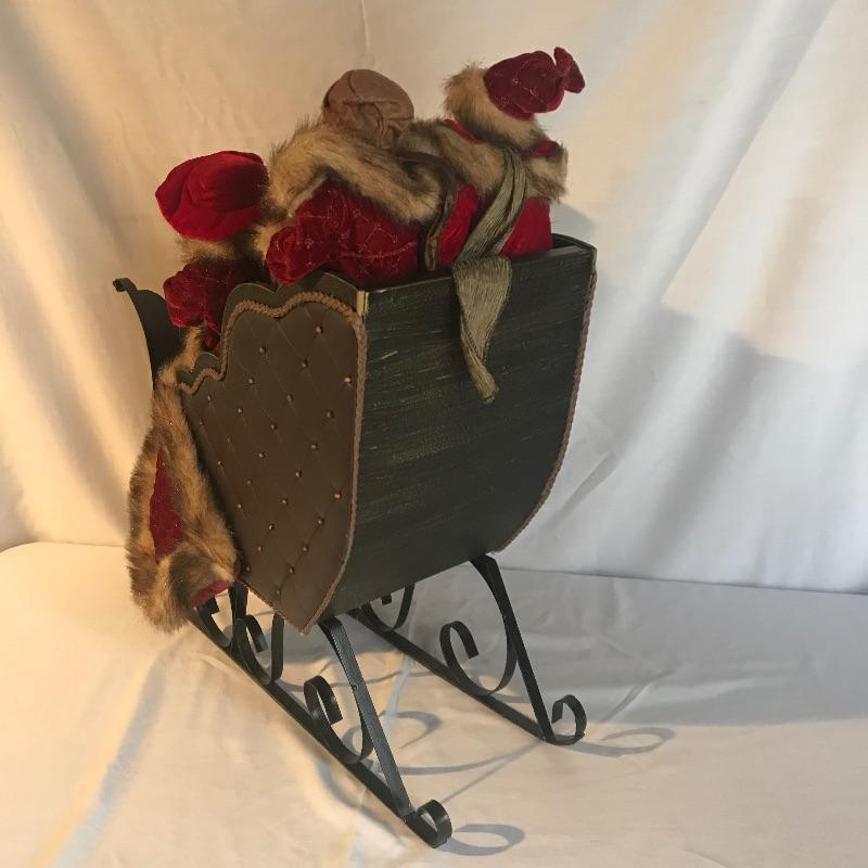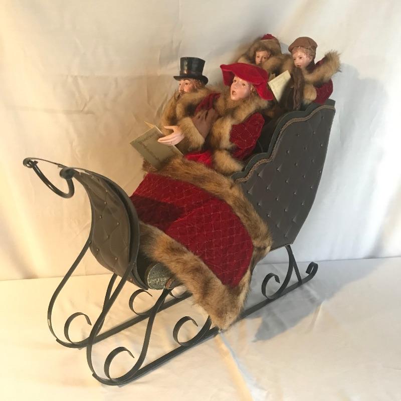 Four merry carolers in a metal and wooden sleigh with a leather like cover evoking times of old. This piece has amazing details throughout, such as music in their books, rosy cheeks and matching blanket and coats. Decor measures approximately 24” x 8.5” x 23”. No shipping.