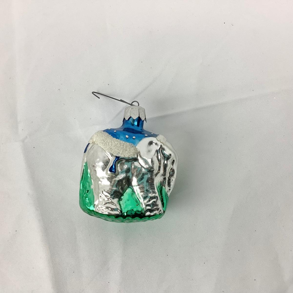 1 ) Vintage Poland Blown Glass Christmas Ornament, Elephant, Blue/Green/White Flocked - measures 2.5” High x 2” Wide