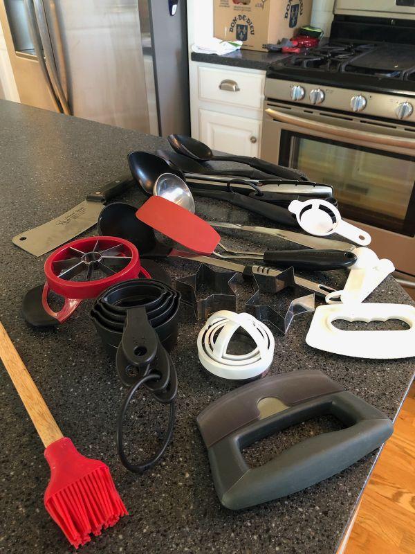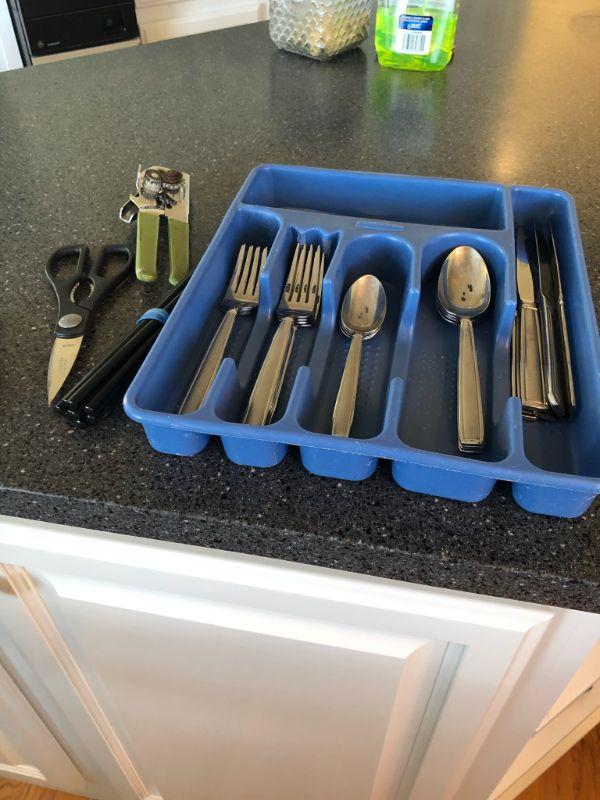 4 place setting of Mikasa flatware and some kitchen utensils, organizer is included