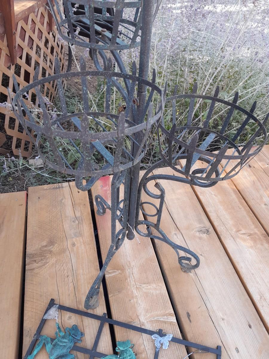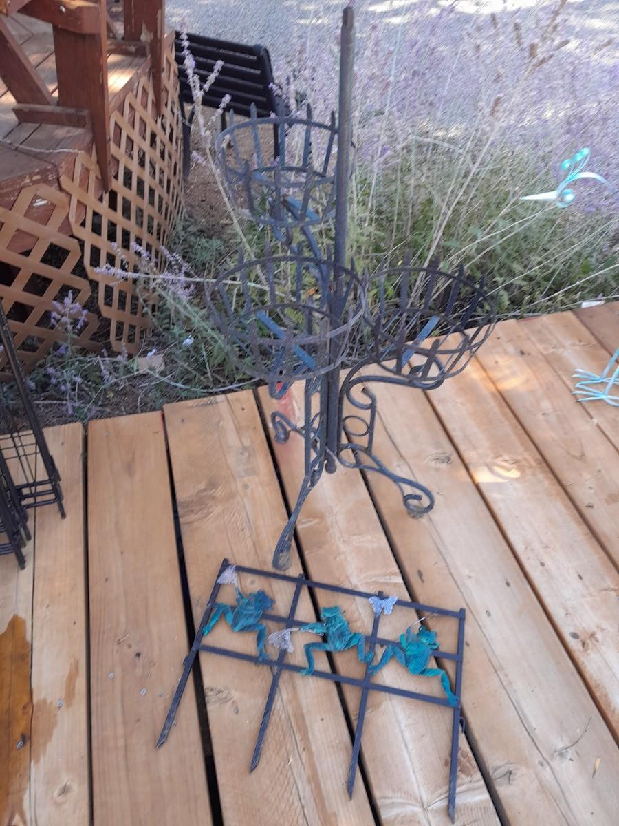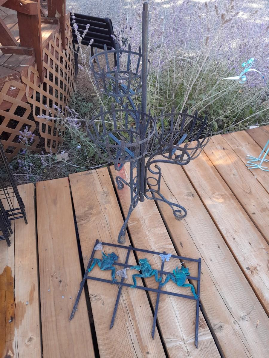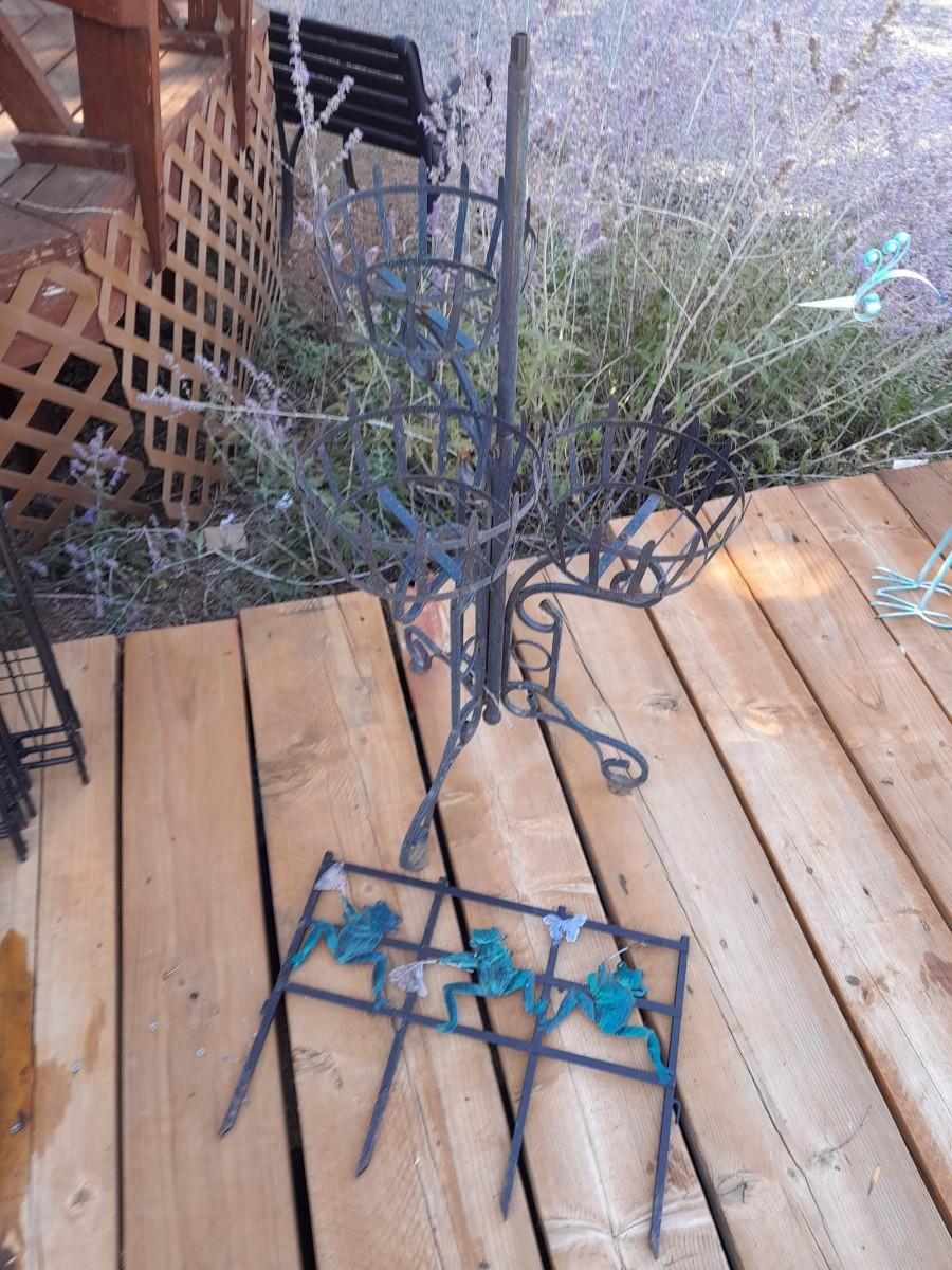 MULTI TIERED FOLD UP PLANT STAND AND SMALL DECORATIVE FROG FENCE PANEL