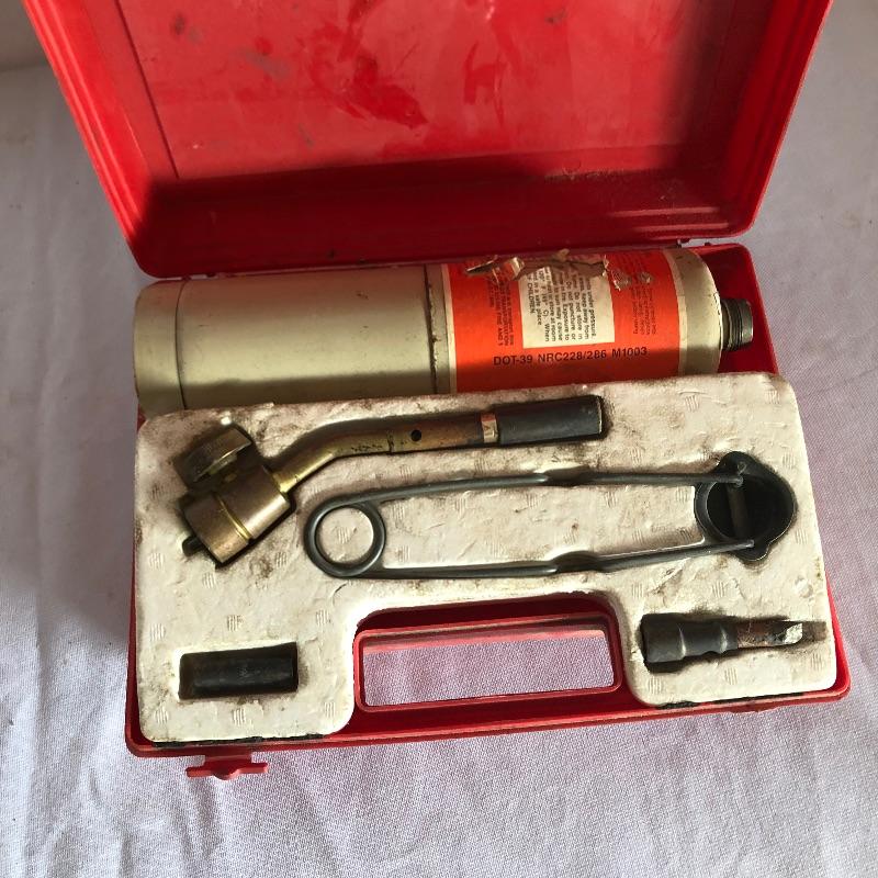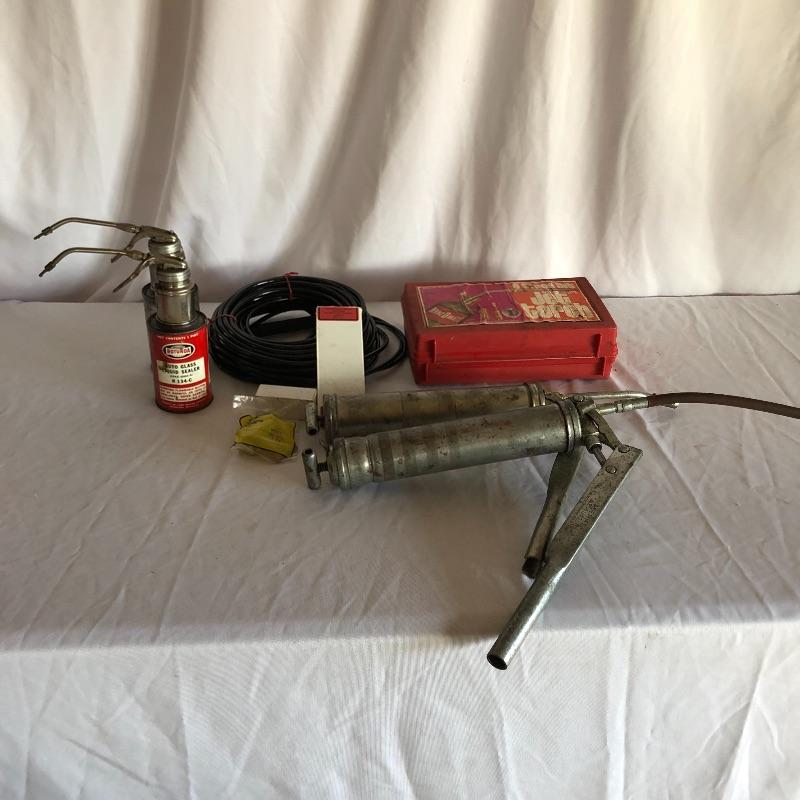 Keep your equipment lubricated with this this array. Lot includes two grease guns, two oil cans, torch and what appears to be Weldcraft tig cable.