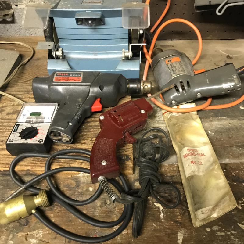 Power tools include a Skil Cordless 2230 Drill (no battery) , a Black and Decker 1/4”Drill, a Manning-Bowman Sander Model 71507 and more. No shipping