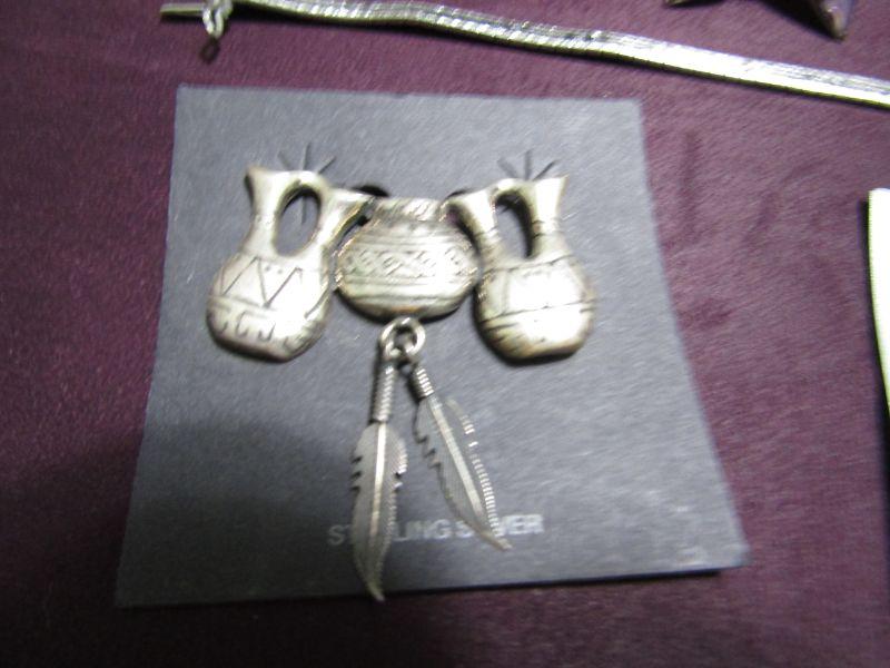 BROOCH OF POTTERY AND FEATHERS MARKED STERLING SILVER