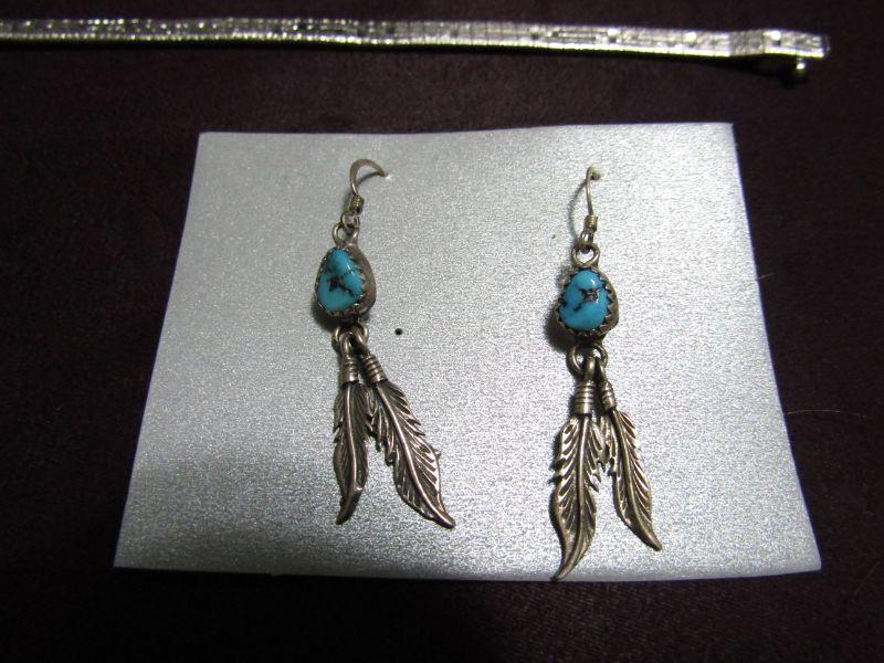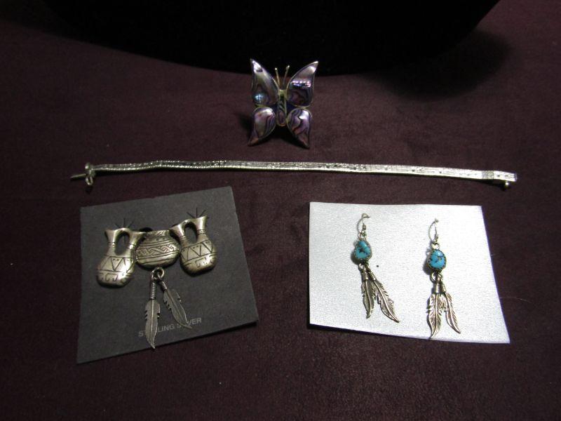 BUTTERFLY BROOCH IS MARKED ALPACA MEXICO & THE TURQUOISE AND FEATHER PIERCED EARRINGS ARE NOT MARKED BUT BELIEVED TO BE STERLING SILVER