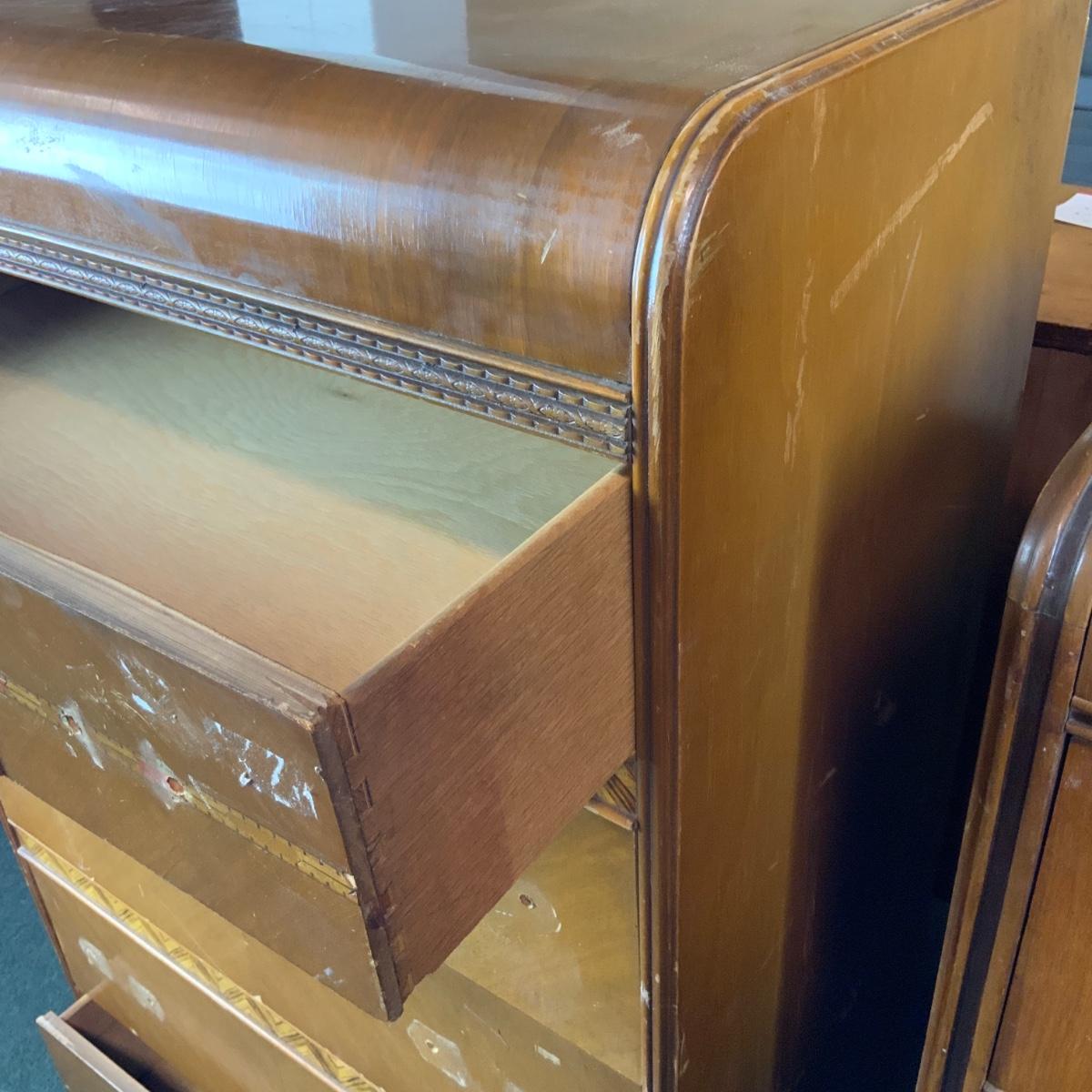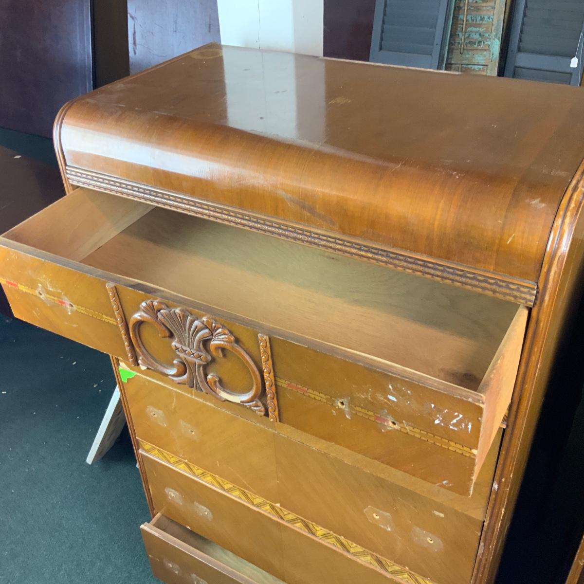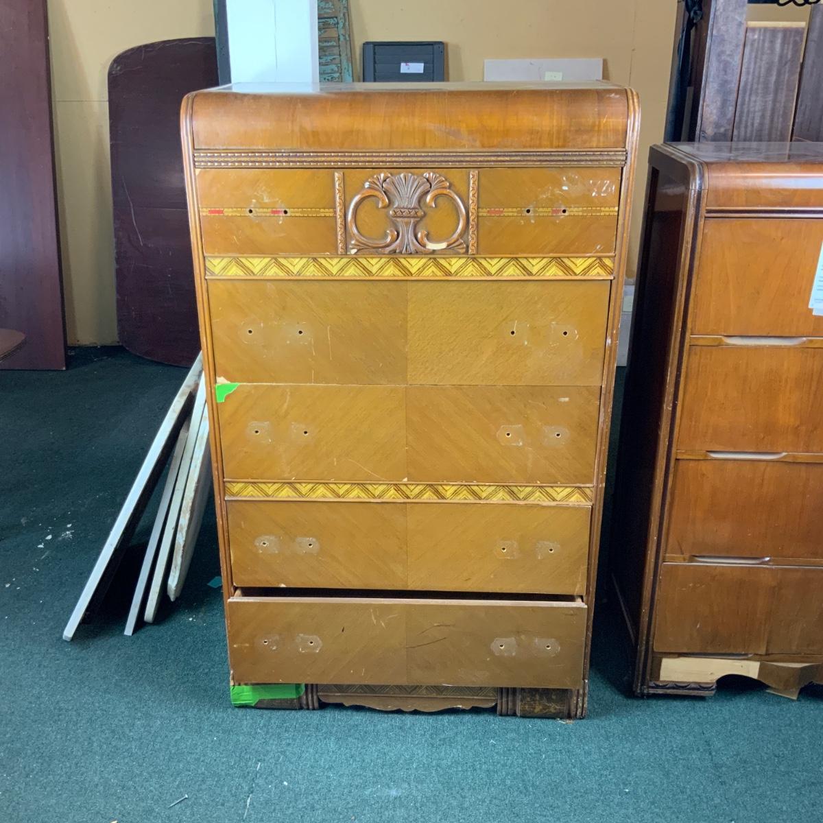 Art Deco Tall Waterfall Chest of Drawers. Needs new hardware. //::\\ Please see photos for details and condition. No attempt has been made to hide any imperfections. All items listed in this auction are warehouse items, and need to be cleaned. A majority of the items need restoration as well. All items are sold AS IS and WITHOUT GUARANTEE. If you are uncertain about an item, DO NOT BID. Due to the nature of this online auction in-person inspection is HIGHLY recommended. All Sales are FINAL. Pick Up Times are FIRM. Please confirm with your own schedule that you can pick up in the scheduled times listed in the Terms and Conditions. Any questions please message the auctioneer. DO NOT Contact The Harp Gallery.