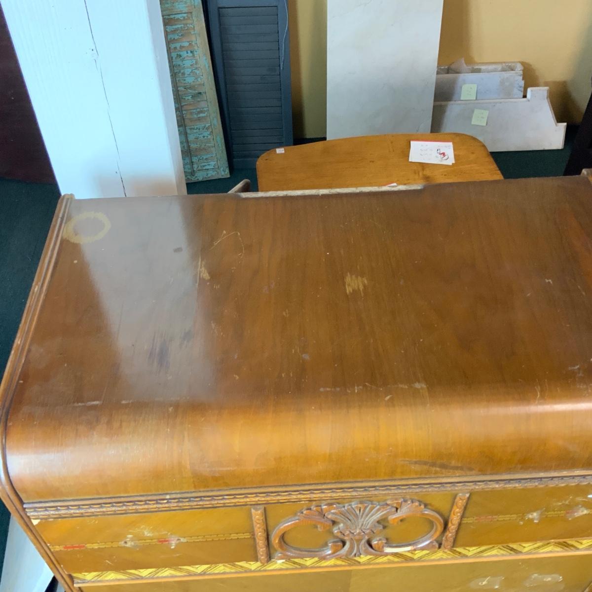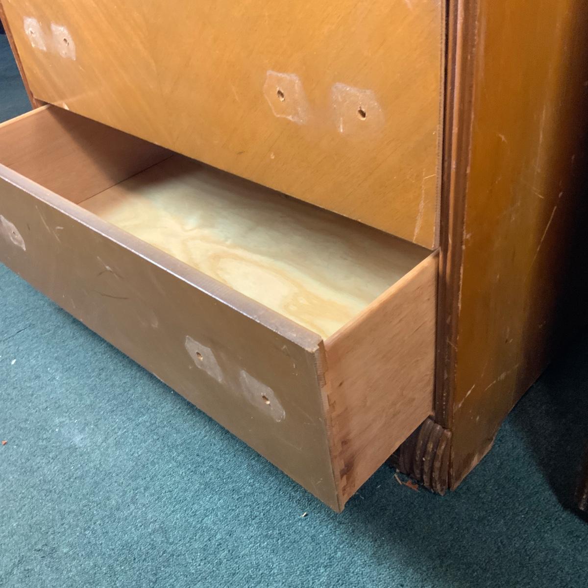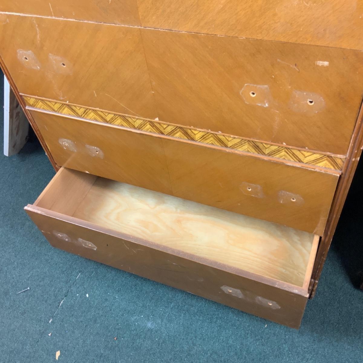 Art Deco Tall Waterfall Chest of Drawers. Needs new hardware. //::\\ Please see photos for details and condition. No attempt has been made to hide any imperfections. All items listed in this auction are warehouse items, and need to be cleaned. A majority of the items need restoration as well. All items are sold AS IS and WITHOUT GUARANTEE. If you are uncertain about an item, DO NOT BID. Due to the nature of this online auction in-person inspection is HIGHLY recommended. All Sales are FINAL. Pick Up Times are FIRM. Please confirm with your own schedule that you can pick up in the scheduled times listed in the Terms and Conditions. Any questions please message the auctioneer. DO NOT Contact The Harp Gallery.