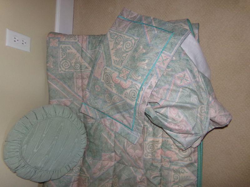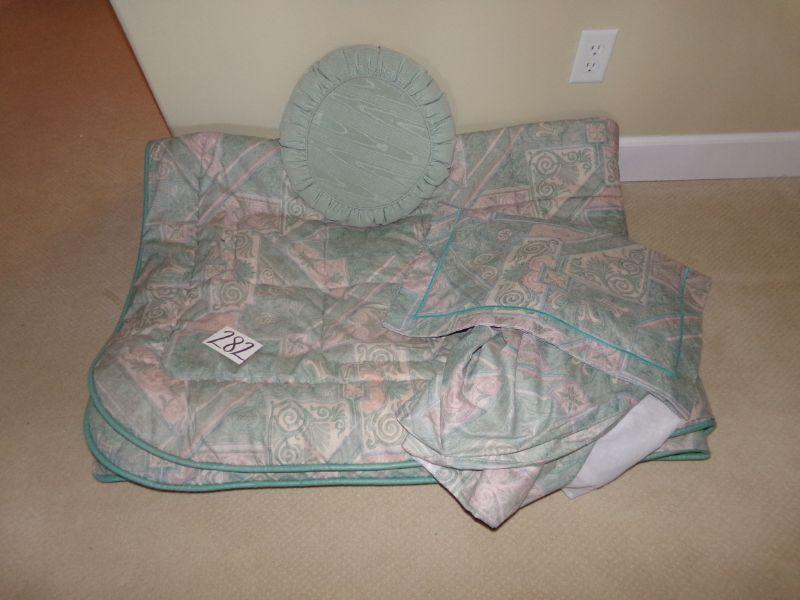 NICE COMFORTER WITH PILLOW SHAMS AND DUST RUFFLE. ALSO INCLUDED IS A MATCHING THROW PILLOW.