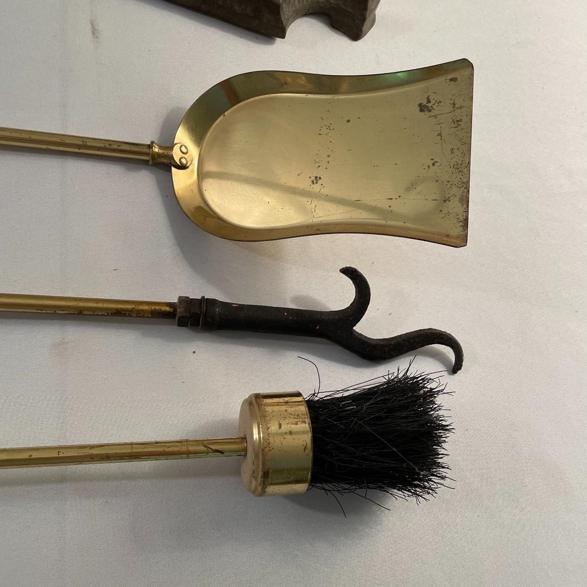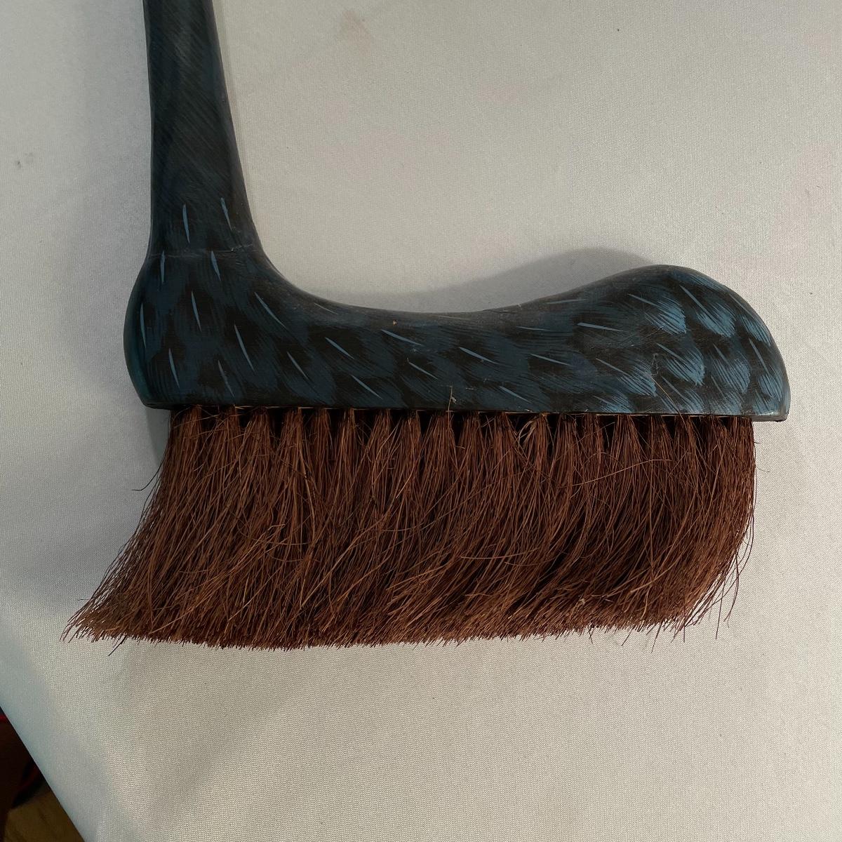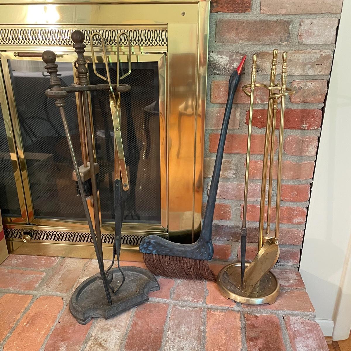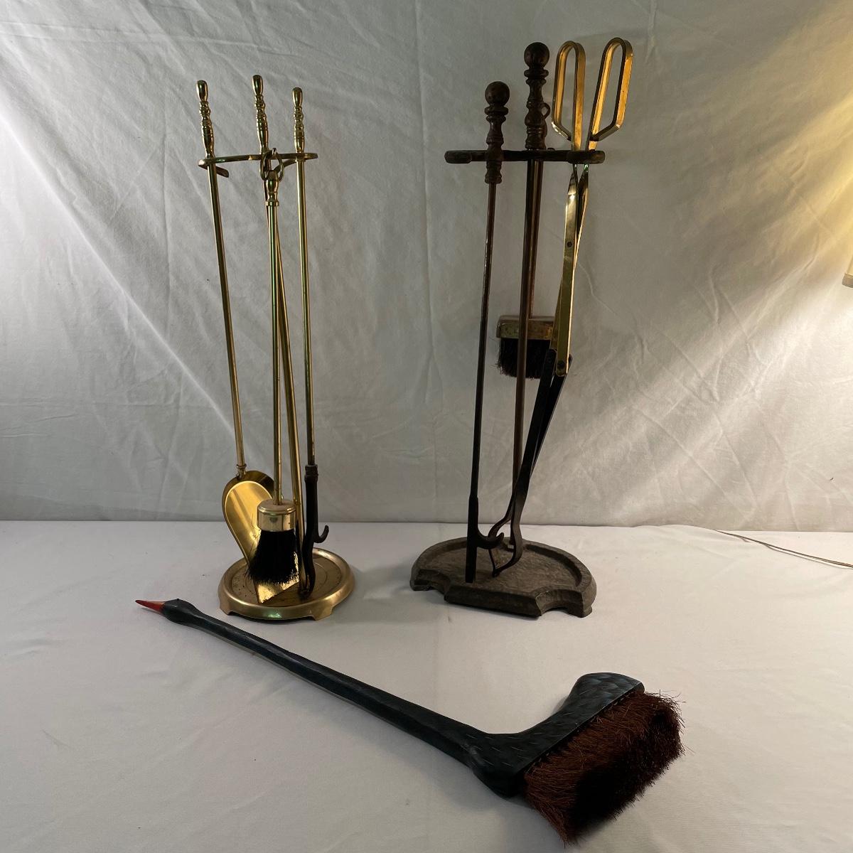 Two well made hearth tool sets with a hand painted wooden sweeper. The sweeper has a beautiful dark teal and midnight blue hues and what looks like glass eyes. All three brooms seem lightly used, if at all. The first set photographed is brass ribbed handles, the rack measures 7.5” x 27”. The second is a mix of iron and brass with a heavy iron stand with hammered features. This rack measures approximately 10.5” x 7.5” x 28.5”. See images. Local pick up only.