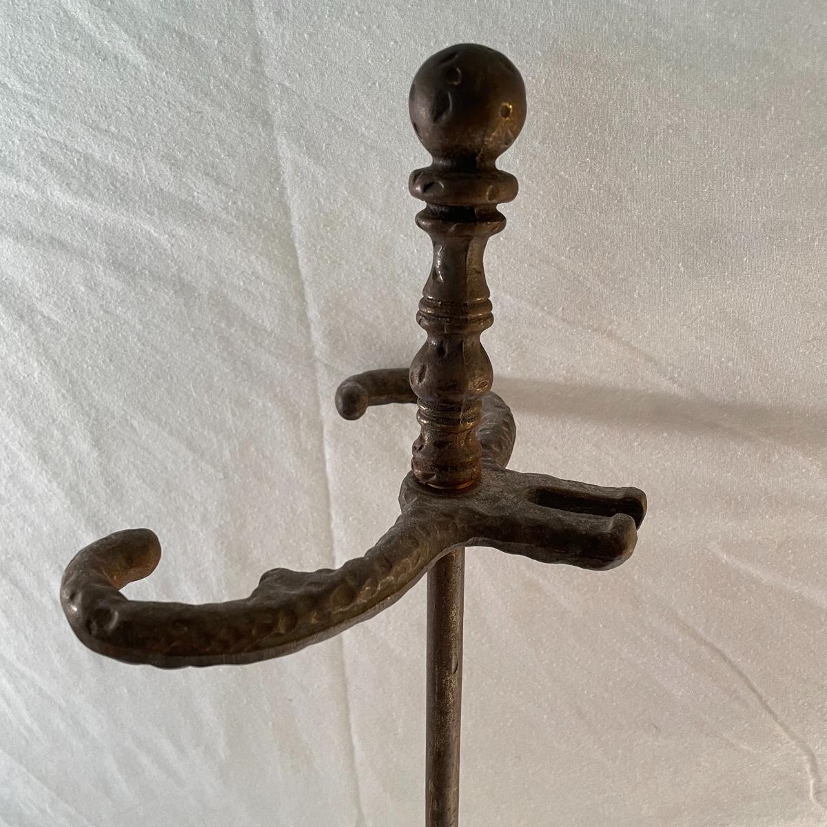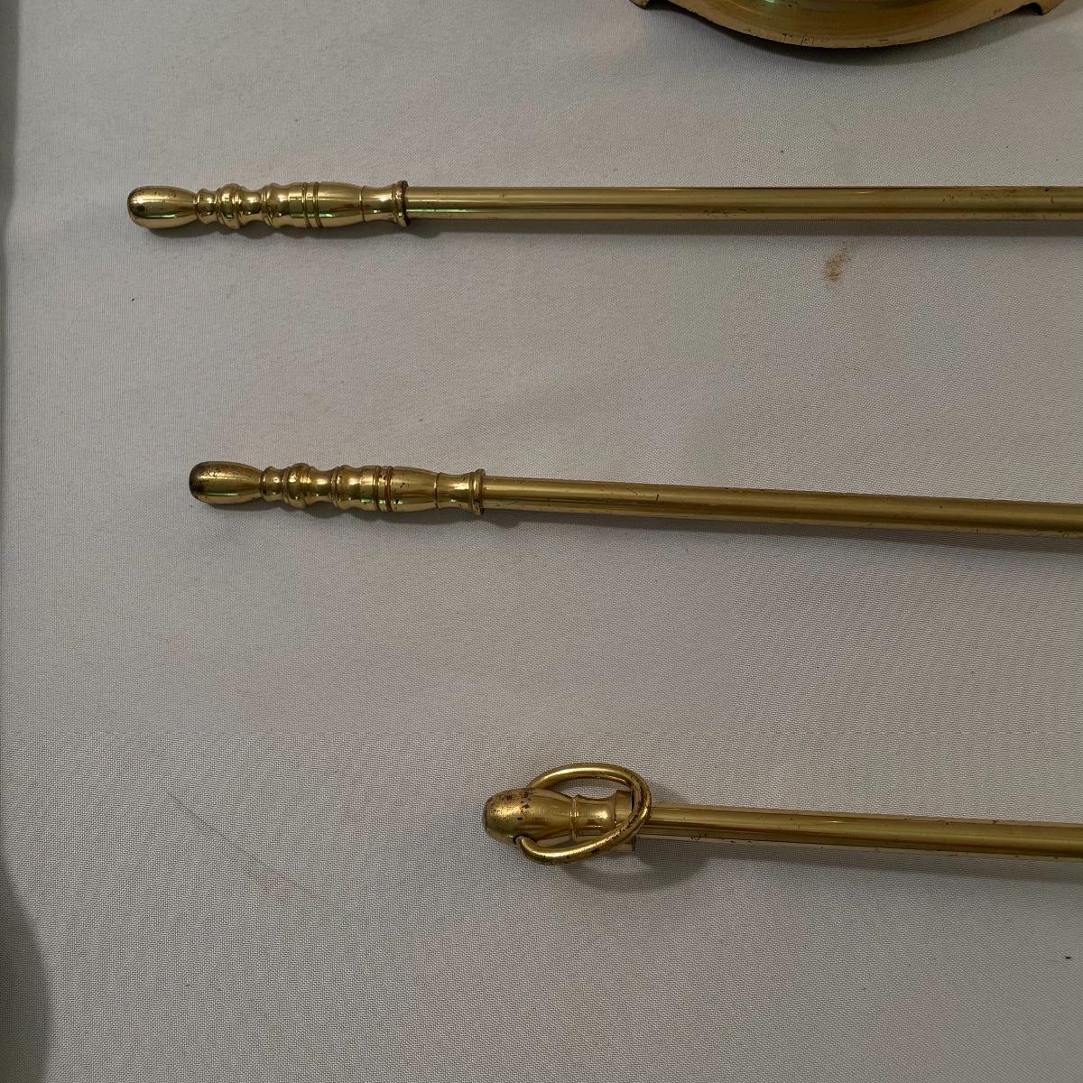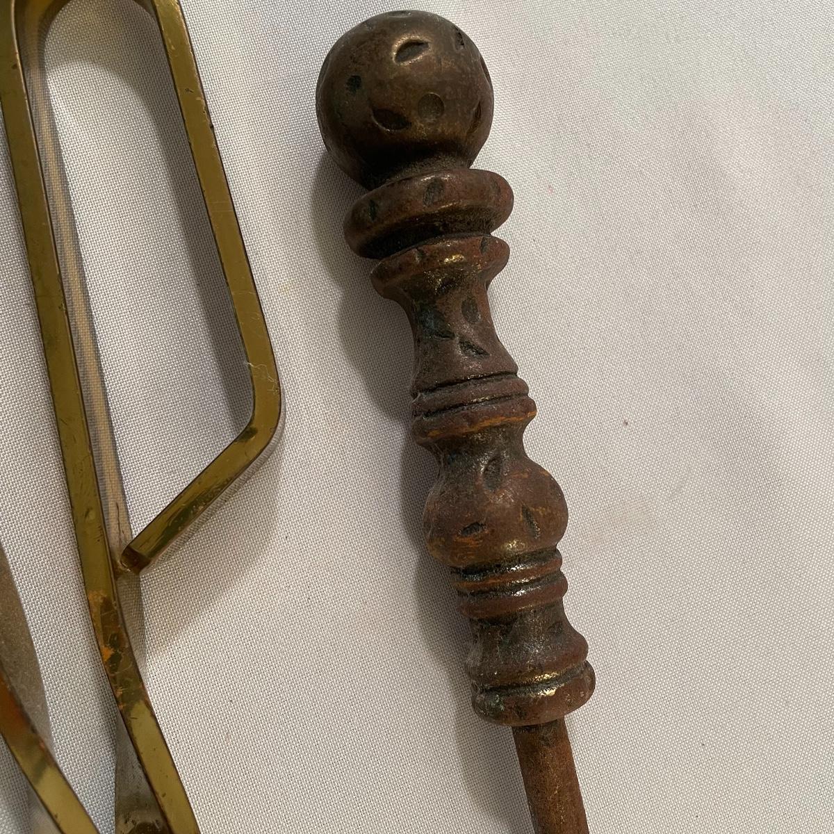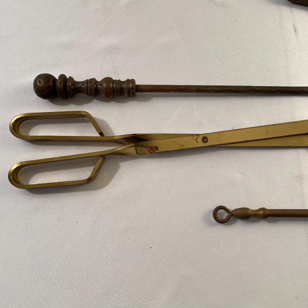 Two well made hearth tool sets with a hand painted wooden sweeper. The sweeper has a beautiful dark teal and midnight blue hues and what looks like glass eyes. All three brooms seem lightly used, if at all. The first set photographed is brass ribbed handles, the rack measures 7.5” x 27”. The second is a mix of iron and brass with a heavy iron stand with hammered features. This rack measures approximately 10.5” x 7.5” x 28.5”. See images. Local pick up only.