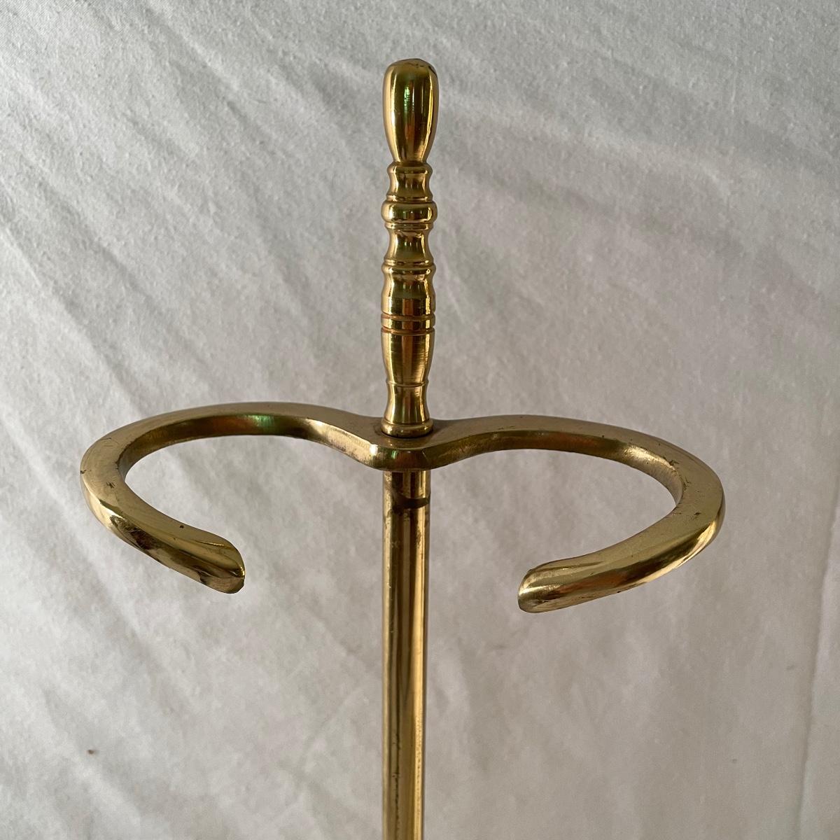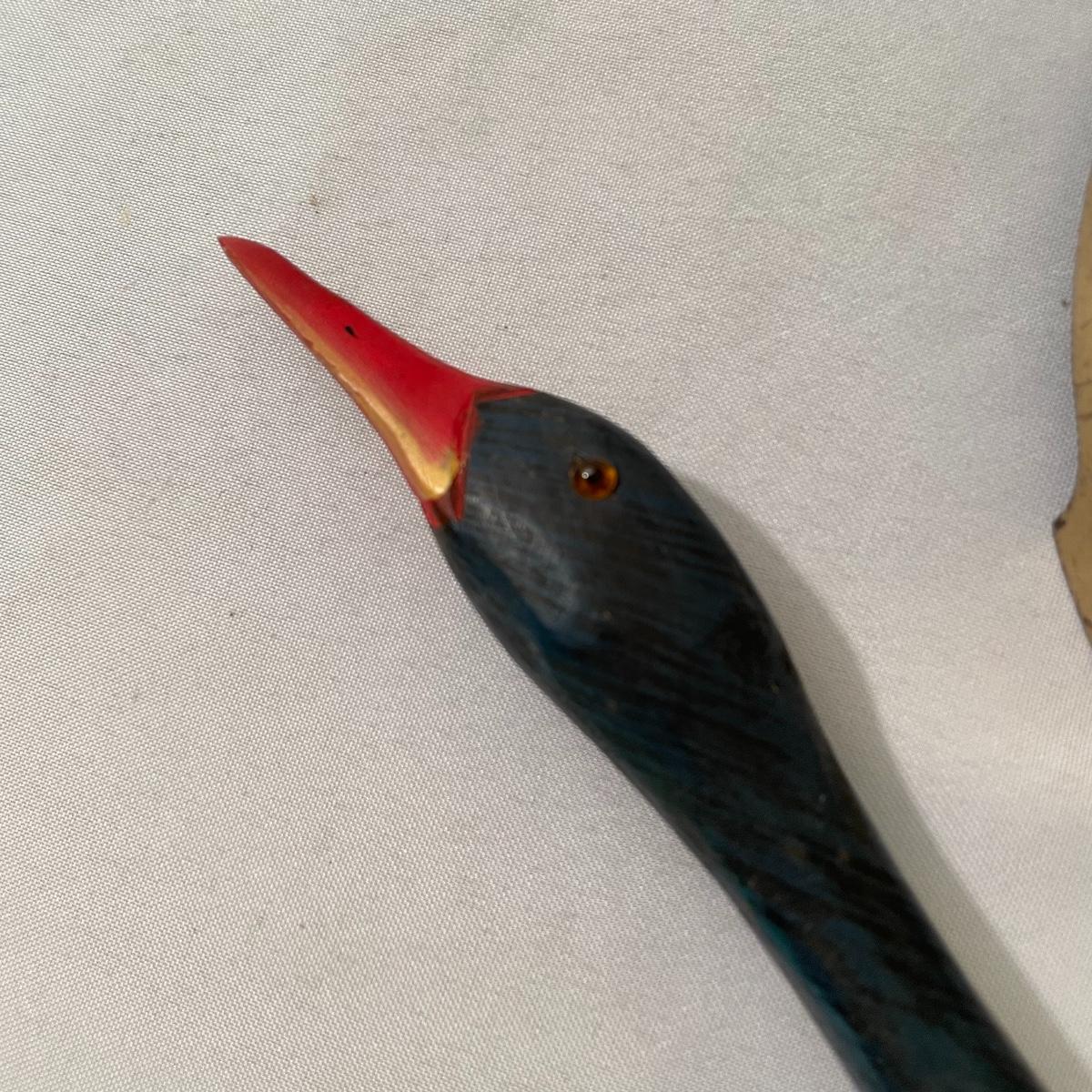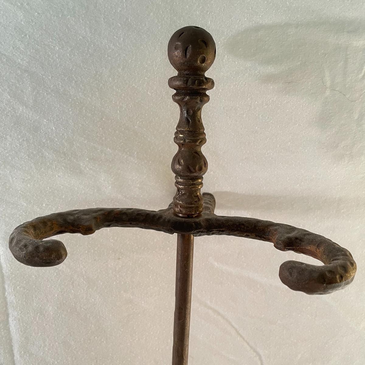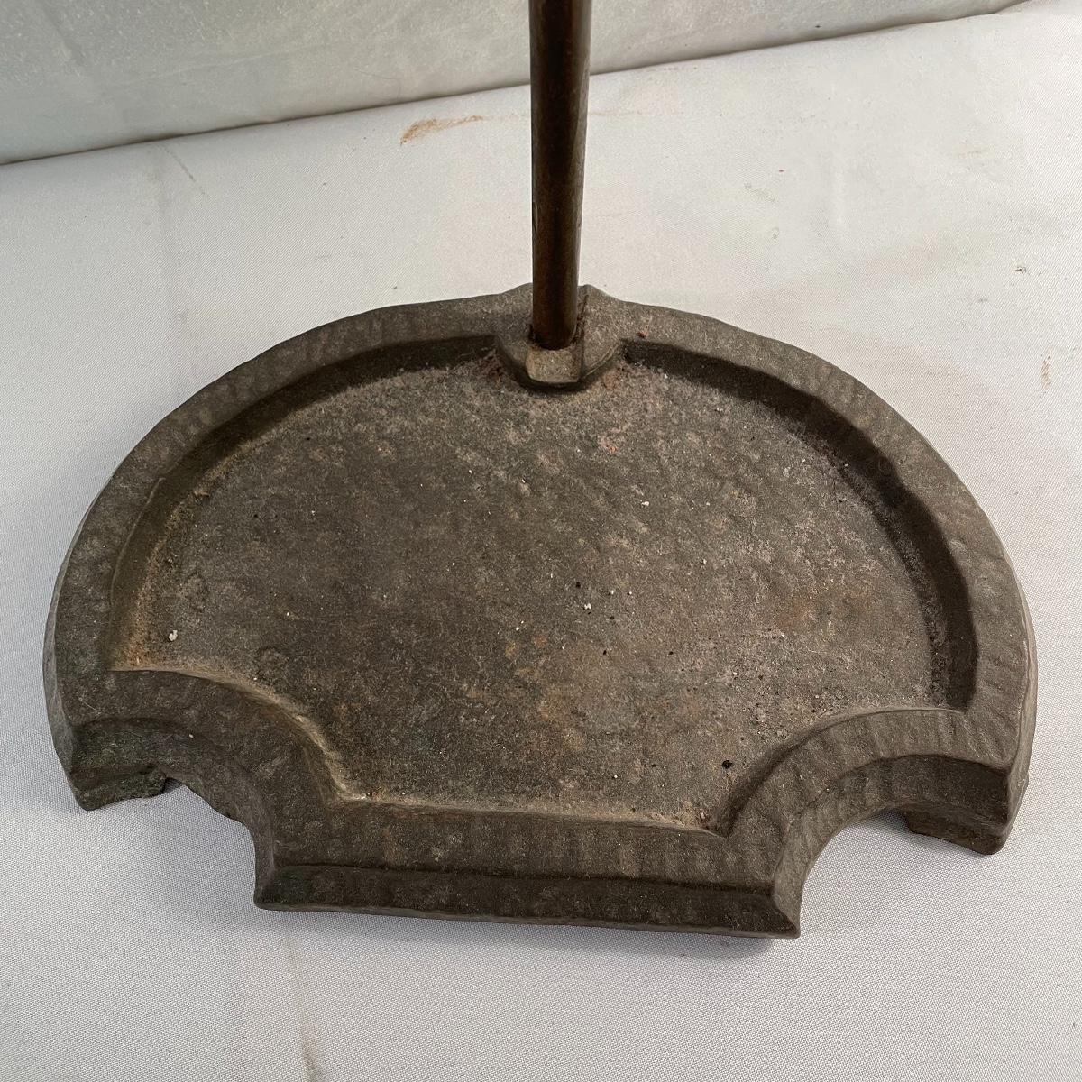 Two well made hearth tool sets with a hand painted wooden sweeper. The sweeper has a beautiful dark teal and midnight blue hues and what looks like glass eyes. All three brooms seem lightly used, if at all. The first set photographed is brass ribbed handles, the rack measures 7.5” x 27”. The second is a mix of iron and brass with a heavy iron stand with hammered features. This rack measures approximately 10.5” x 7.5” x 28.5”. See images. Local pick up only.