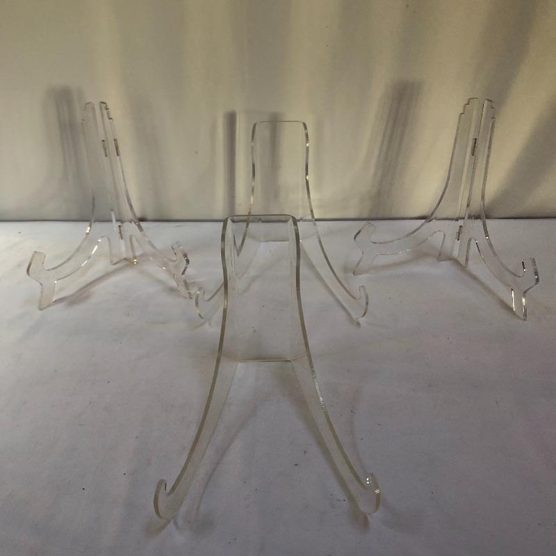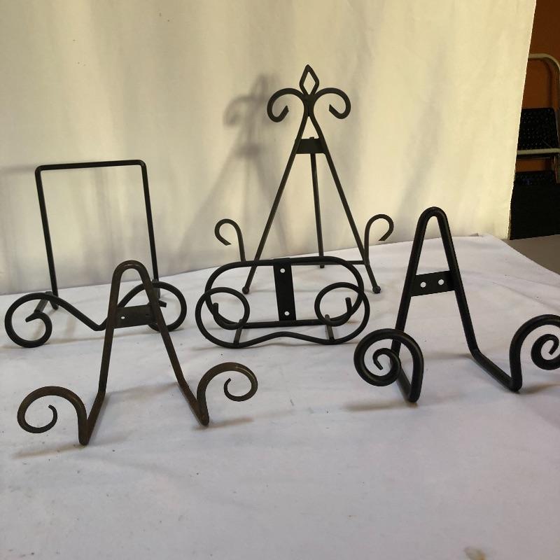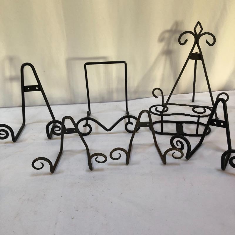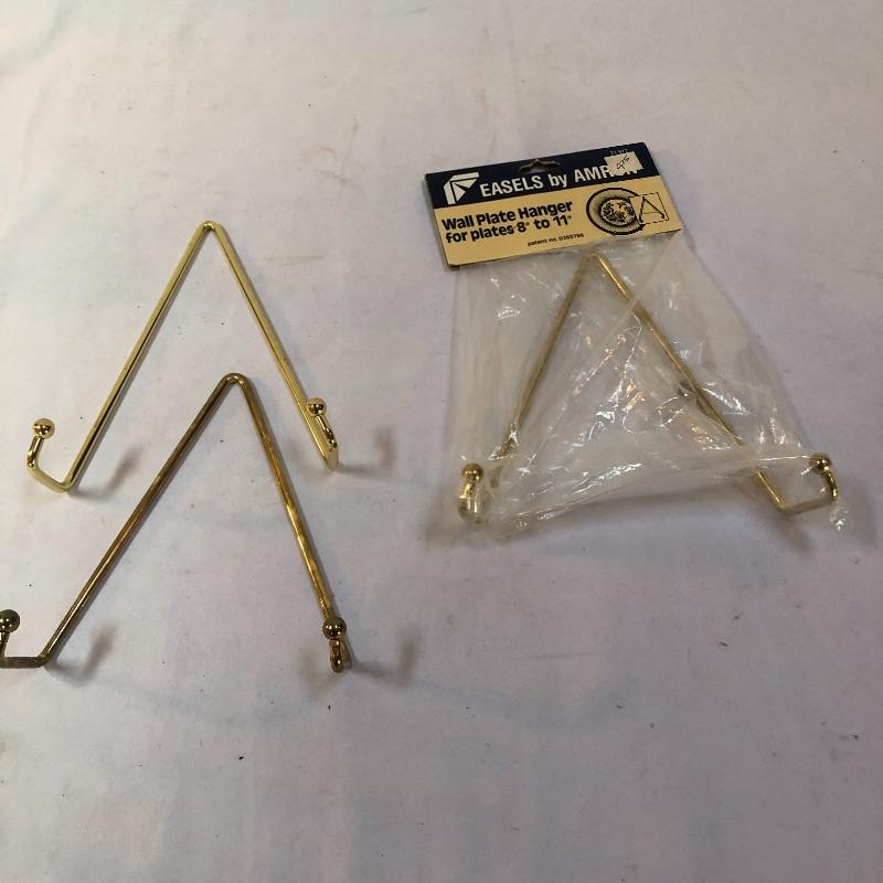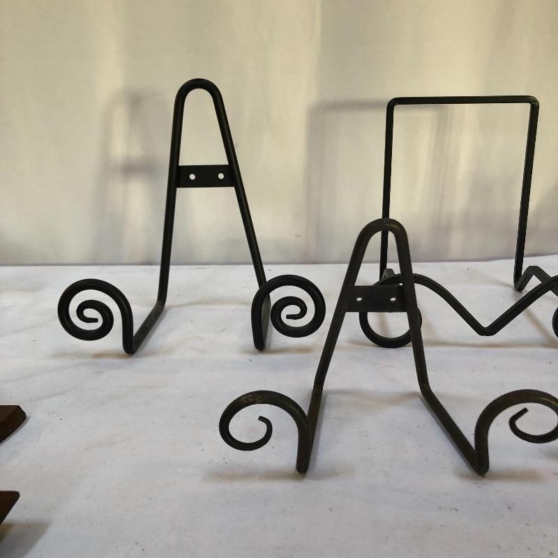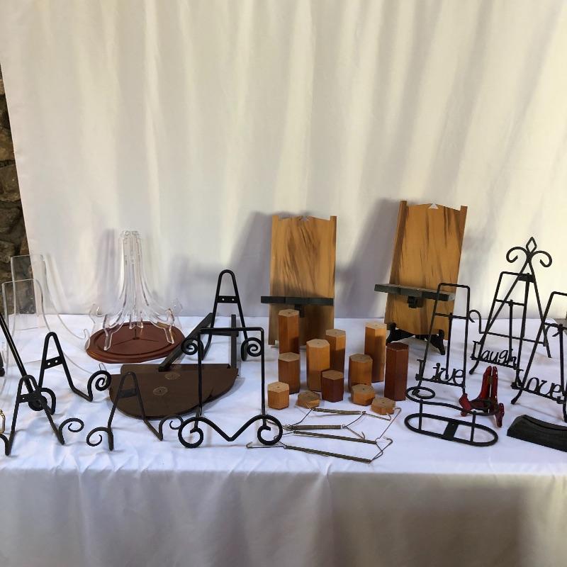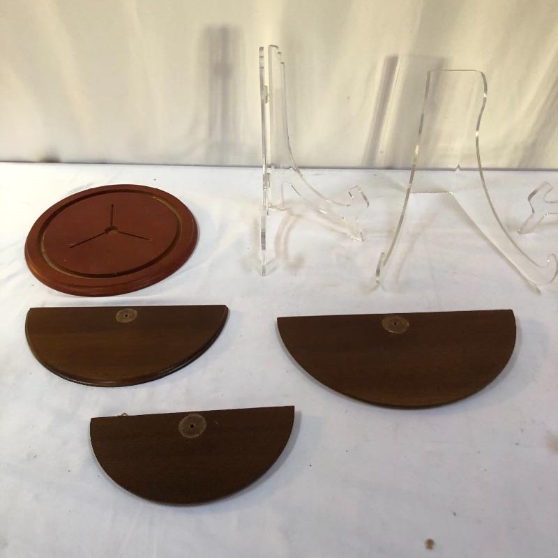 This lot contains handmade wooden display shelves, numerous plate hangers and stands. Local pick up only.