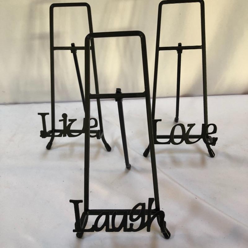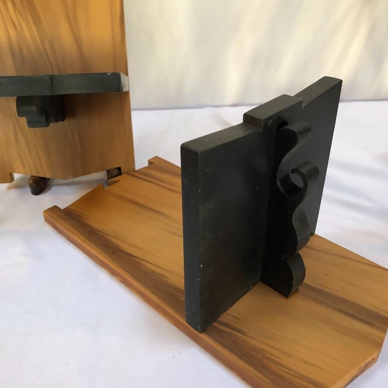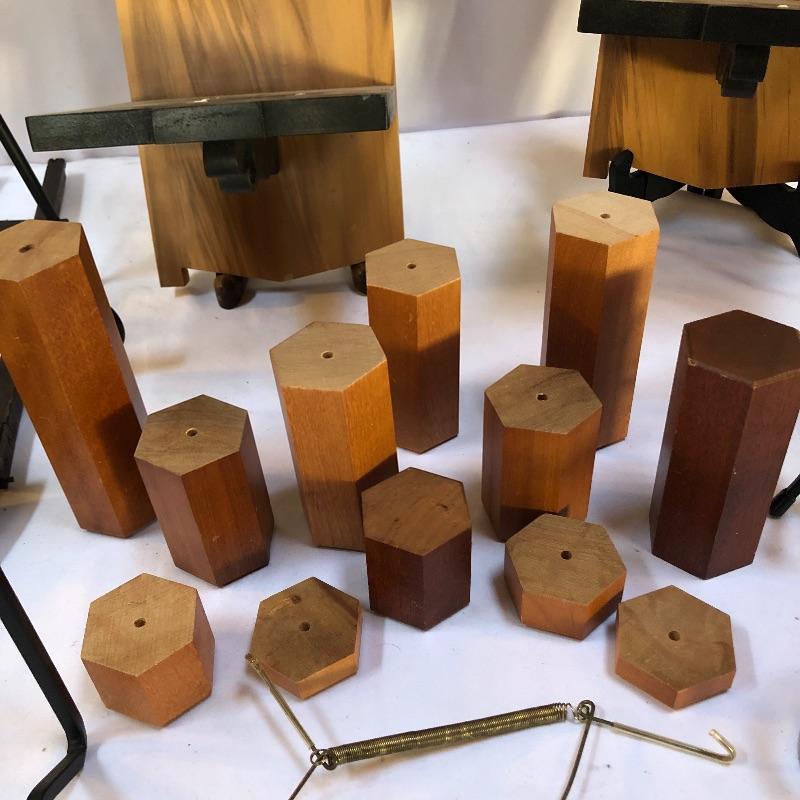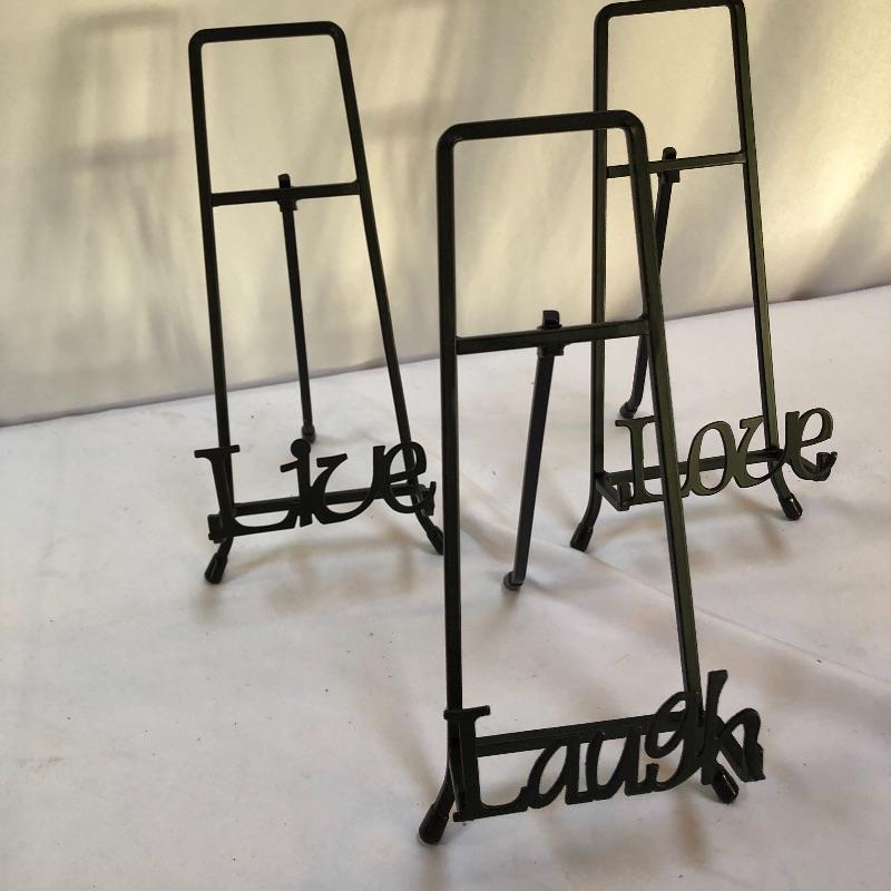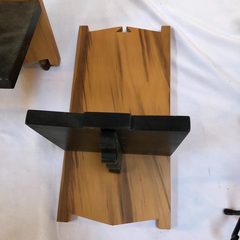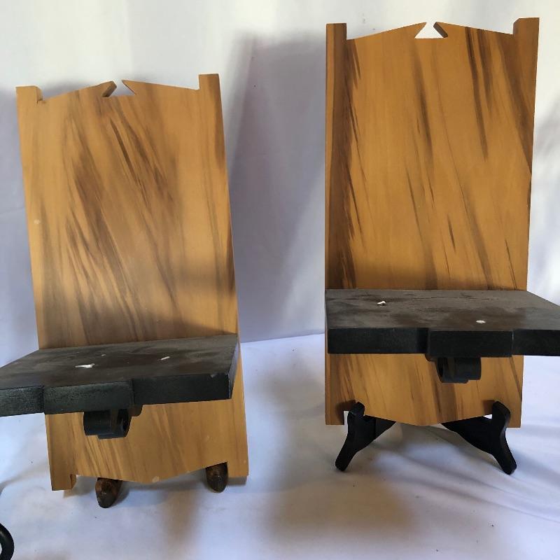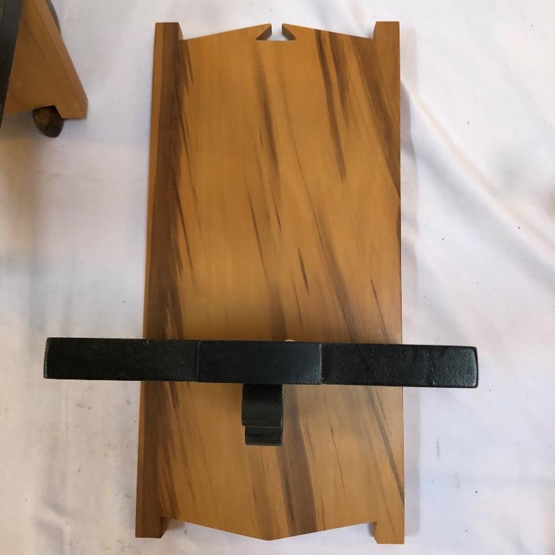 This lot contains handmade wooden display shelves, numerous plate hangers and stands. Local pick up only.