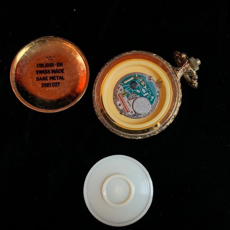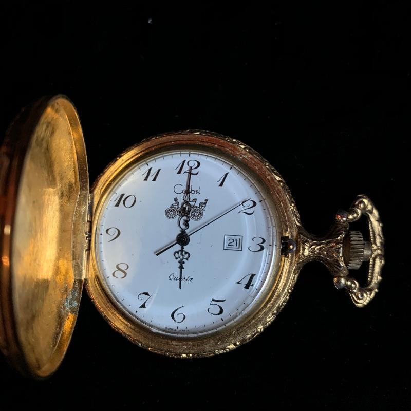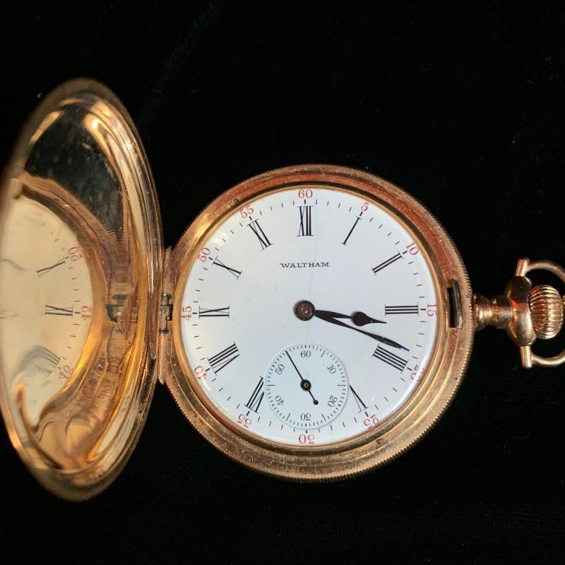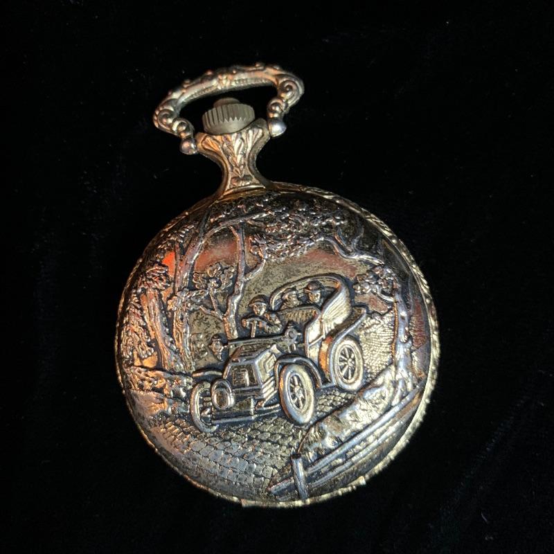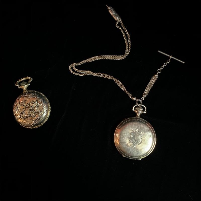One 14k pocket watch with chain by Waltham. The casing has a few dents and the face is scratched (see pix) but winder works fine. The second one is a Quartz newer style with a lovely antique car embellishment. The winder moves but was not moving the hands when tried. Starting bid based on gold melt value. Shipping available.