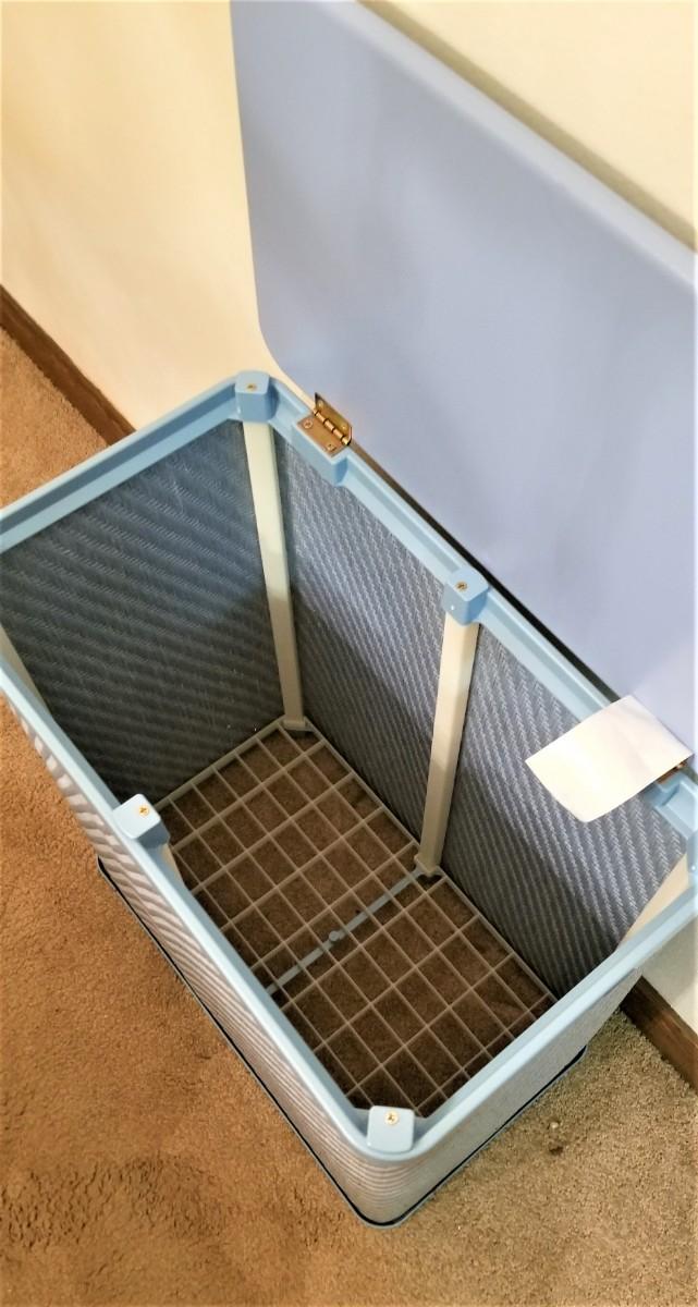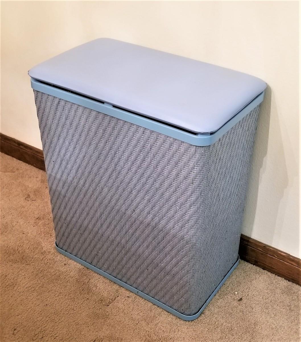 1950's/1960's vintage blue basket clothes hamper - padded top - 19.5" across, 11.5" deep, 22" tall. Looks almost like new. A great piece for your Mid-Century bathroom.