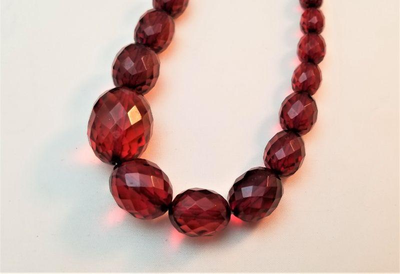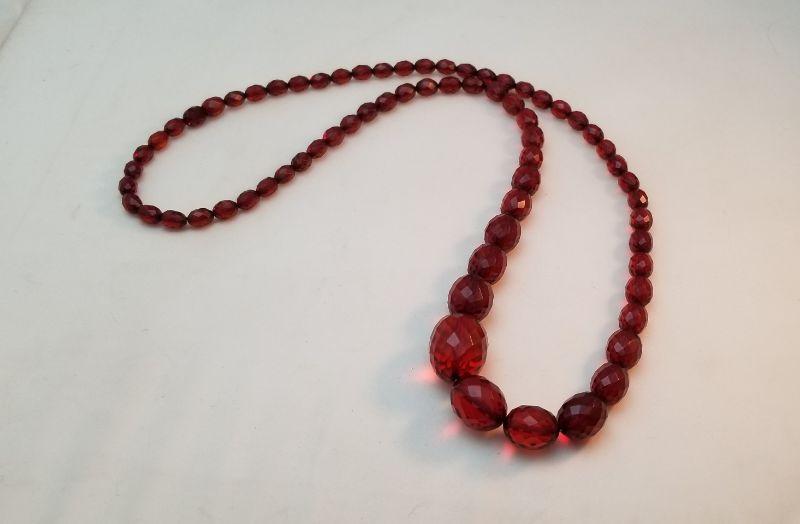 Super nice faceted vintage Cherry Amber necklace. Concealed Barrel closure. Measures 30 inches long when fully extended. Very nice condition.