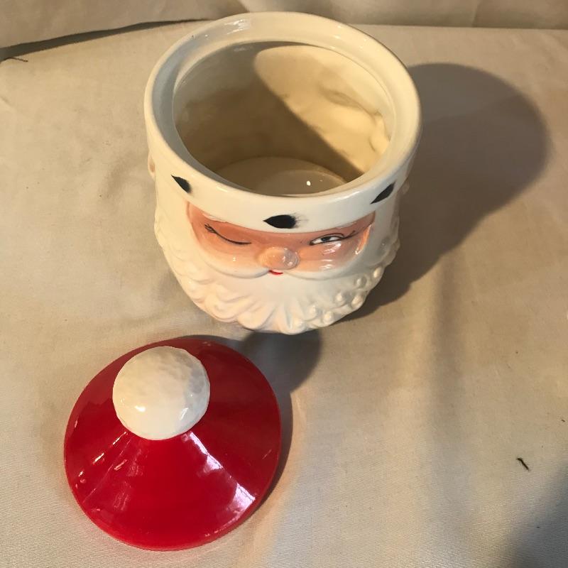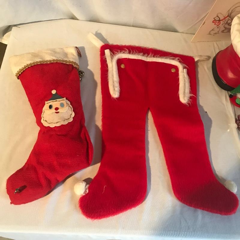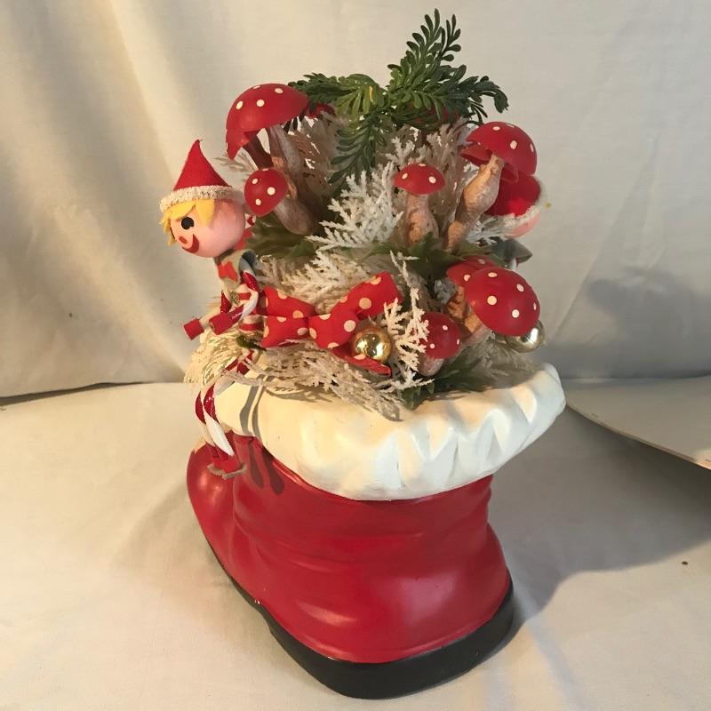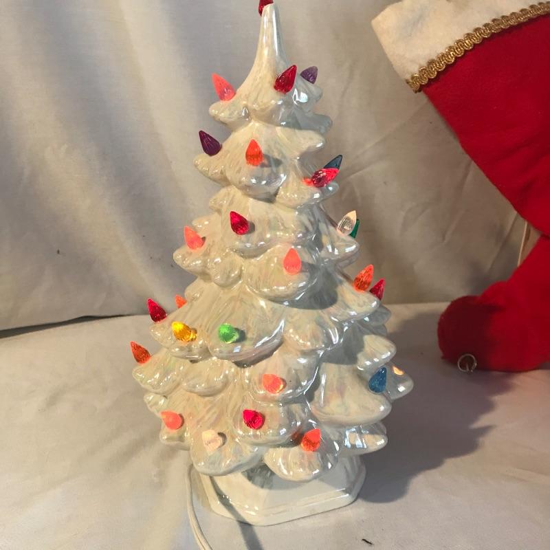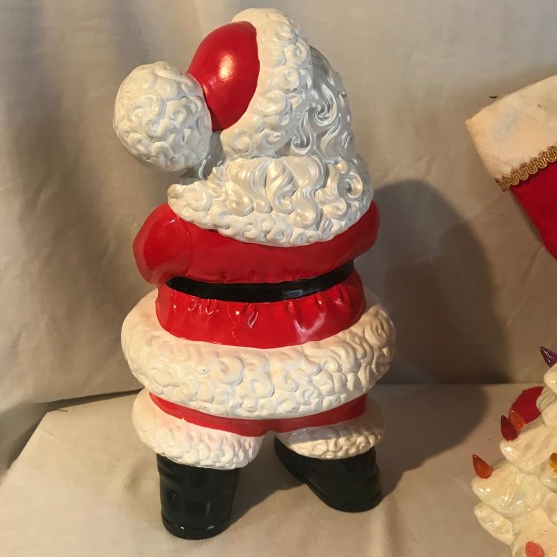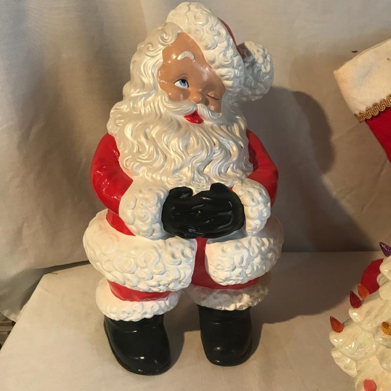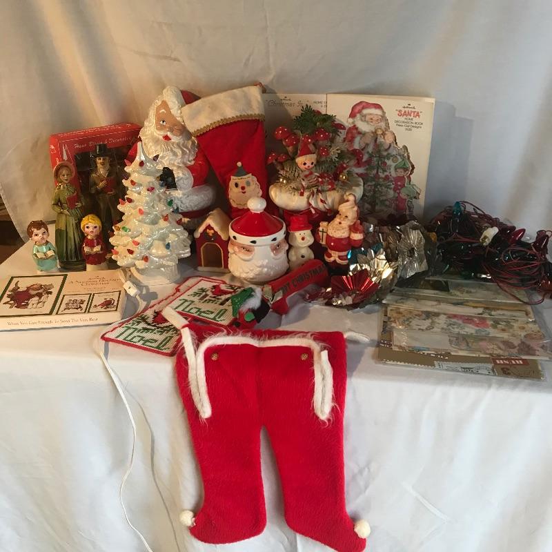 Fantastic lot full of charming Christmas decor of the past. A rare iridescent white ceramic Christmas tree, (tree is missing 3 “bulbs” and has a chip on the very top, see photos), a musical stocking and spinning musical Santa cookie jar both playing Jingle Bells. Three old-time candles, four Caffco carolers, a 13” tall groovy mushroom Santa boot and a newer winking Santa. It wouldn’t be a vintage Christmas without some old colored lights with foil plates,Norman Rockwell cards and gift wrap like Hollie Hobby. See photos for all the joy in this lot. No shipping.
