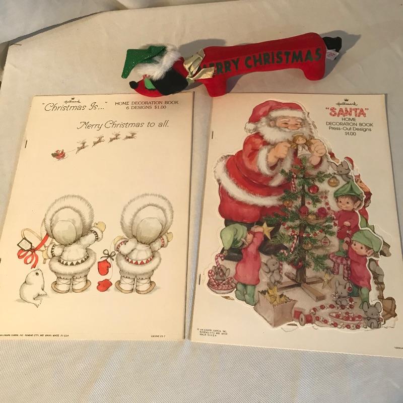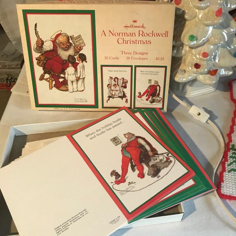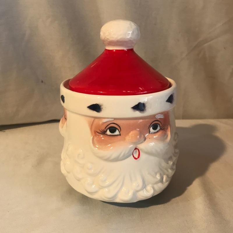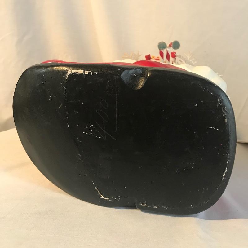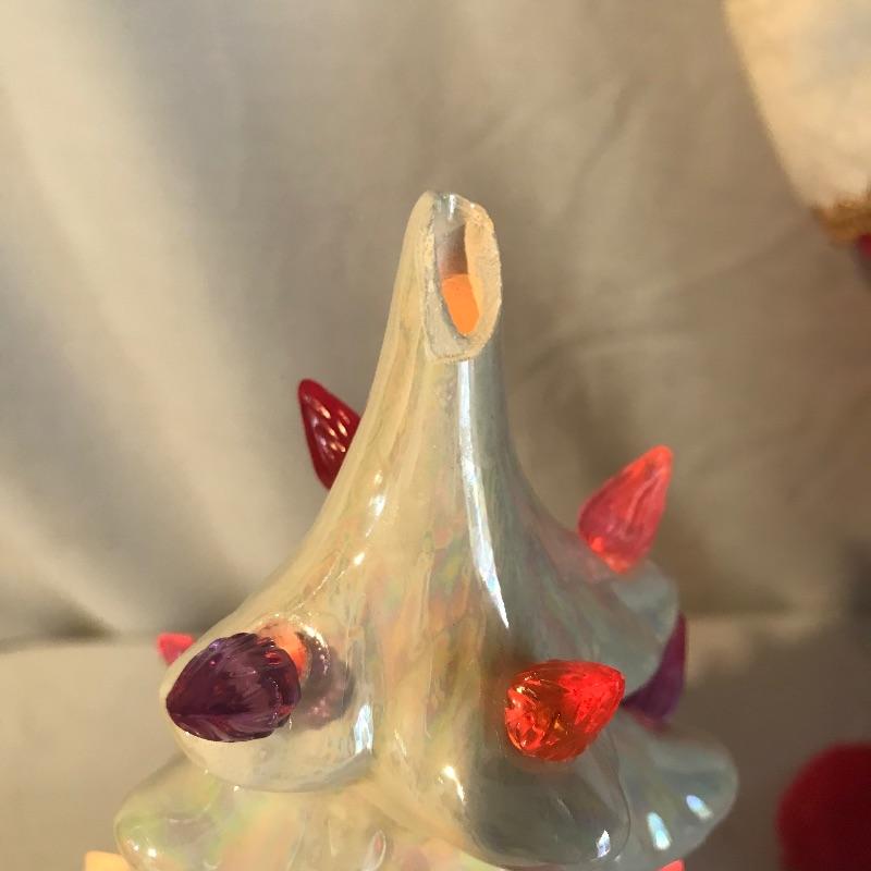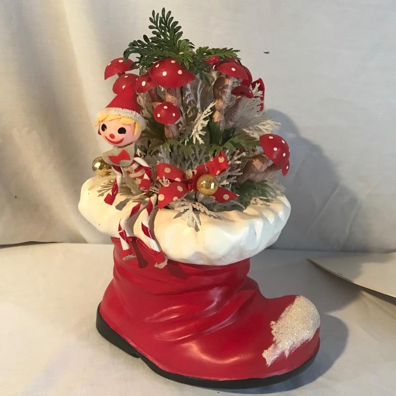 Fantastic lot full of charming Christmas decor of the past. A rare iridescent white ceramic Christmas tree, (tree is missing 3 “bulbs” and has a chip on the very top, see photos), a musical stocking and spinning musical Santa cookie jar both playing Jingle Bells. Three old-time candles, four Caffco carolers, a 13” tall groovy mushroom Santa boot and a newer winking Santa. It wouldn’t be a vintage Christmas without some old colored lights with foil plates,Norman Rockwell cards and gift wrap like Hollie Hobby. See photos for all the joy in this lot. No shipping.