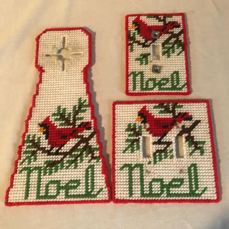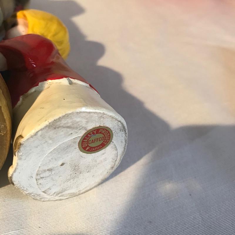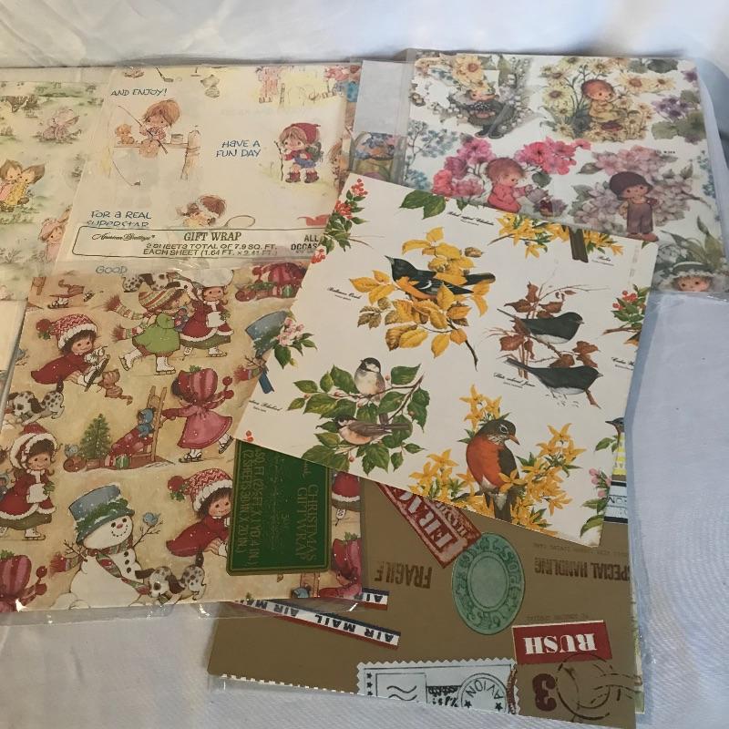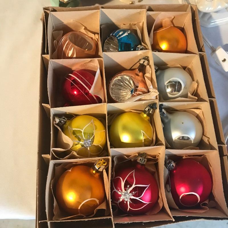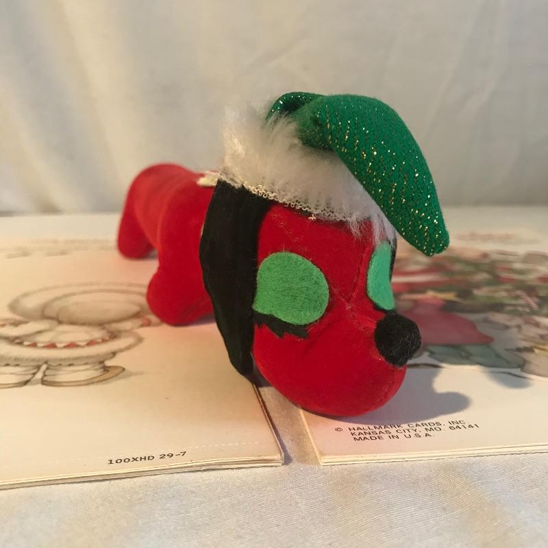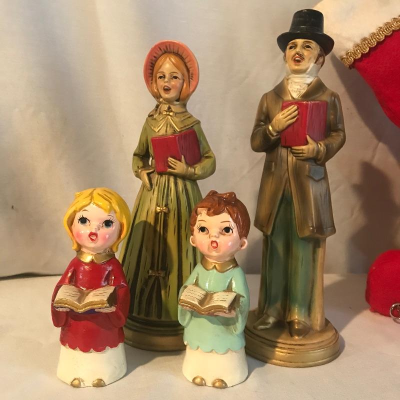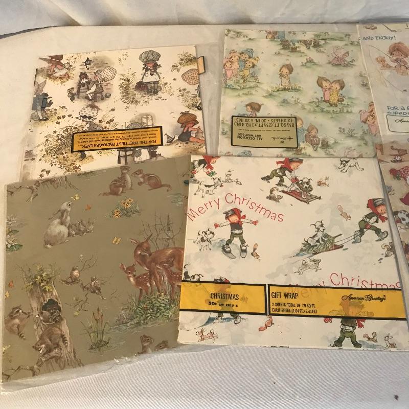 Fantastic lot full of charming Christmas decor of the past. A rare iridescent white ceramic Christmas tree, (tree is missing 3 “bulbs” and has a chip on the very top, see photos), a musical stocking and spinning musical Santa cookie jar both playing Jingle Bells. Three old-time candles, four Caffco carolers, a 13” tall groovy mushroom Santa boot and a newer winking Santa. It wouldn’t be a vintage Christmas without some old colored lights with foil plates,Norman Rockwell cards and gift wrap like Hollie Hobby. See photos for all the joy in this lot. No shipping.