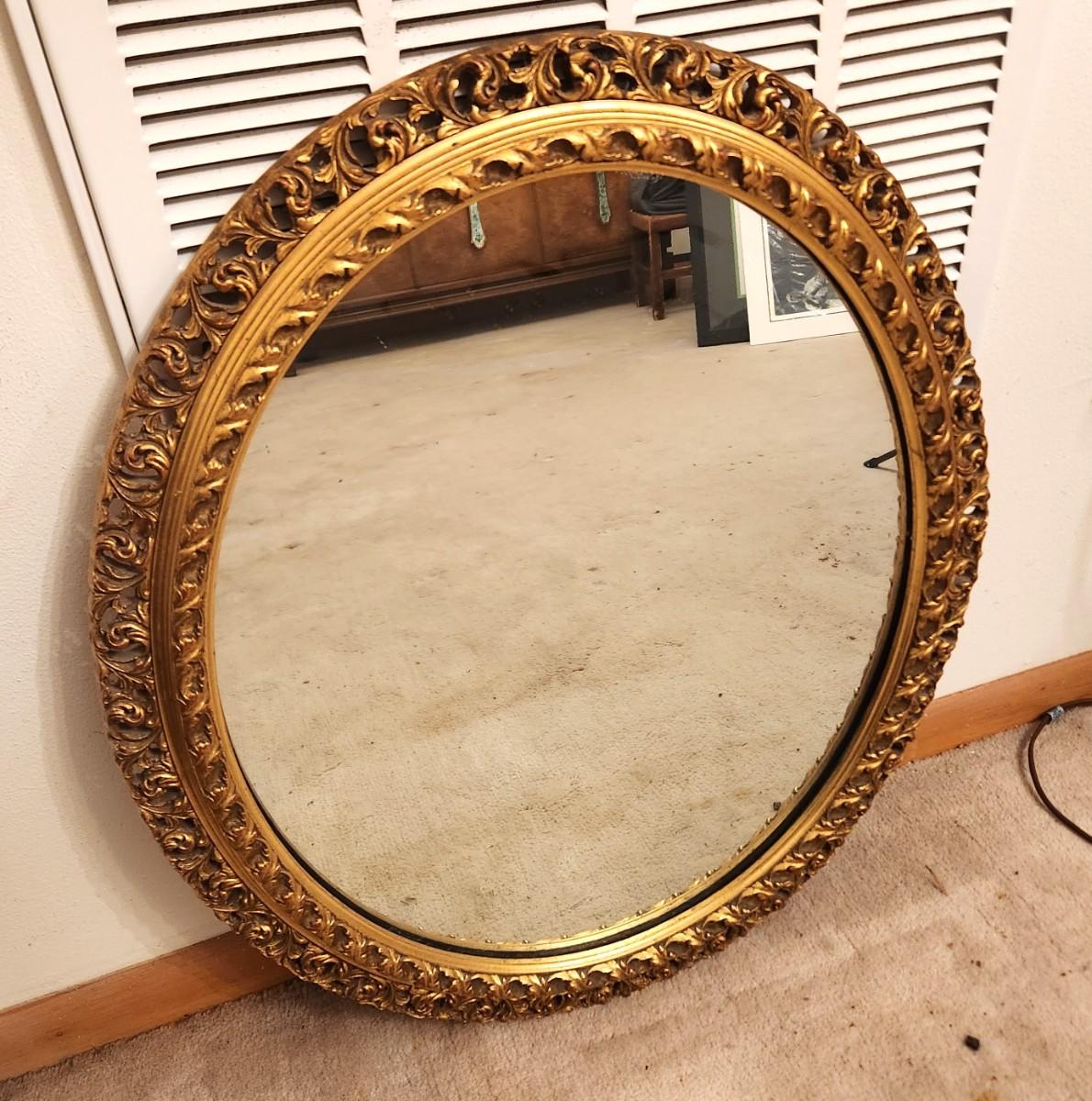 Nice vintage Gesso-frame round wall mirror - 28" x 24.5". Good condition.