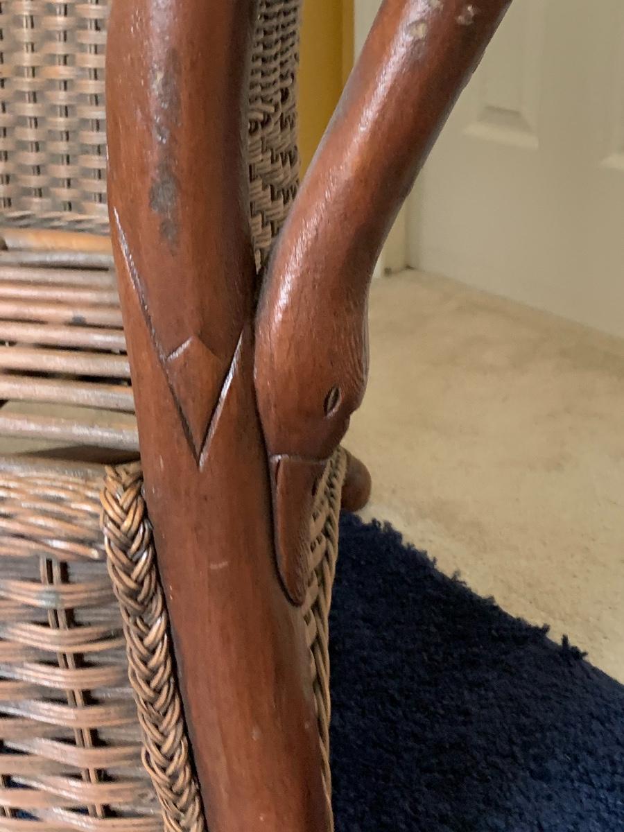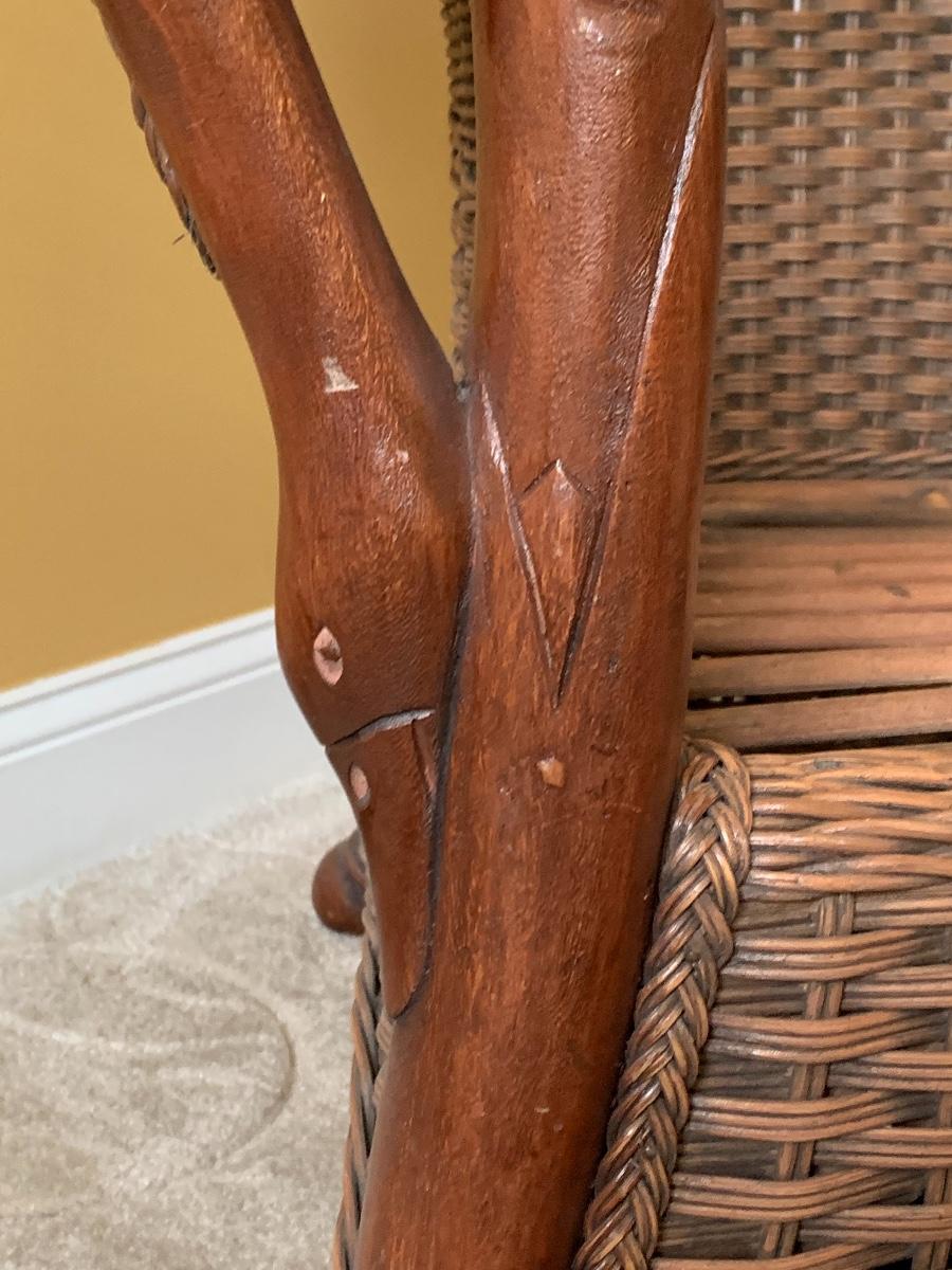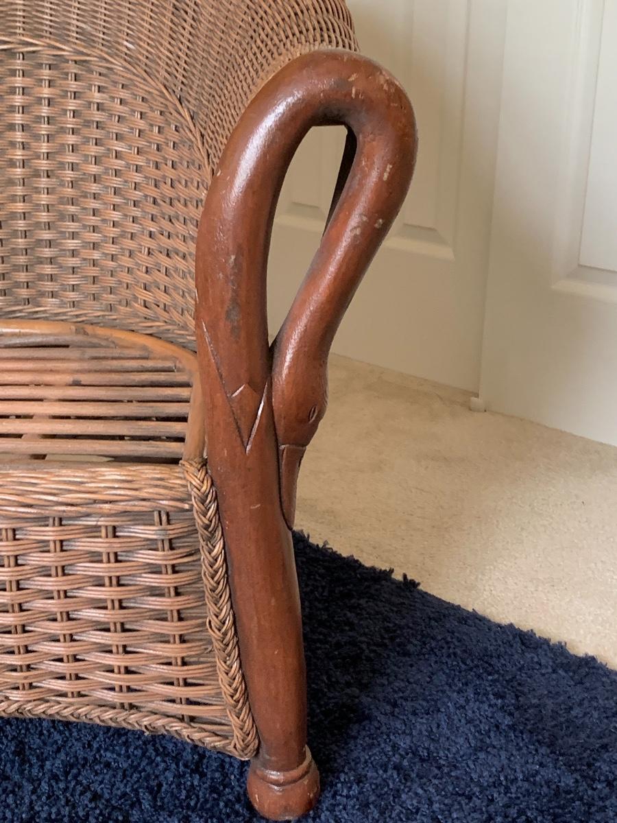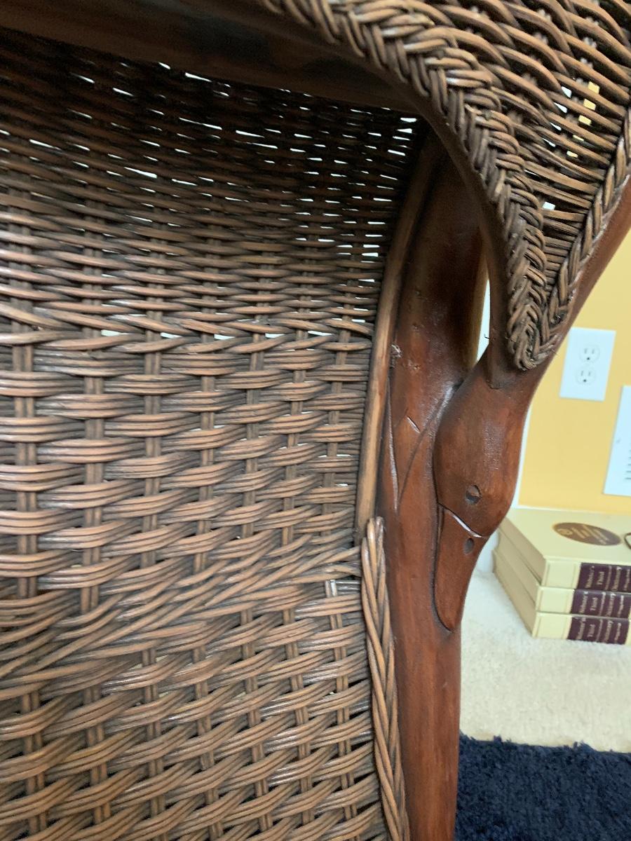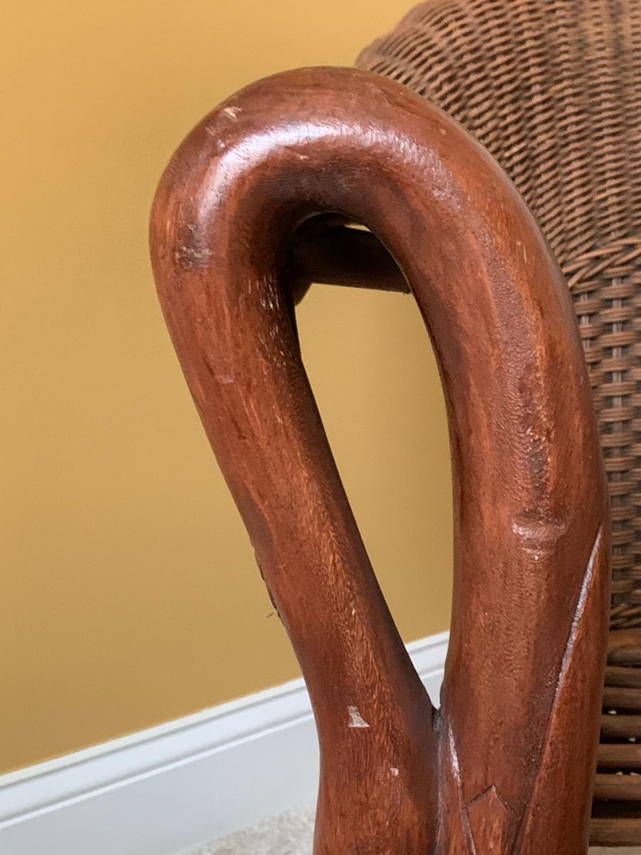 Wicker chair with carved geese heads on the arms, seat cushion & pillow are included (35 x 30 x 33).
