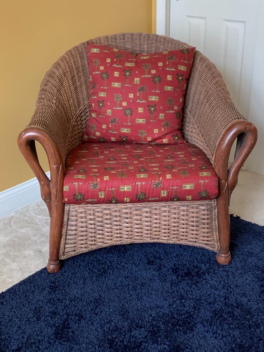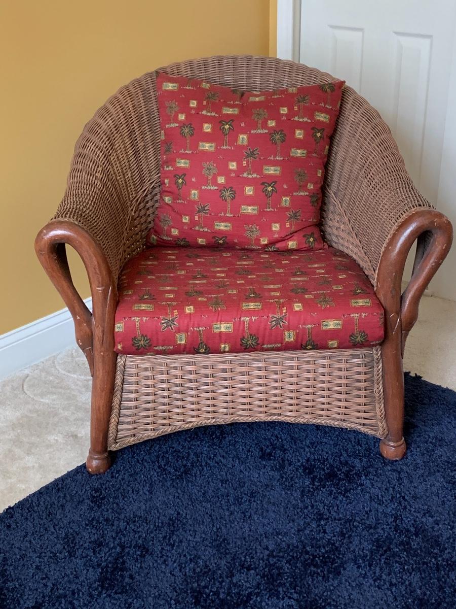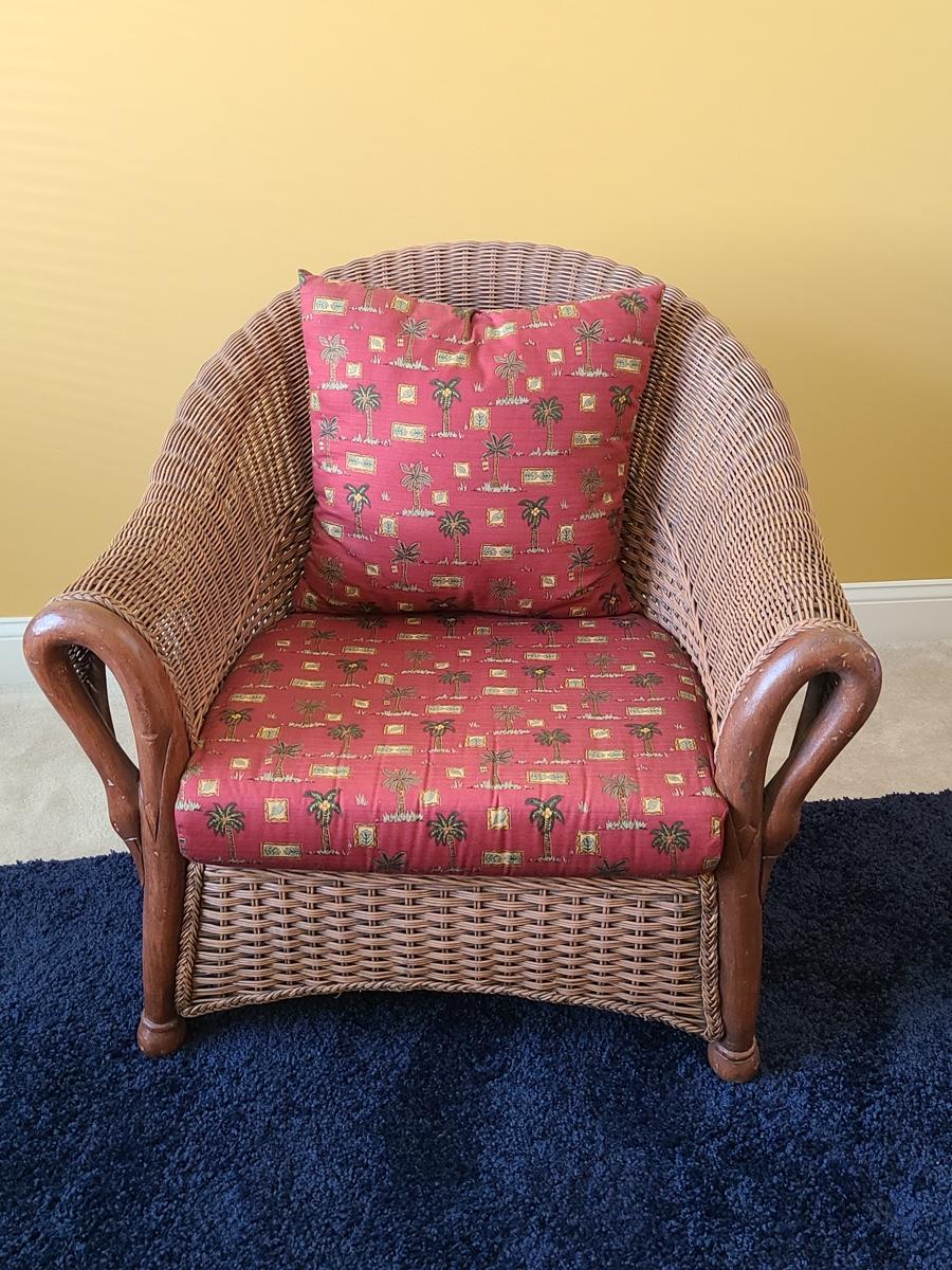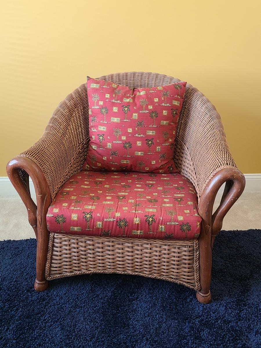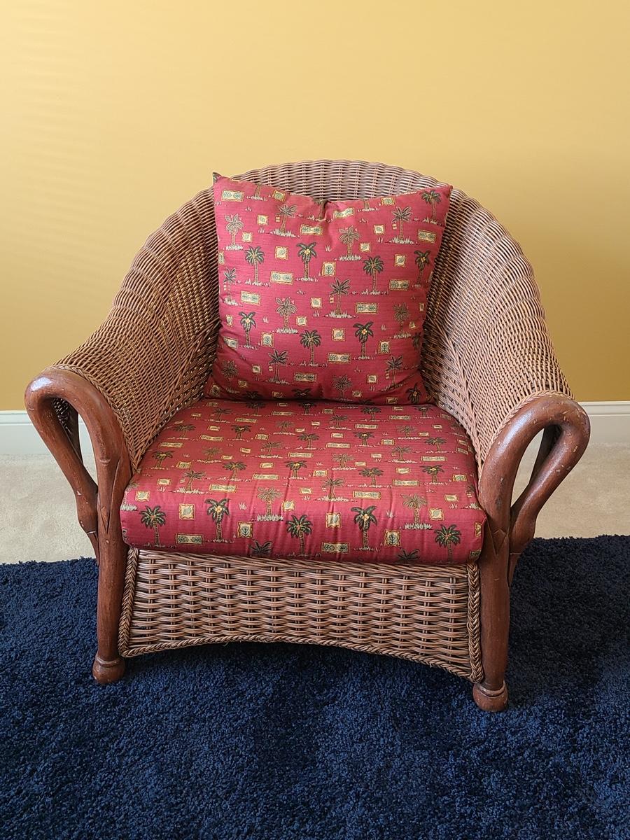 Wicker chair with carved geese heads on the arms, seat cushion & pillow are included (35 x 30 x 33).
