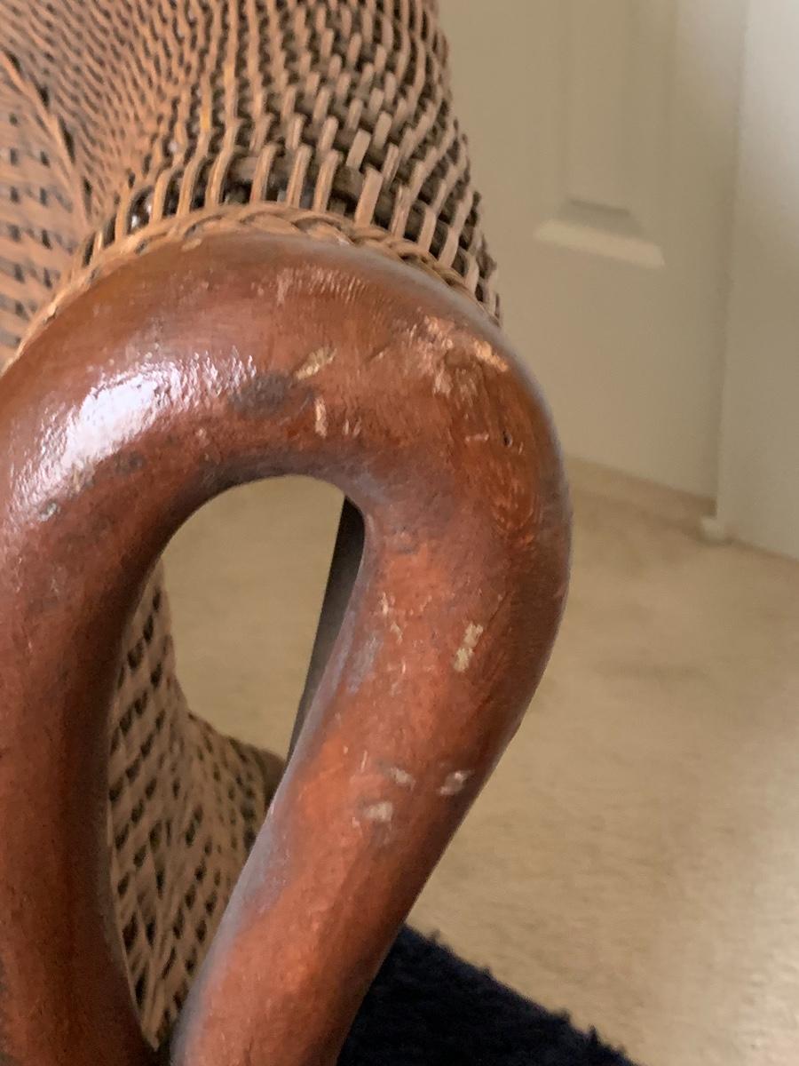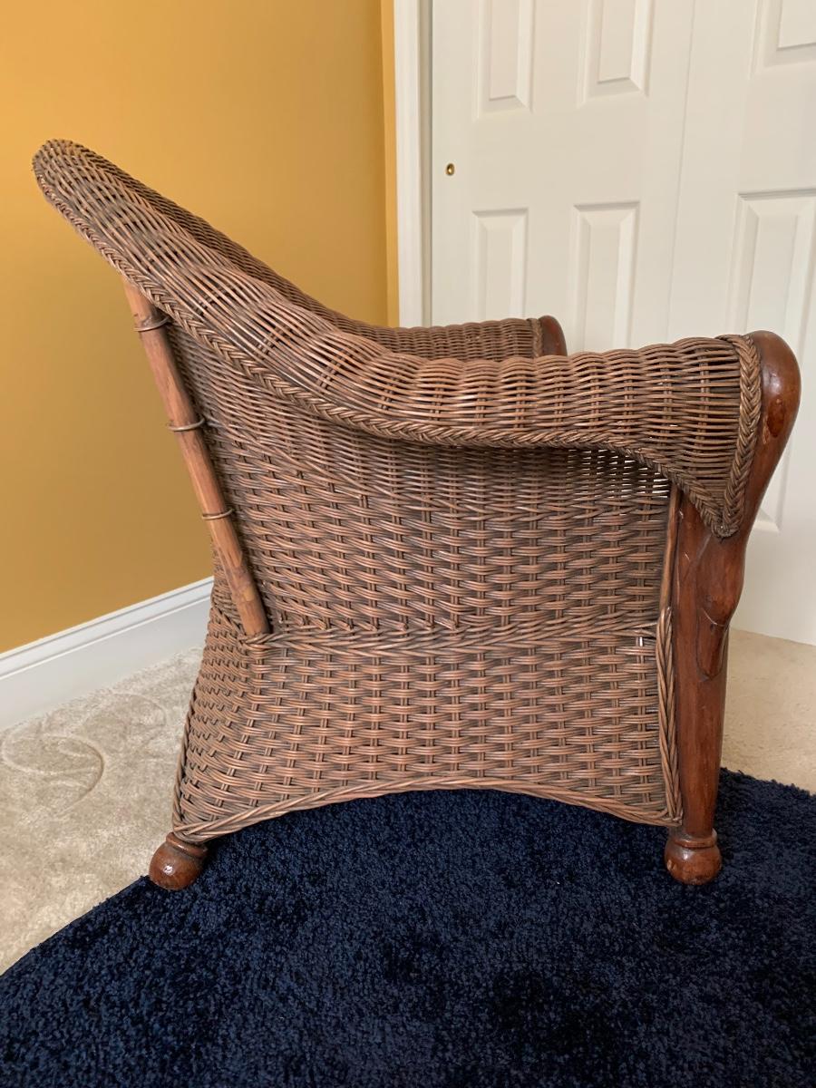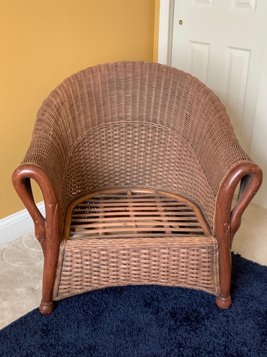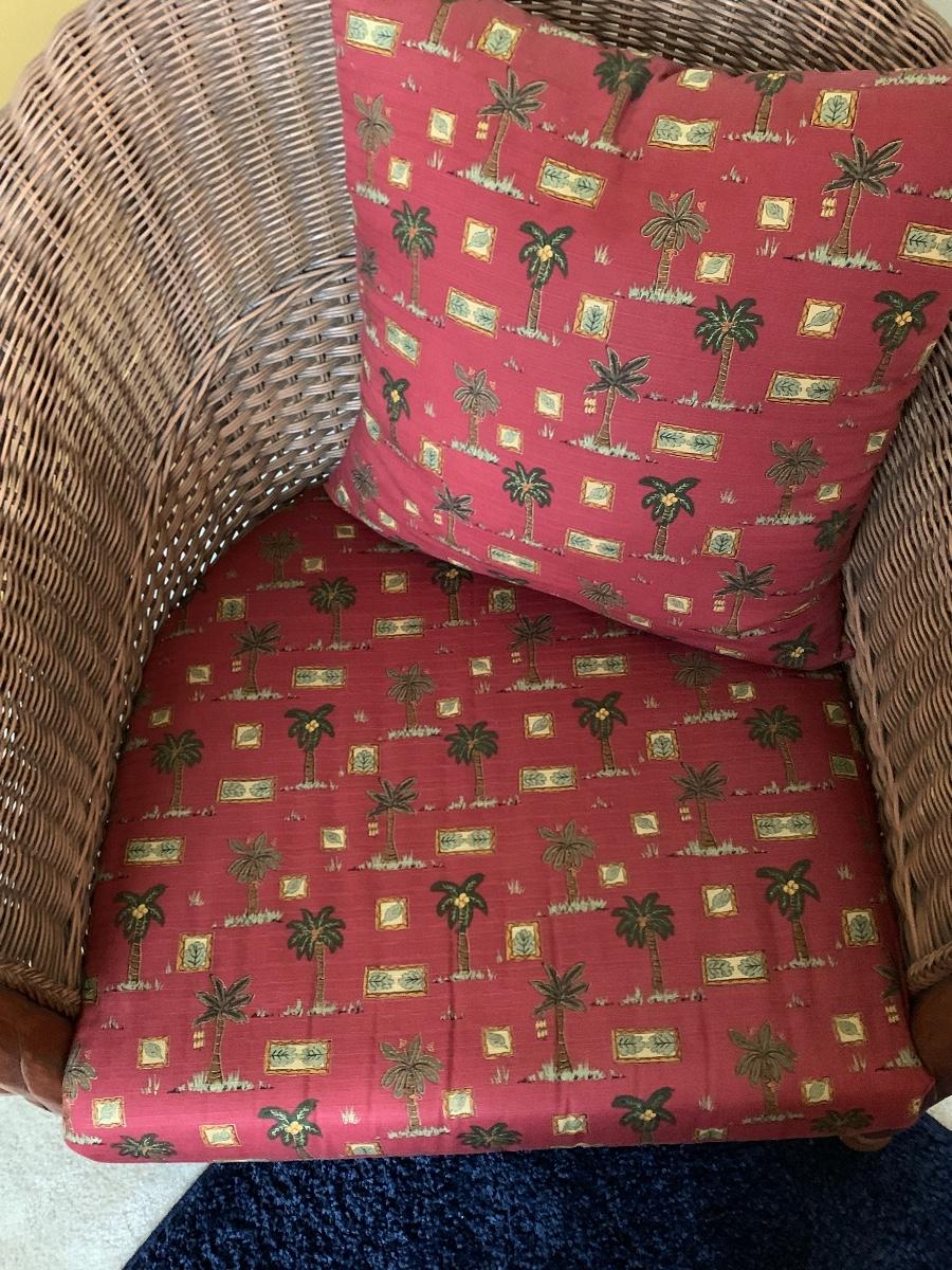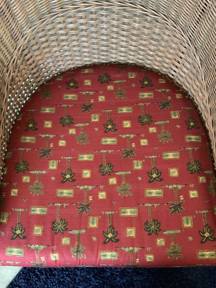 Wicker chair with carved geese heads on the arms, seat cushion & pillow are included (35 x 30 x 33).