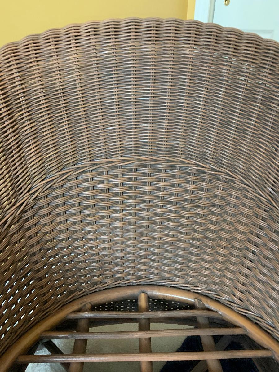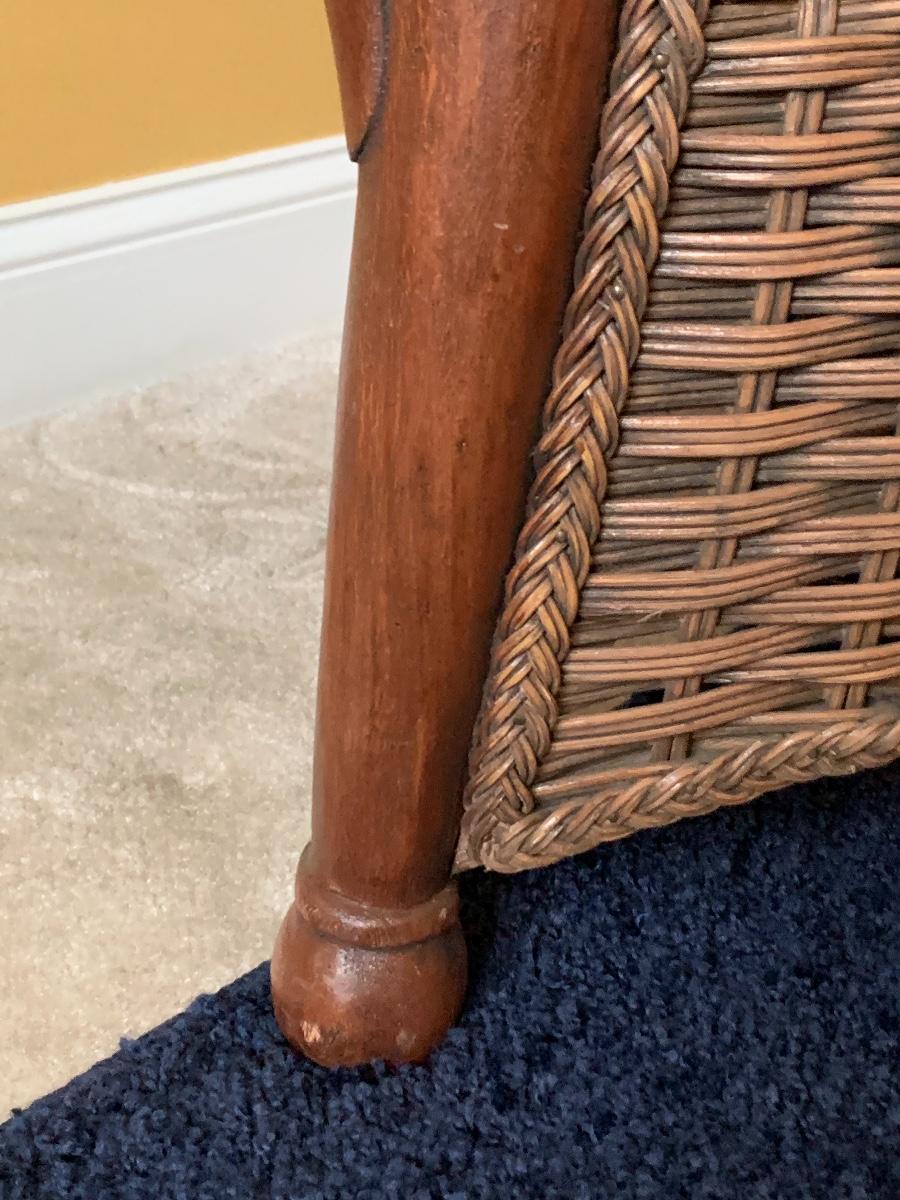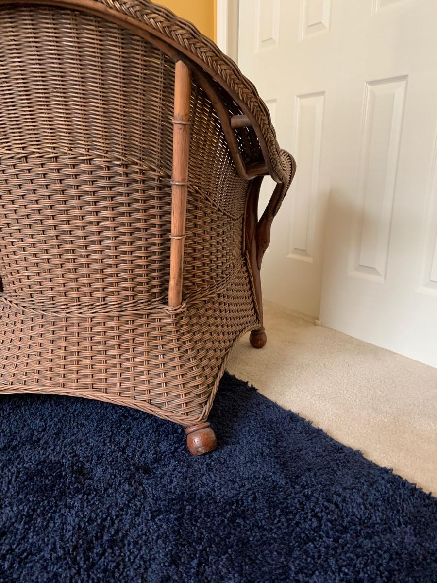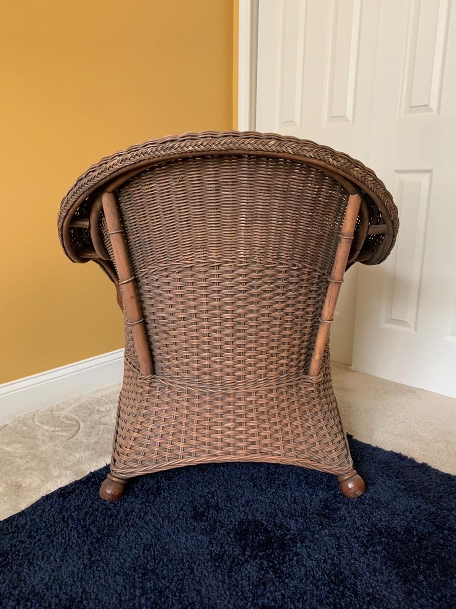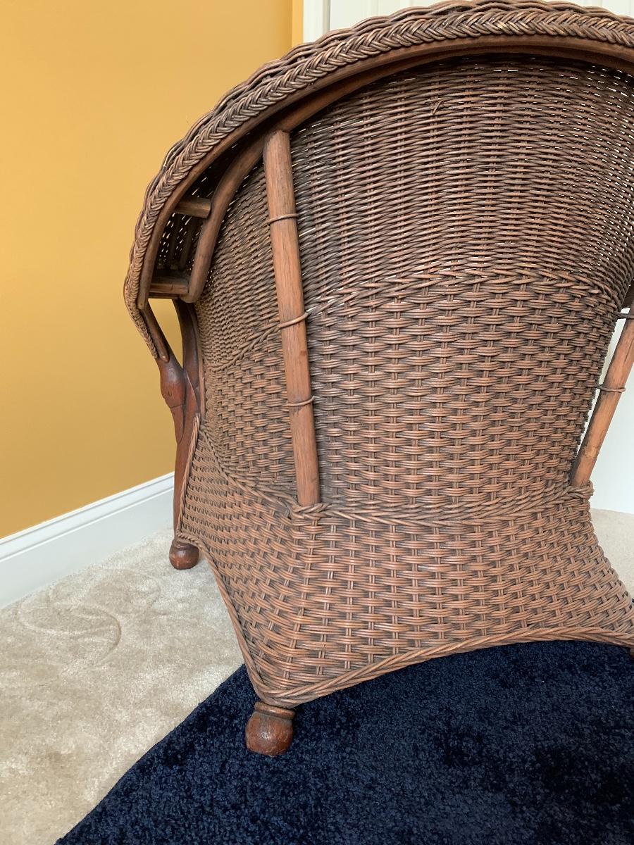 Wicker chair with carved geese heads on the arms, seat cushion & pillow are included (35 x 30 x 33).