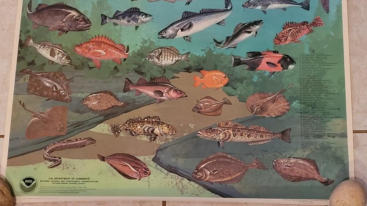 Vintage 1970's era chart / color poster - Marine Fishes of the North Pacific . Produced and distributed by the National Oceanic and Atmospheric Administration (NOAA), National Marine Fisheries , of the U. S. Department of Commerce . This color chart is printed on thick-stock paper with a thin waxy / plastic coating / sheen that adds depth to the images and protects the paper from wear. Images are exceptionally detailed and the colors are vibrant and pleasing. Bold, colorful, stimulating, and scientifically accurate - display art and education all in one, suitable for framing.