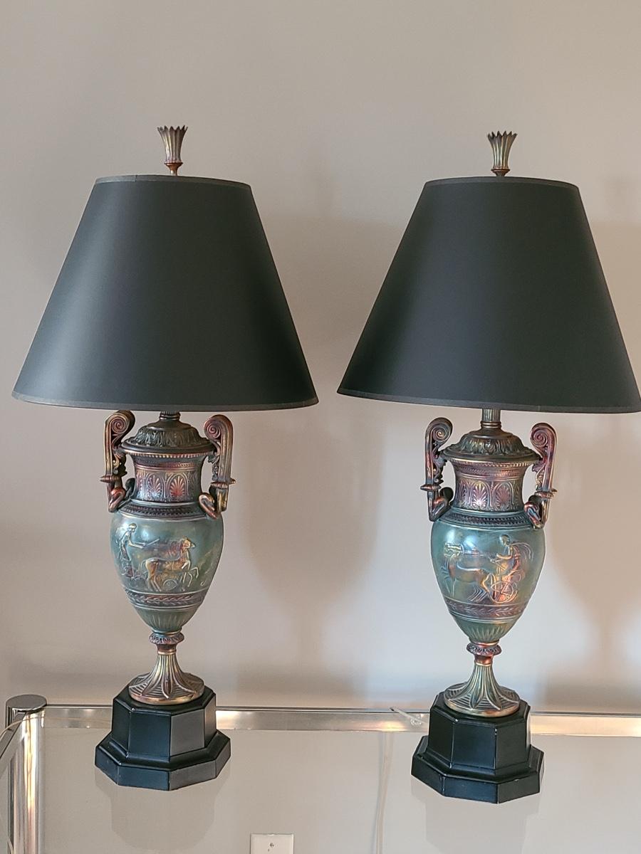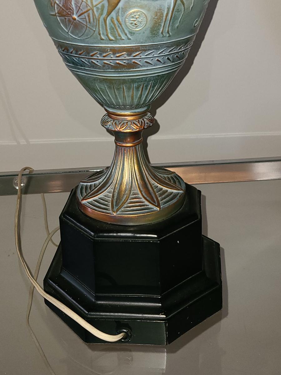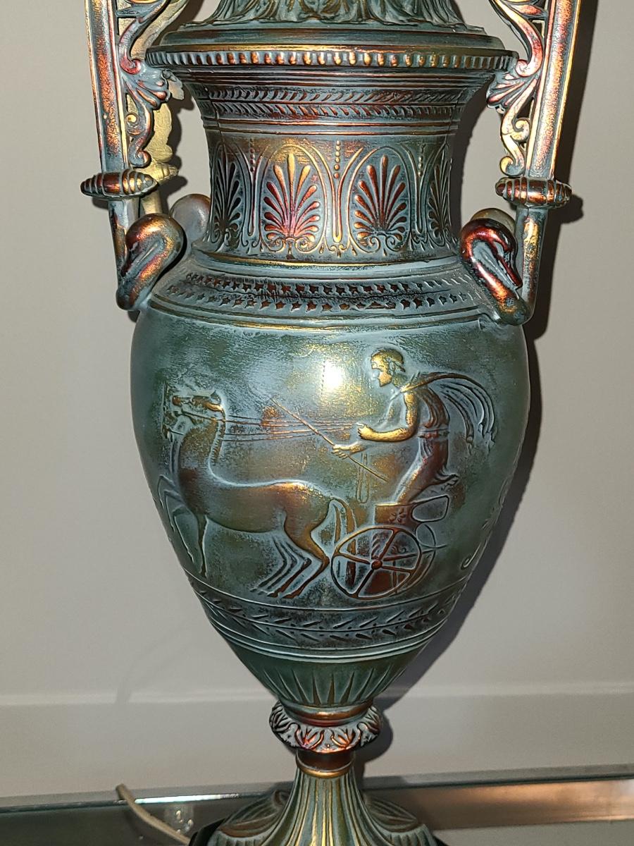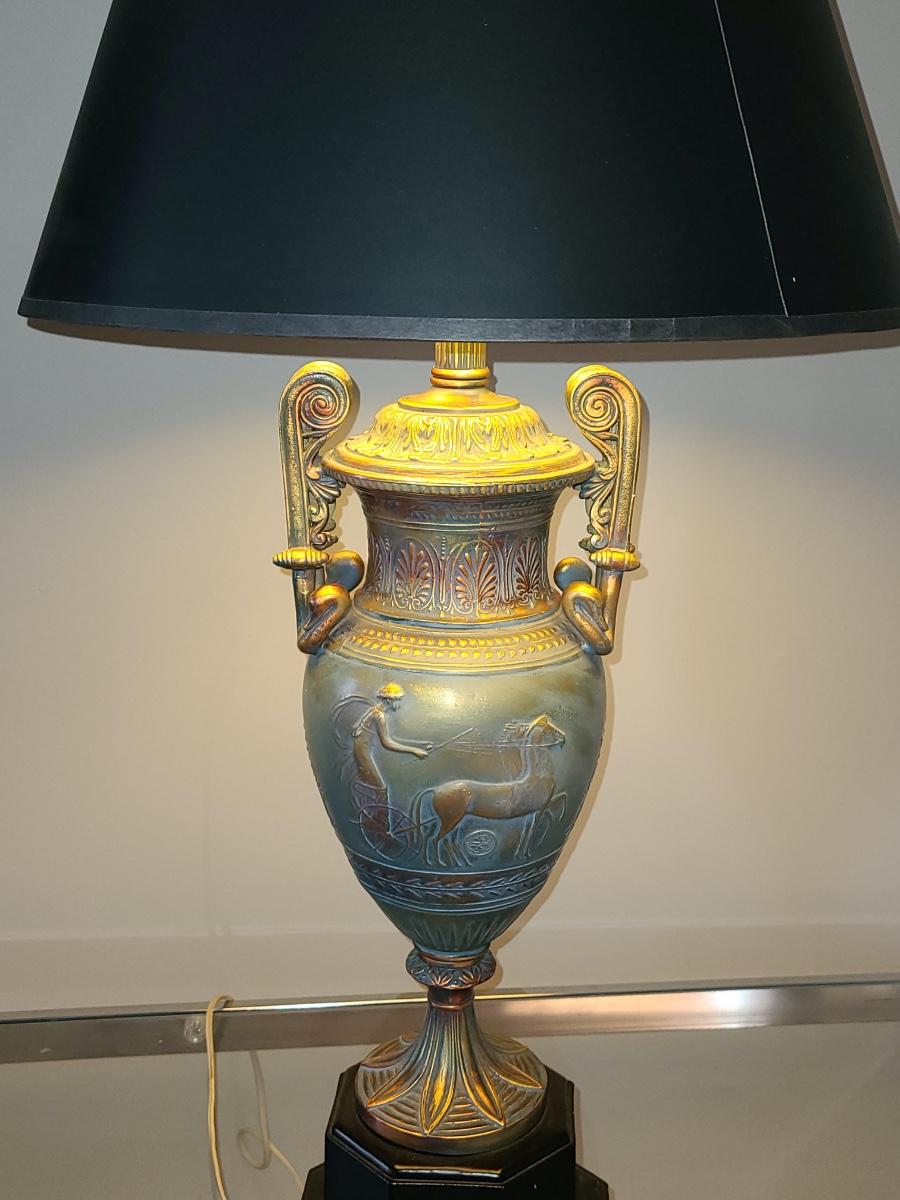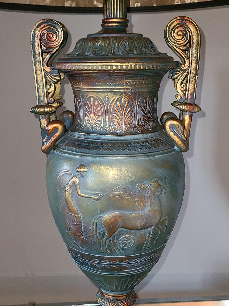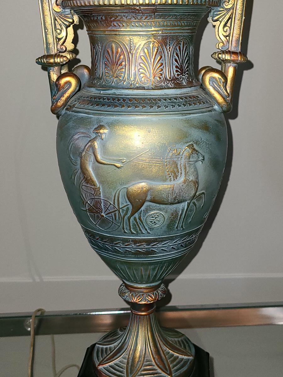 Beautiful ornate cast metal lamps with a chariot motif. These were made by Collection Francaise, Made in USA seal. Pictured in two different lights to show metalwork. Please see all pictures as they are the best representation of the items. The pictures show condition, measurements if taken, and what is included in the lot. Due to the large amount that we photograph and the time frame, we are not always able to take measurements. All items unless noted, are pre-owned and have been used. If you purchased furniture, you must bring help. We do not allow one person to carry large furniture out on their own. Bring help, tools and a truck for the safety of our client’s homes, and your personal safety. Company policy. Thank you.