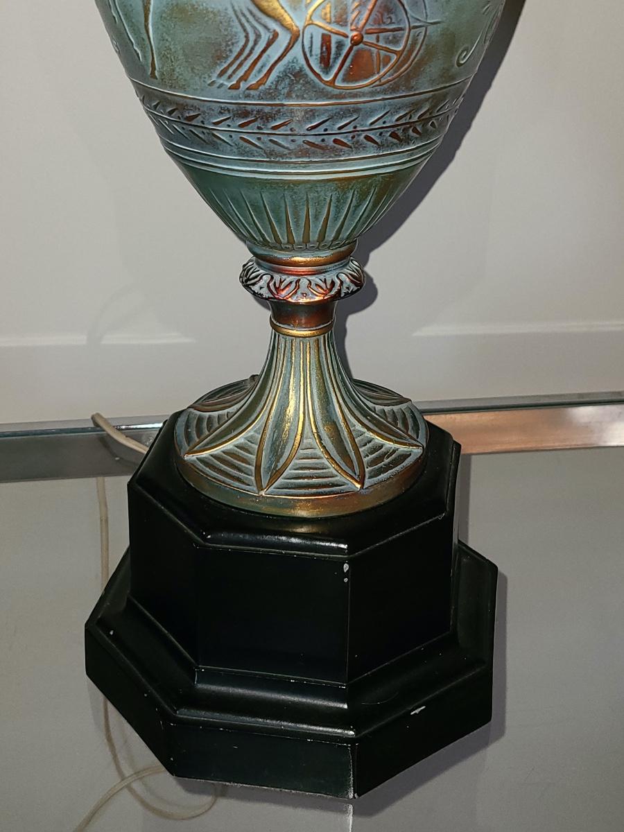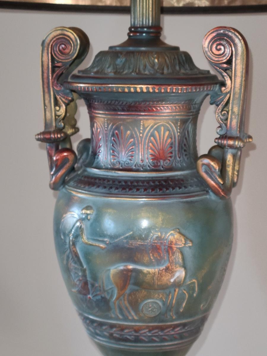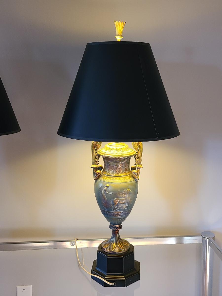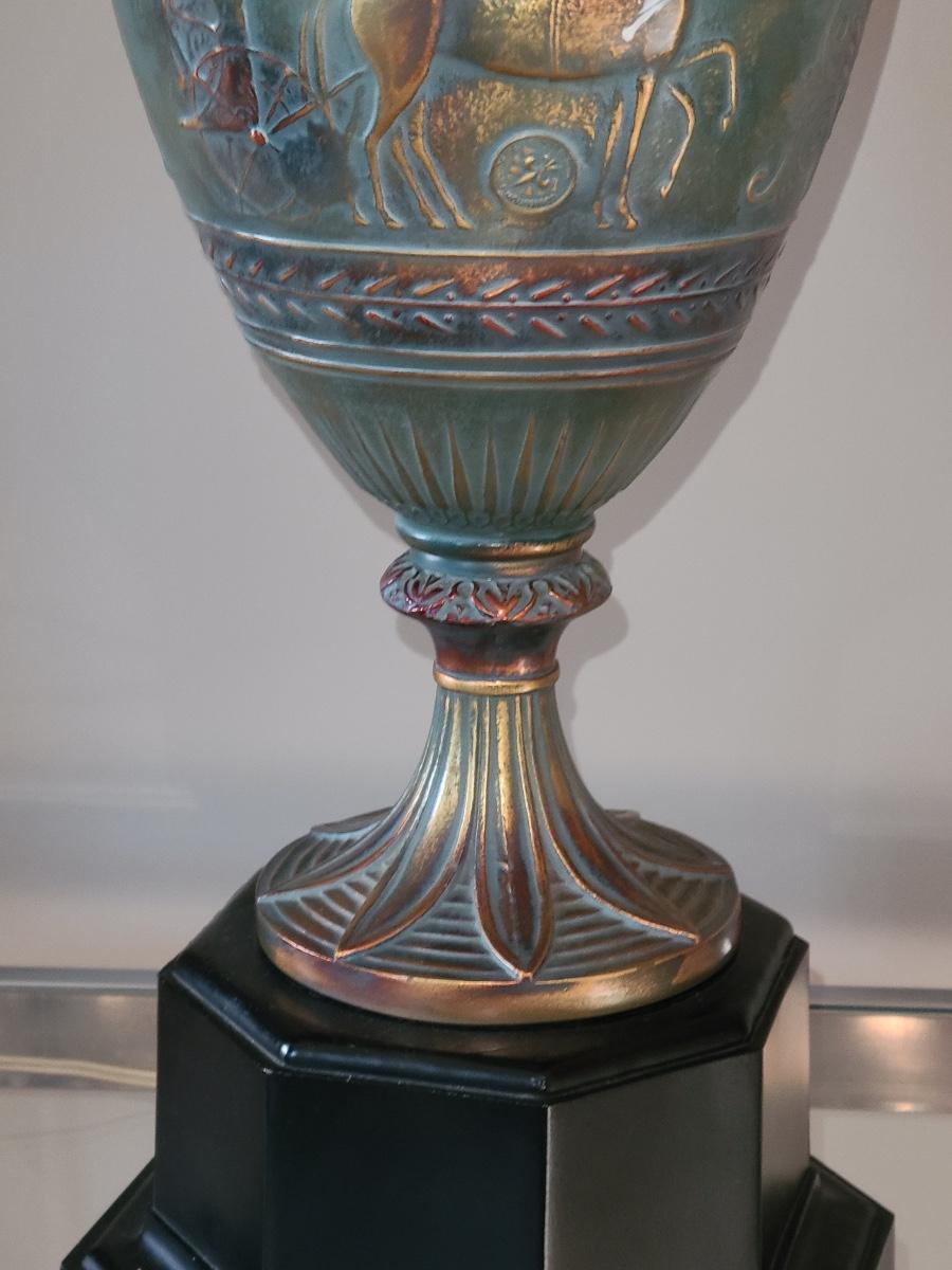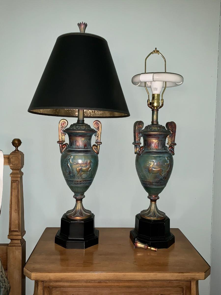 Beautiful ornate cast metal lamps with a chariot motif. These were made by Collection Francaise, Made in USA seal. Pictured in two different lights to show metalwork. Please see all pictures as they are the best representation of the items. The pictures show condition, measurements if taken, and what is included in the lot. Due to the large amount that we photograph and the time frame, we are not always able to take measurements. All items unless noted, are pre-owned and have been used. If you purchased furniture, you must bring help. We do not allow one person to carry large furniture out on their own. Bring help, tools and a truck for the safety of our client’s homes, and your personal safety. Company policy. Thank you.