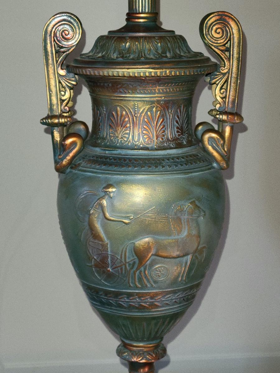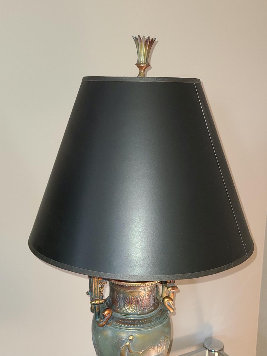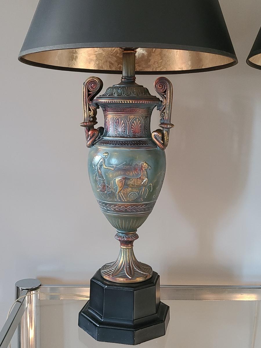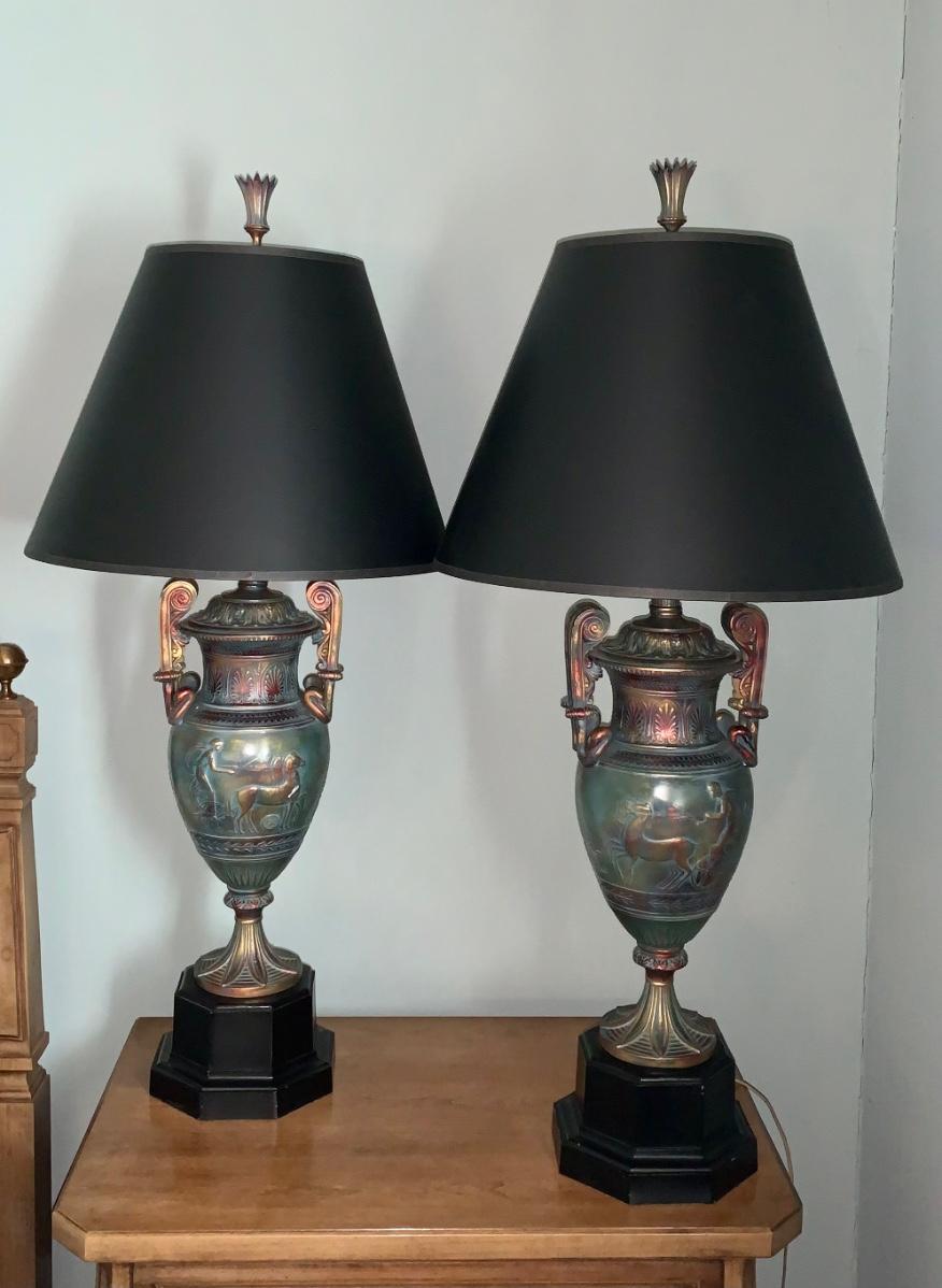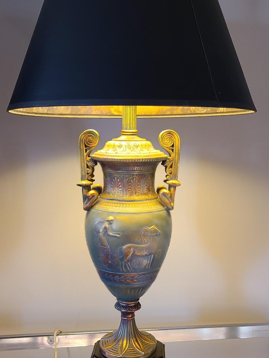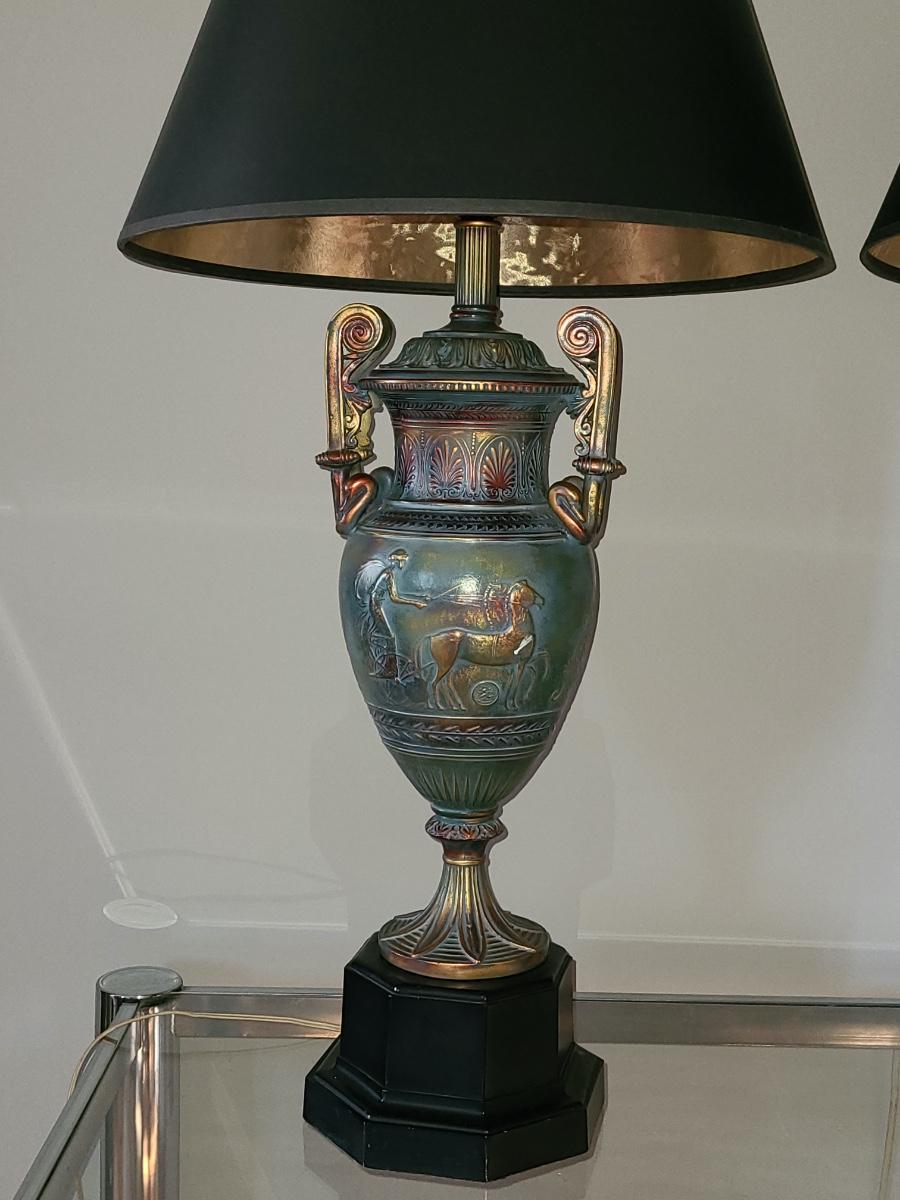 Beautiful ornate cast metal lamps with a chariot motif. These were made by Collection Francaise, Made in USA seal. Pictured in two different lights to show metalwork. Please see all pictures as they are the best representation of the items. The pictures show condition, measurements if taken, and what is included in the lot. Due to the large amount that we photograph and the time frame, we are not always able to take measurements. All items unless noted, are pre-owned and have been used. If you purchased furniture, you must bring help. We do not allow one person to carry large furniture out on their own. Bring help, tools and a truck for the safety of our client’s homes, and your personal safety. Company policy. Thank you.