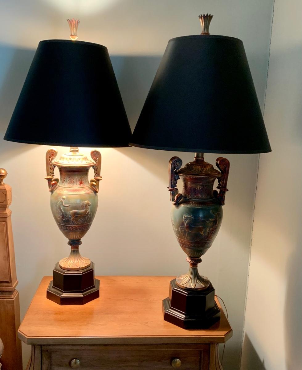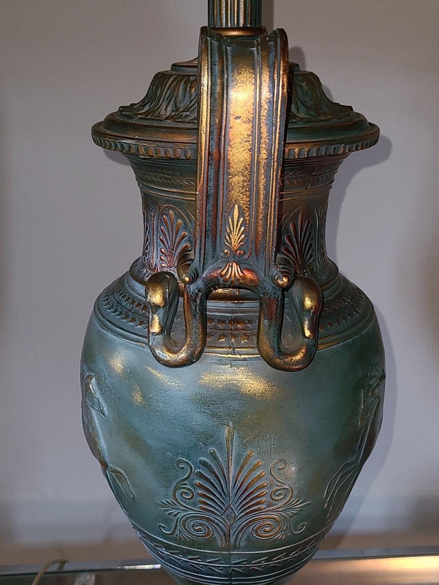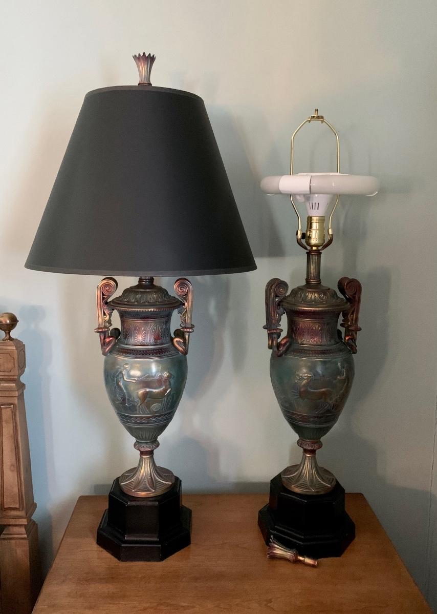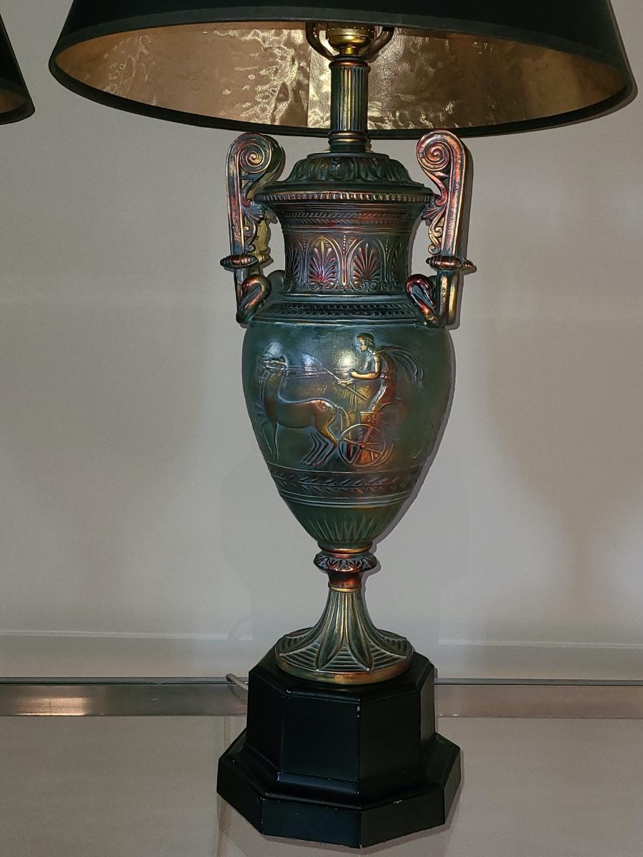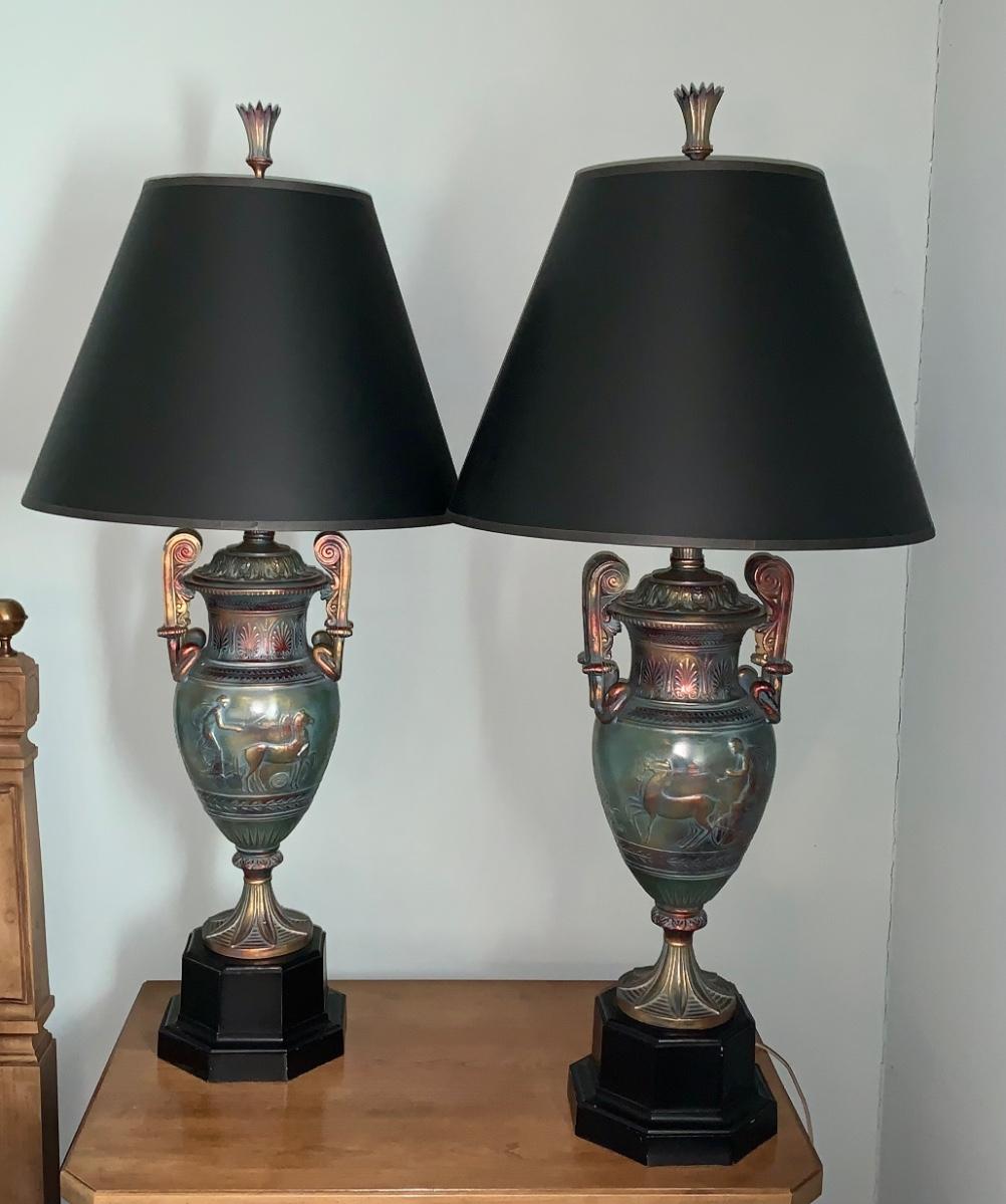 Beautiful ornate cast metal lamps with a chariot motif. These were made by Collection Francaise, Made in USA seal. Pictured in two different lights to show metalwork. Please see all pictures as they are the best representation of the items. The pictures show condition, measurements if taken, and what is included in the lot. Due to the large amount that we photograph and the time frame, we are not always able to take measurements. All items unless noted, are pre-owned and have been used. If you purchased furniture, you must bring help. We do not allow one person to carry large furniture out on their own. Bring help, tools and a truck for the safety of our client’s homes, and your personal safety. Company policy. Thank you.