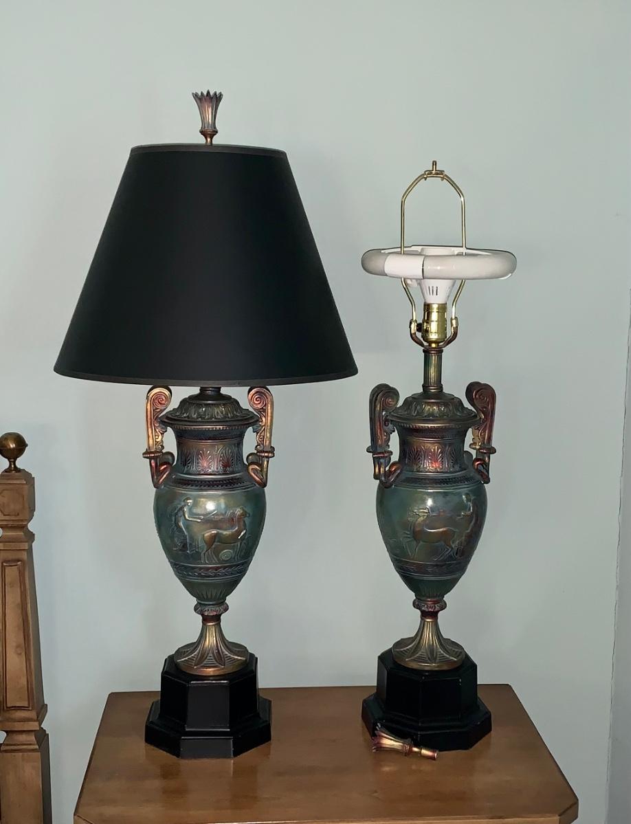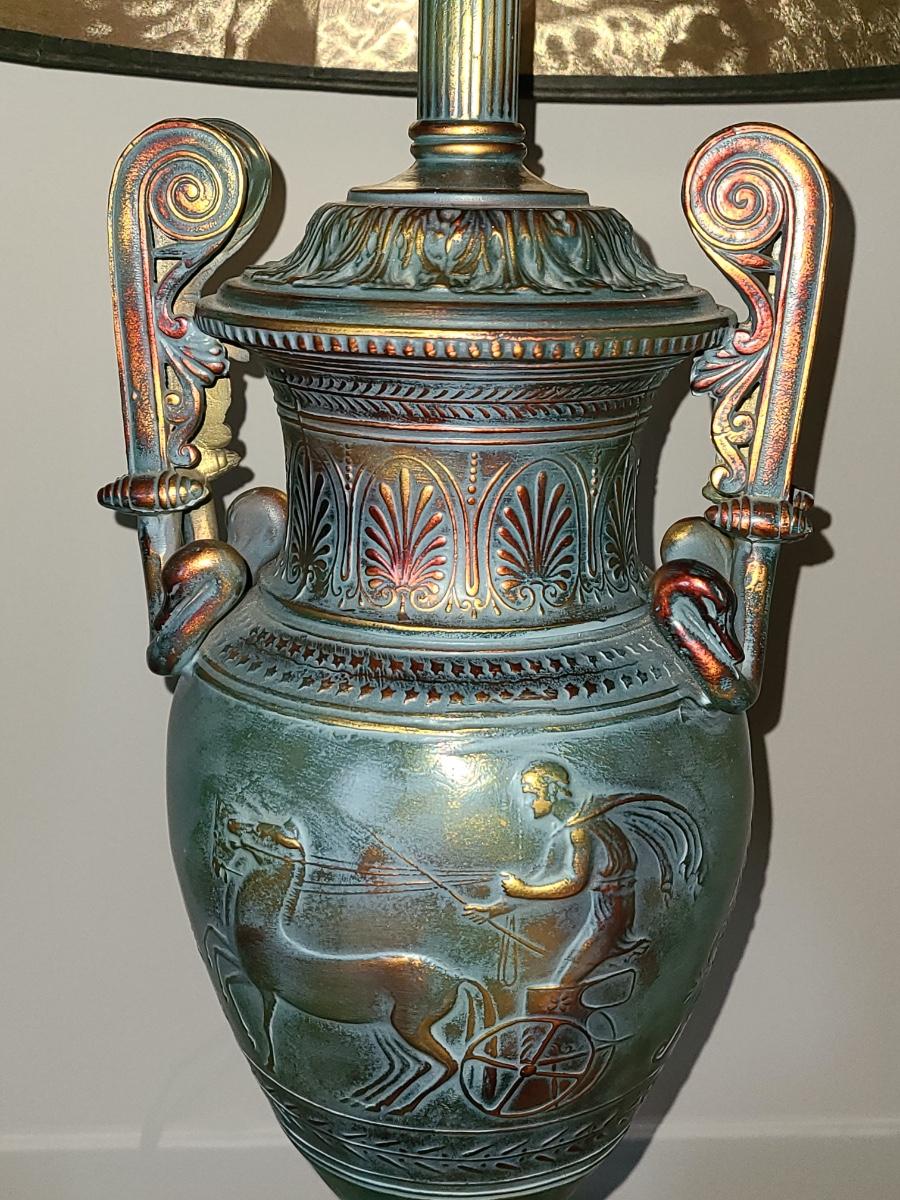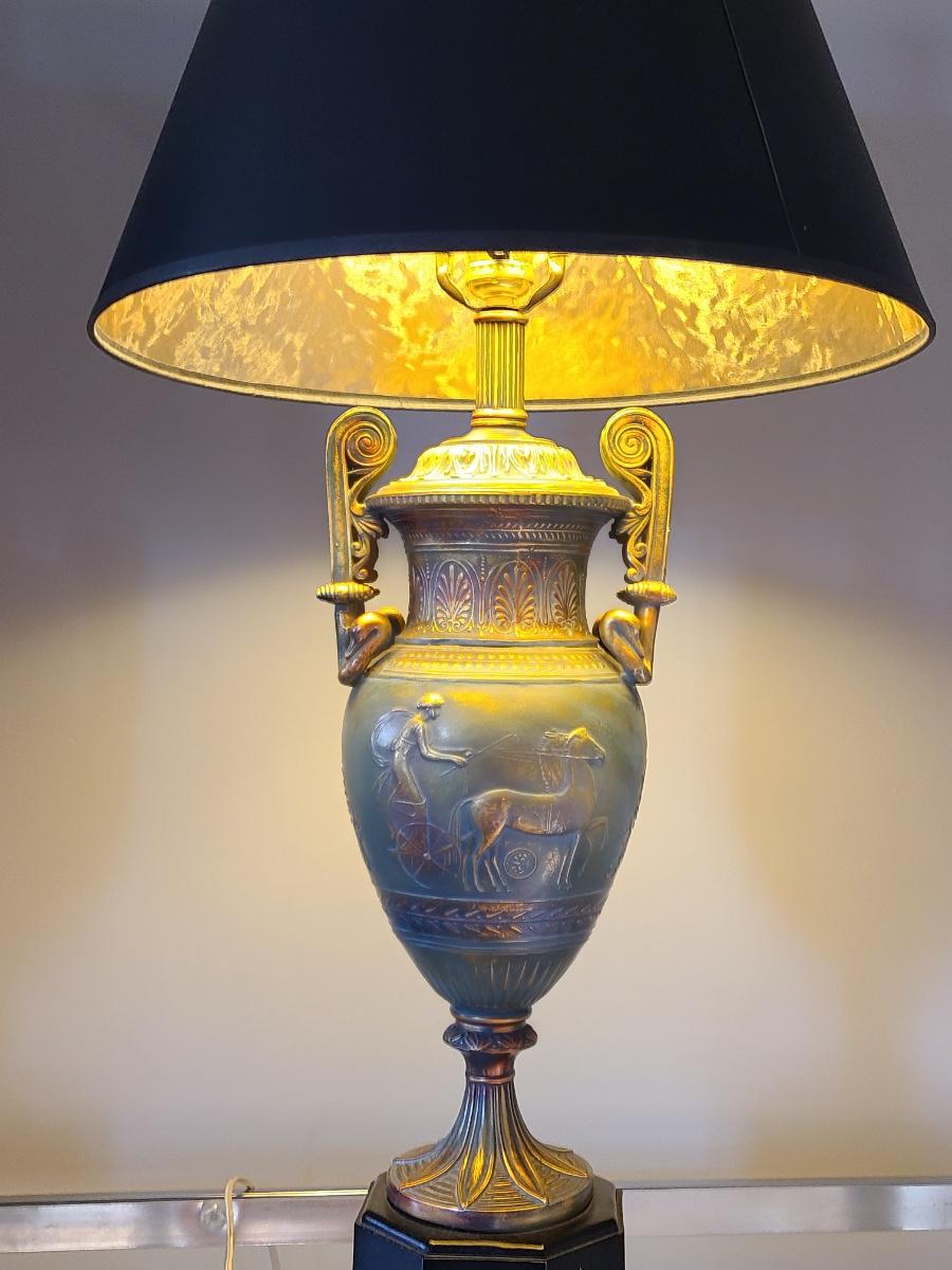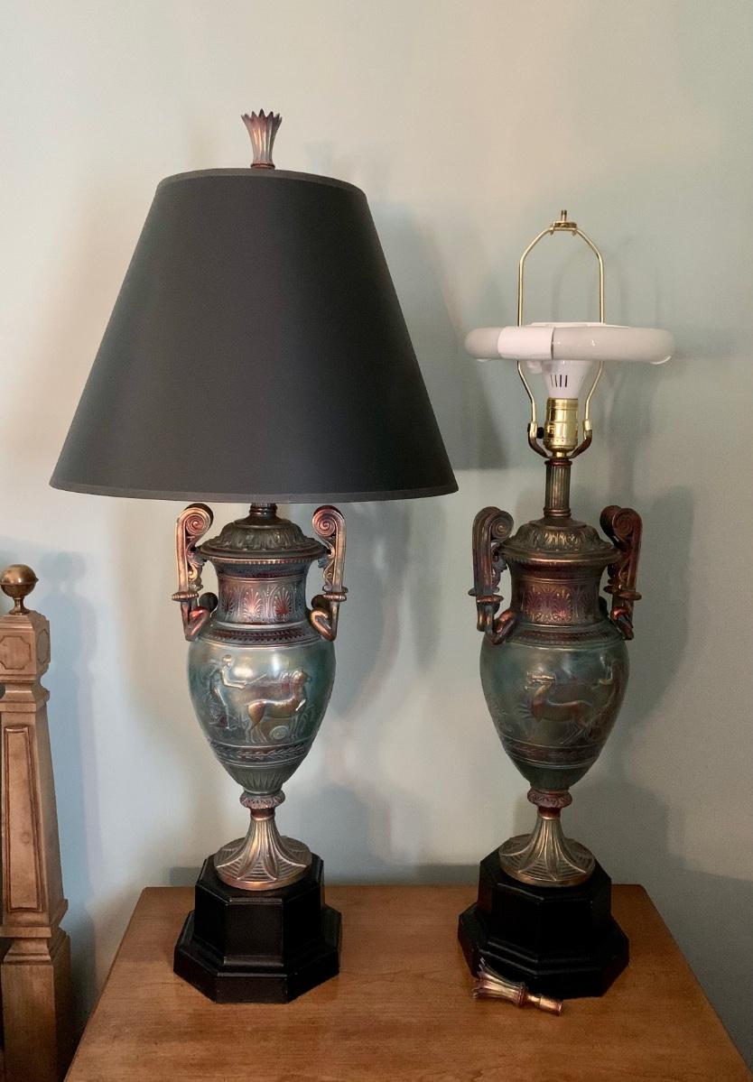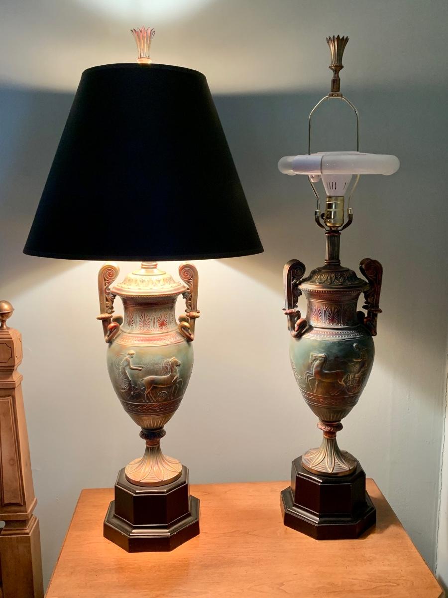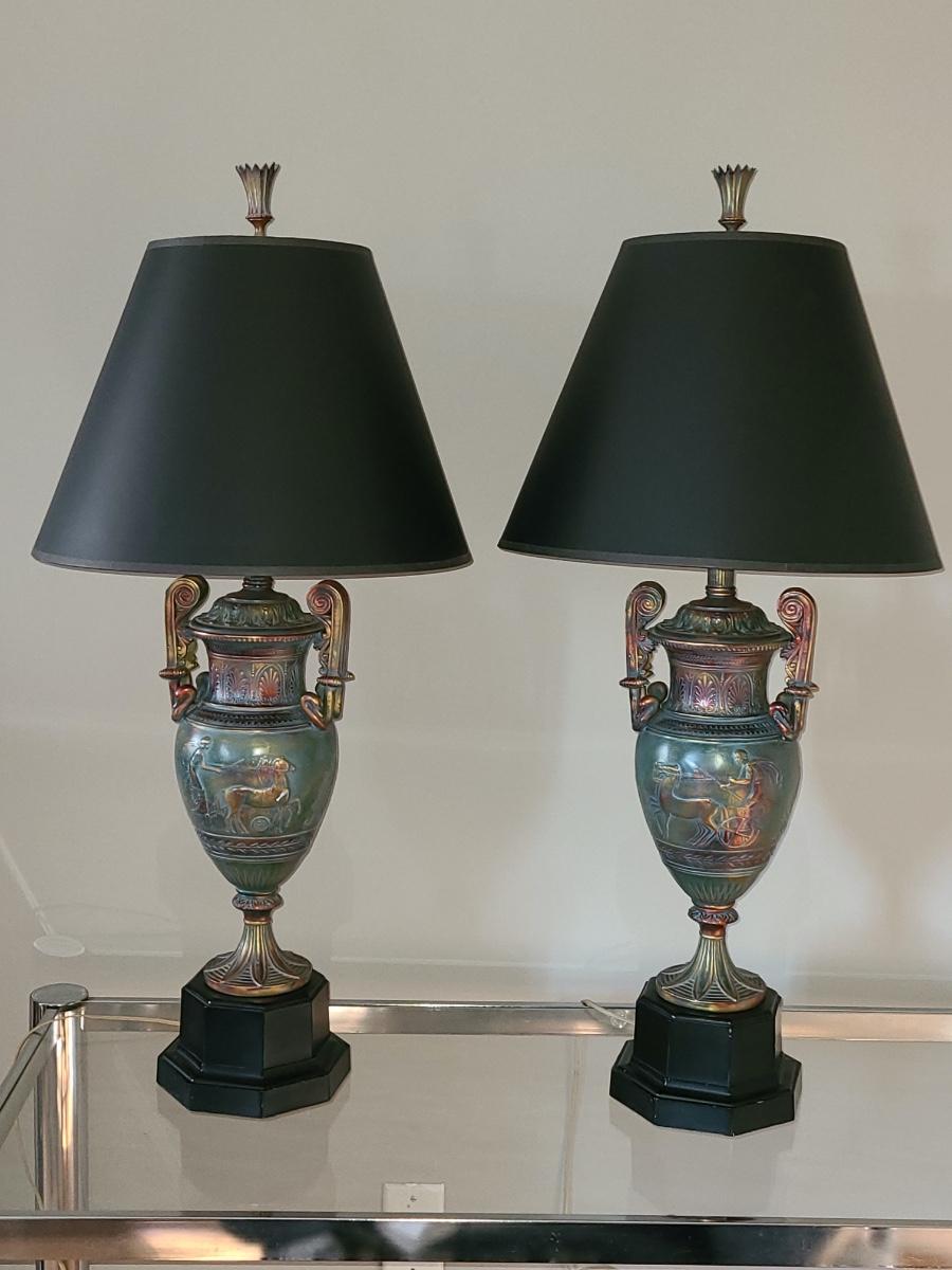Beautiful ornate cast metal lamps with a chariot motif. These were made by Collection Francaise, Made in USA seal. Pictured in two different lights to show metalwork. Please see all pictures as they are the best representation of the items. The pictures show condition, measurements if taken, and what is included in the lot. Due to the large amount that we photograph and the time frame, we are not always able to take measurements. All items unless noted, are pre-owned and have been used. If you purchased furniture, you must bring help. We do not allow one person to carry large furniture out on their own. Bring help, tools and a truck for the safety of our client’s homes, and your personal safety. Company policy. Thank you.