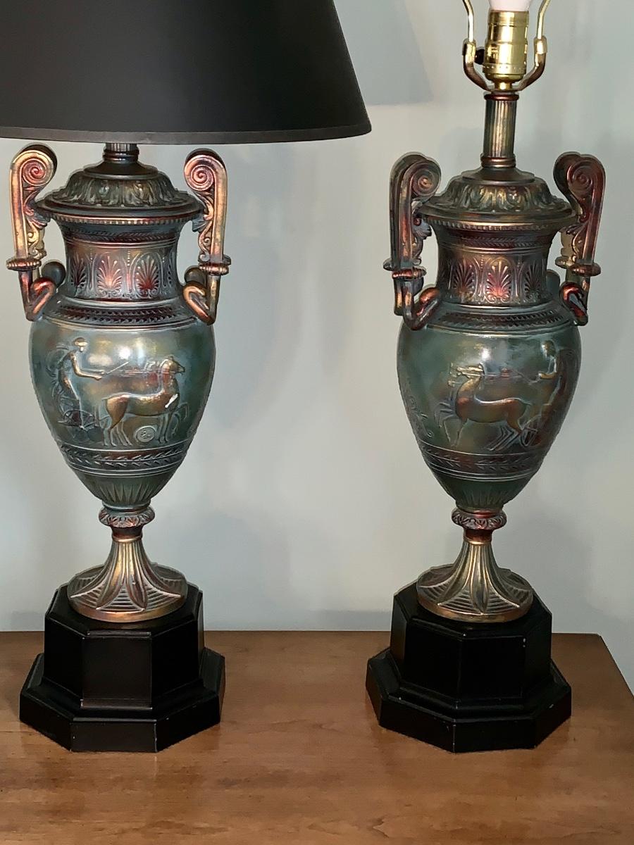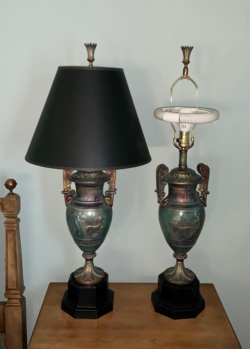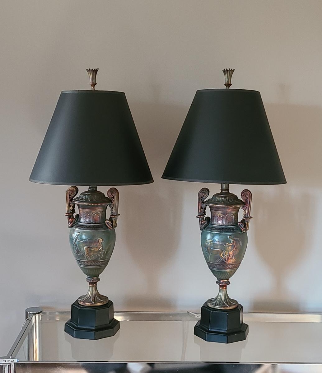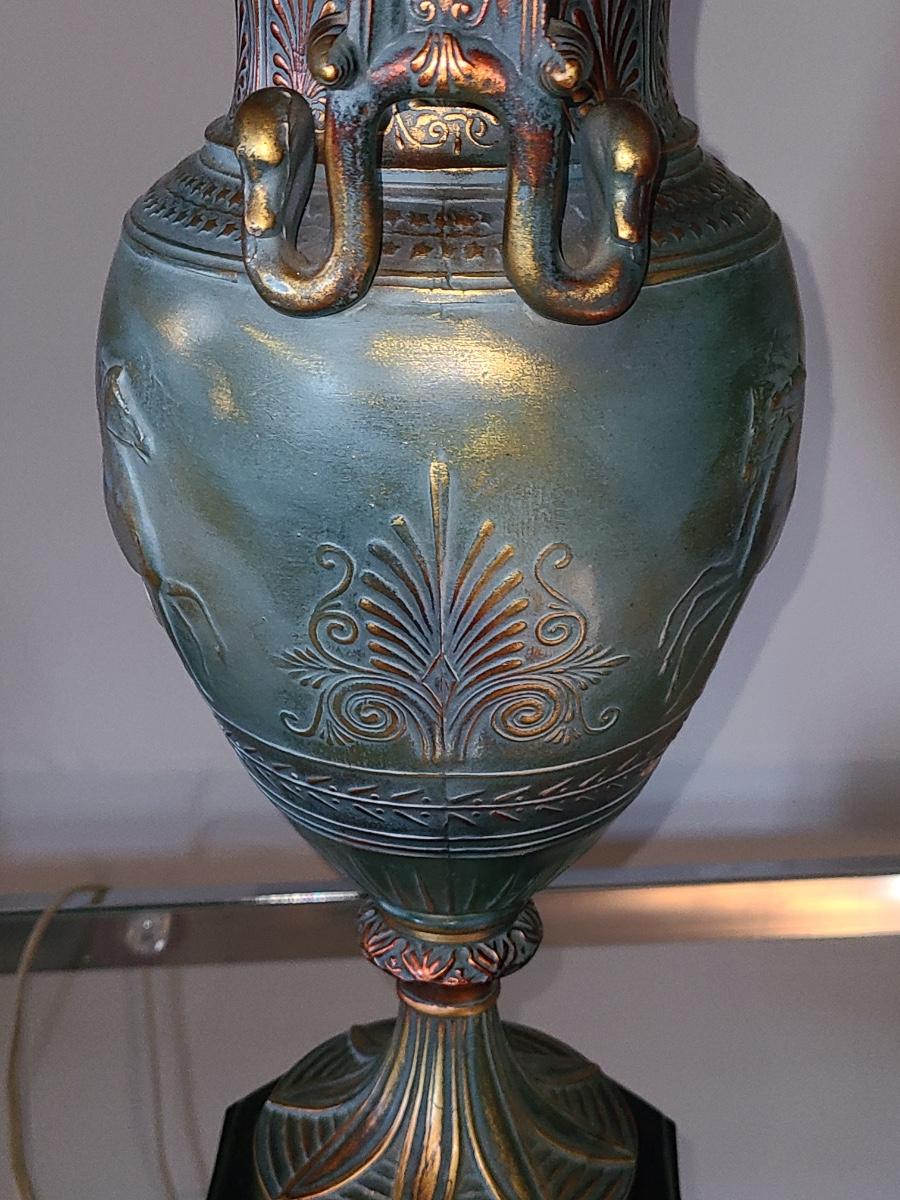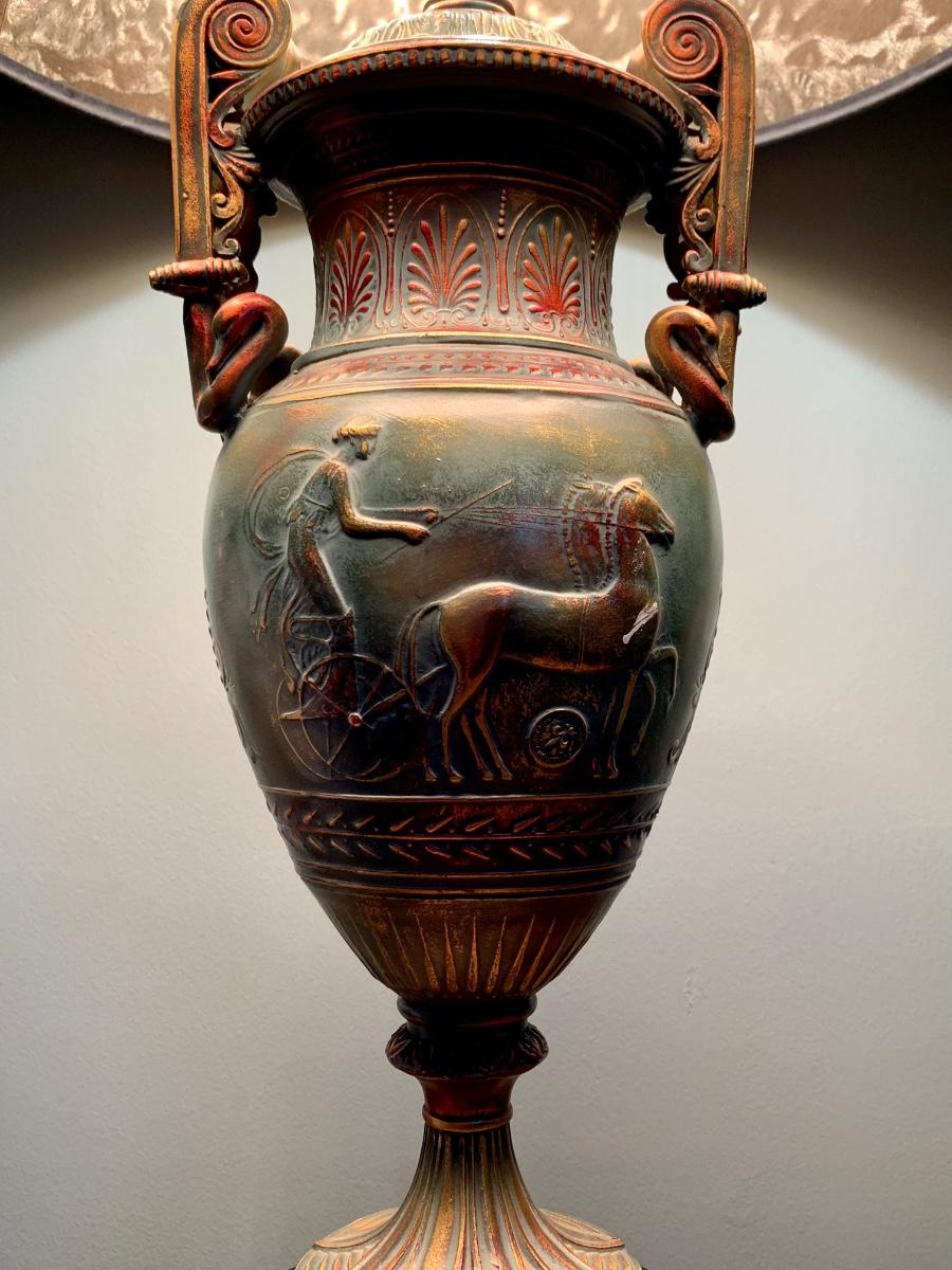 Beautiful ornate cast metal lamps with a chariot motif. These were made by Collection Francaise, Made in USA seal. Pictured in two different lights to show metalwork. Please see all pictures as they are the best representation of the items. The pictures show condition, measurements if taken, and what is included in the lot. Due to the large amount that we photograph and the time frame, we are not always able to take measurements. All items unless noted, are pre-owned and have been used. If you purchased furniture, you must bring help. We do not allow one person to carry large furniture out on their own. Bring help, tools and a truck for the safety of our client’s homes, and your personal safety. Company policy. Thank you.