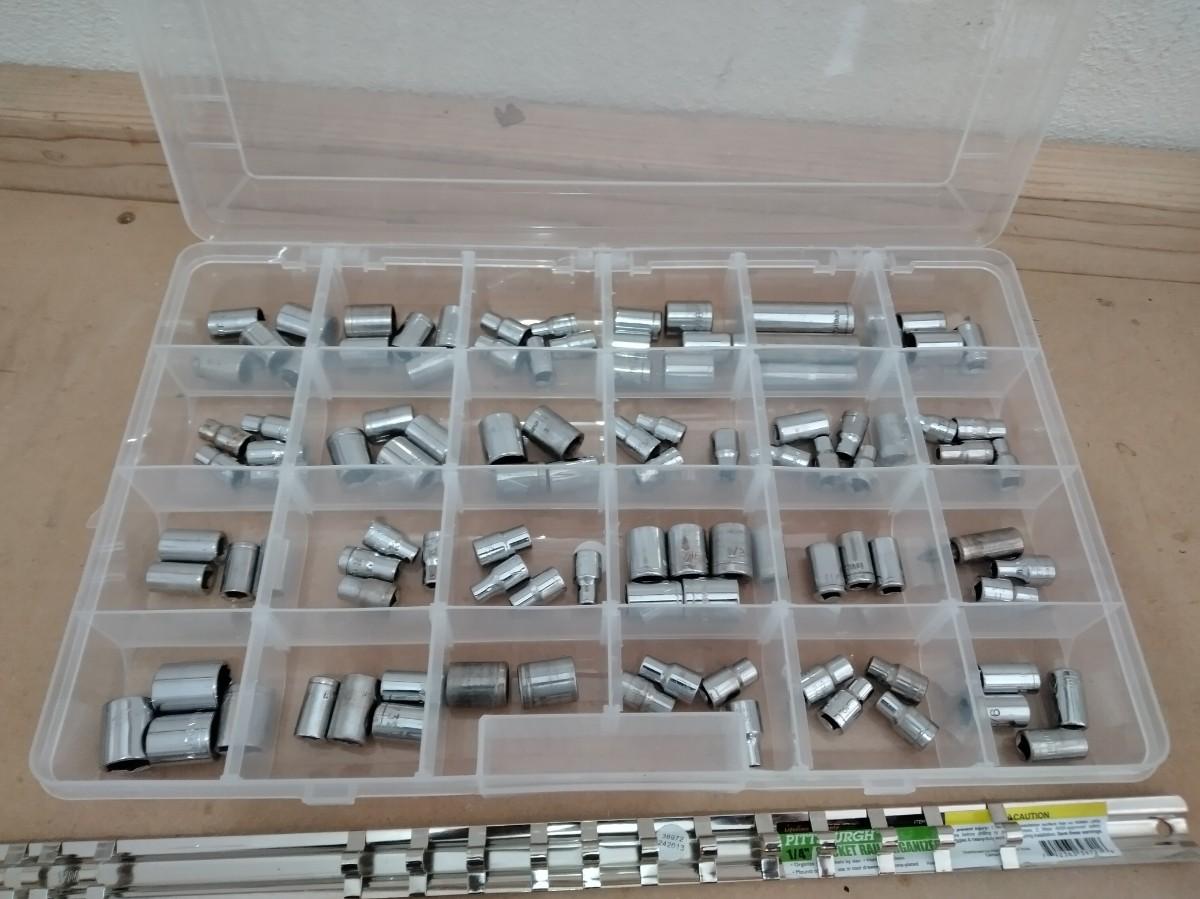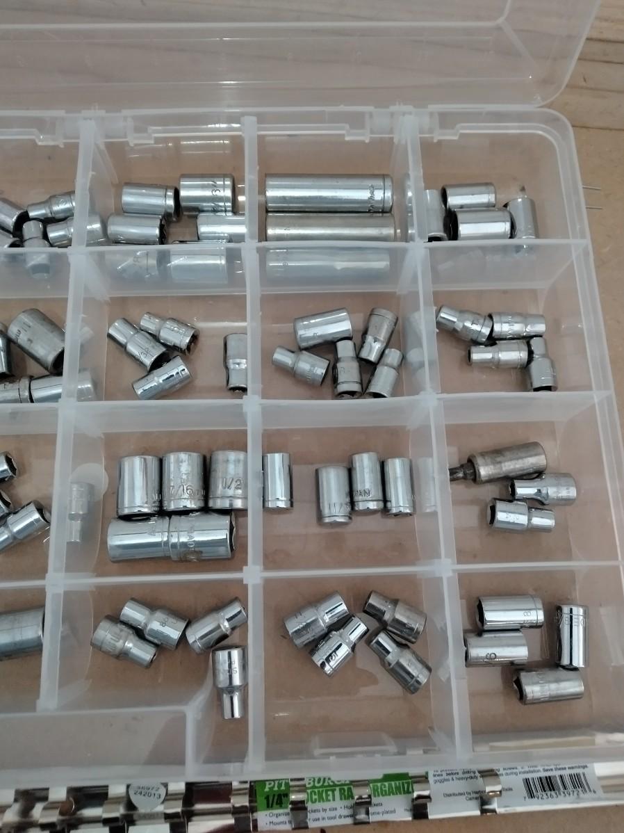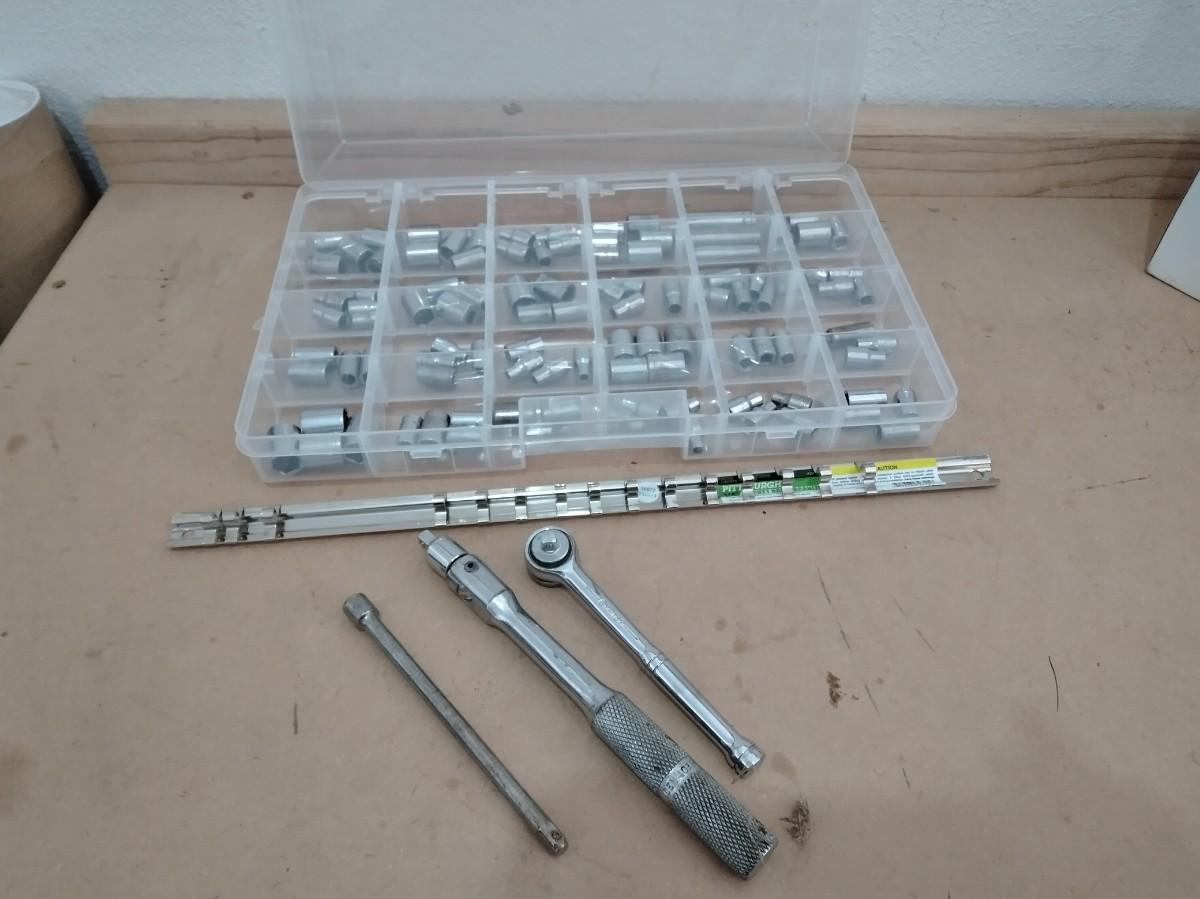 ORGANIZER WITH ASSORTMENT OF SOCKETS, SOCKET STRIP ORGANIZER, AND RATCHET.
