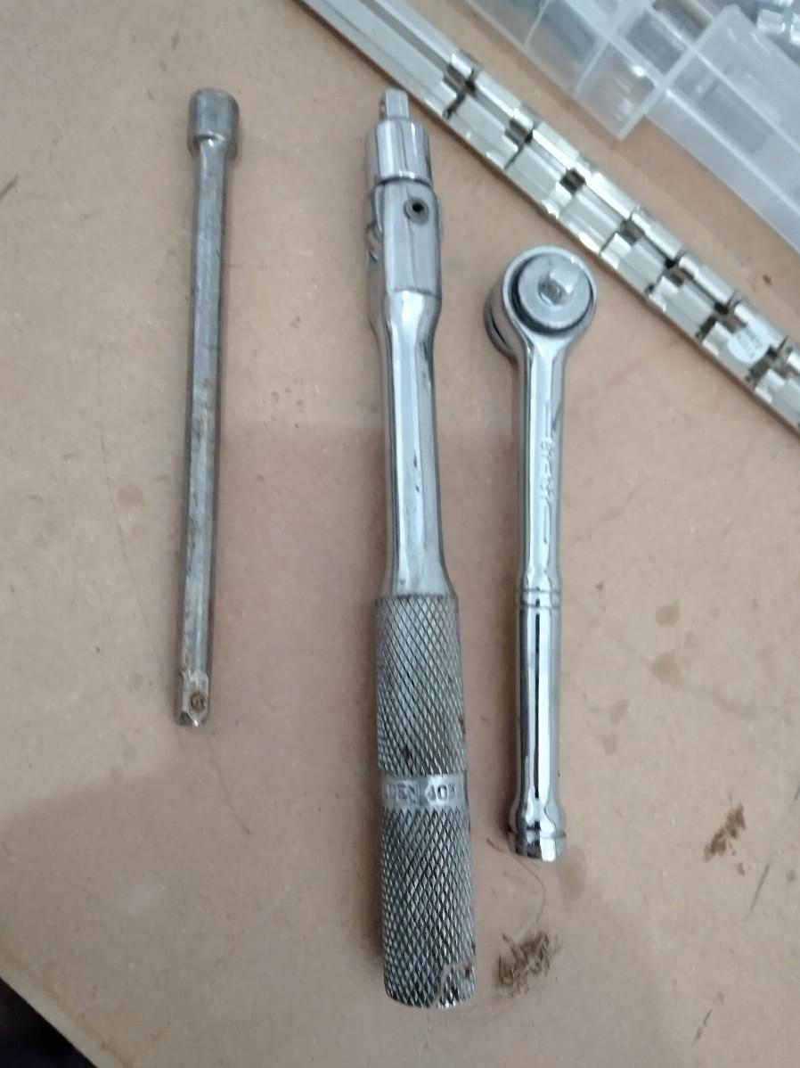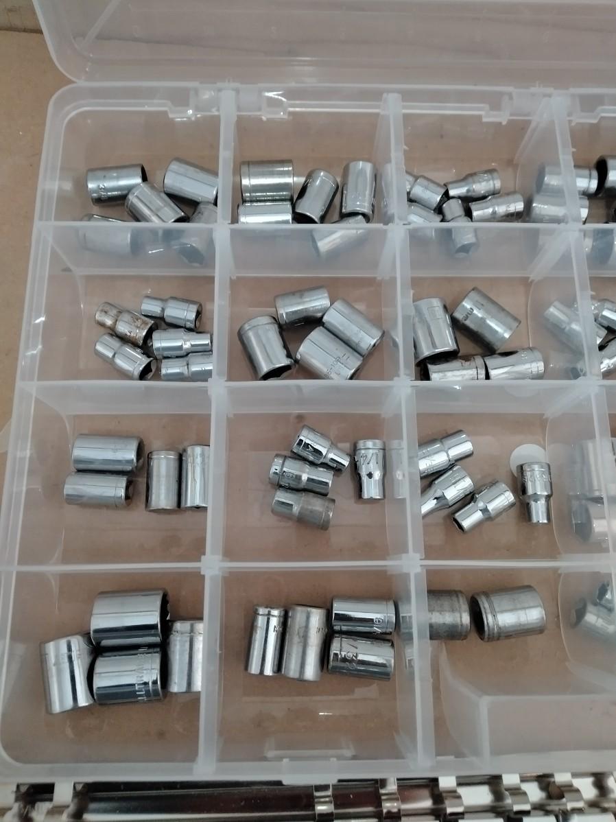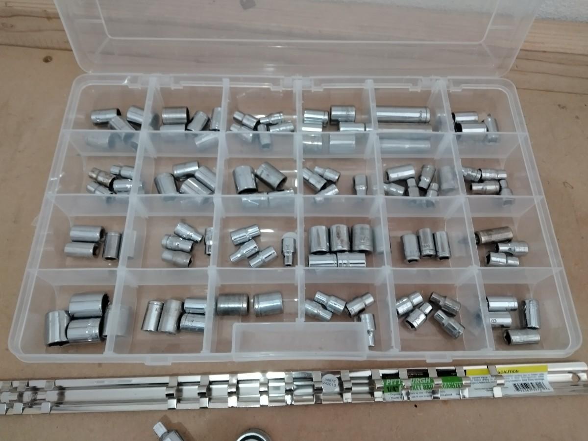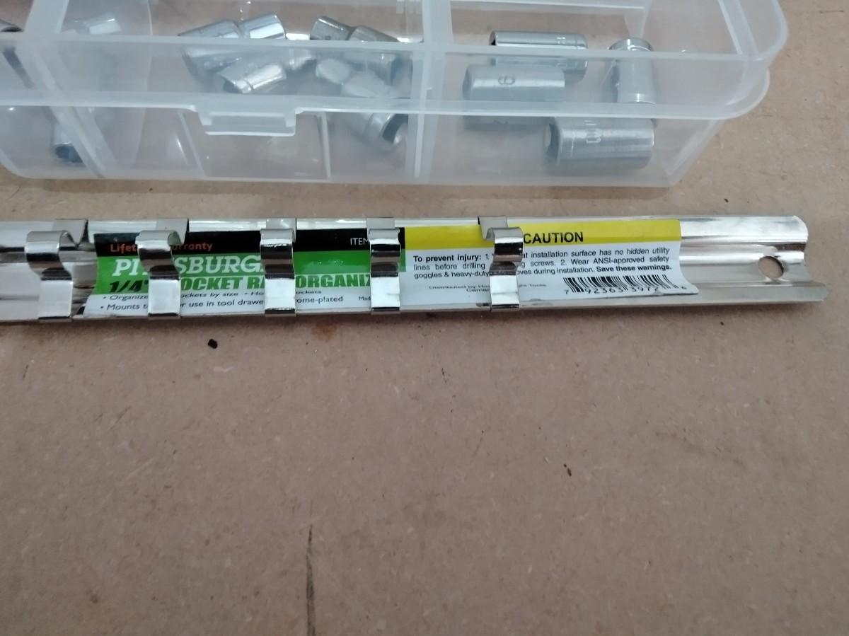 ORGANIZER WITH ASSORTMENT OF SOCKETS, SOCKET STRIP ORGANIZER, AND RATCHET.
