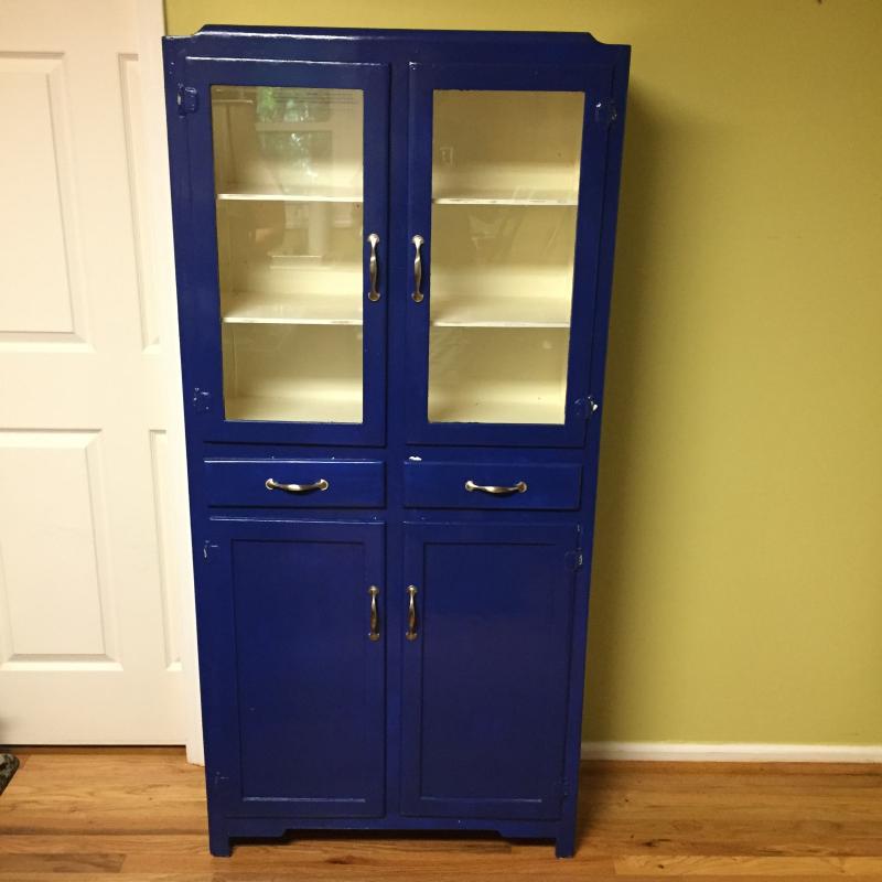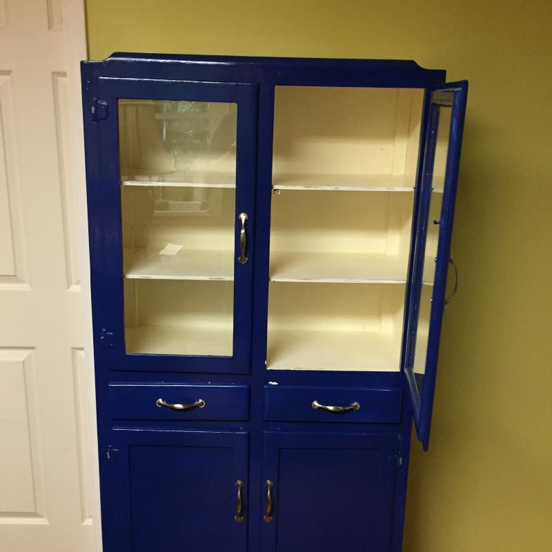Bright Blue Cabinet With Glass Doors on Front. Add some pop to your kitchen or garden! Paint is chipped in a few Places. Cabinet Measures 31” x 12” x 65.5”. Local Pickup Only