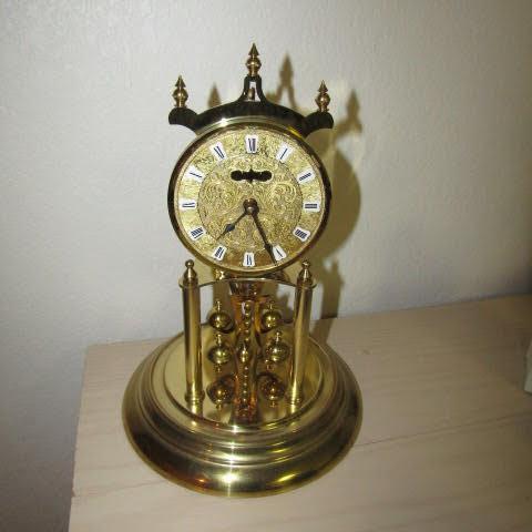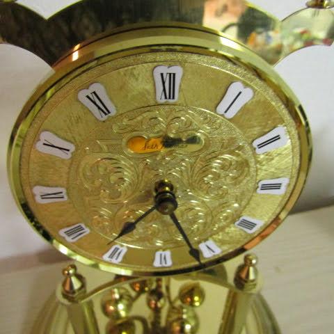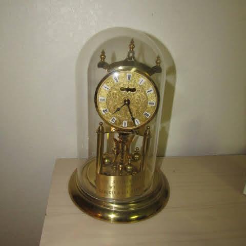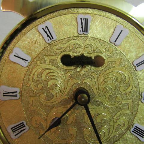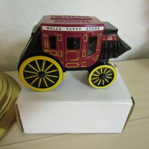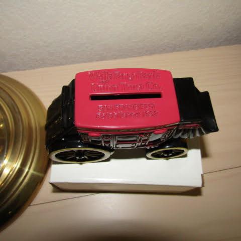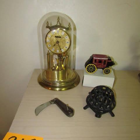 SET OF 4 KNICK KNACK MISCELLANEOUS DECOR. CLOCK IN ENCASED GLASS, BLACK TURTLE FIGURINE, WELLS FARGK CAR PIGGY BANK WITH DISPLAY STAND, MINI SWITCHBLADE/AXE? GOLD DETAIL AND ROMAN NUMERALS ON BATTERY OPERATED CLOCK.