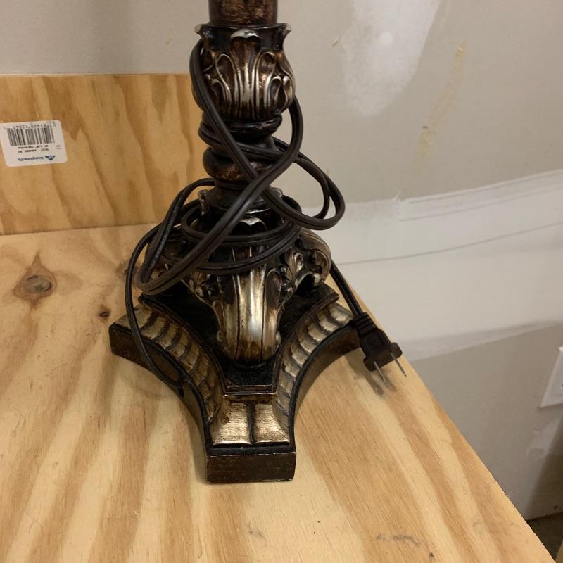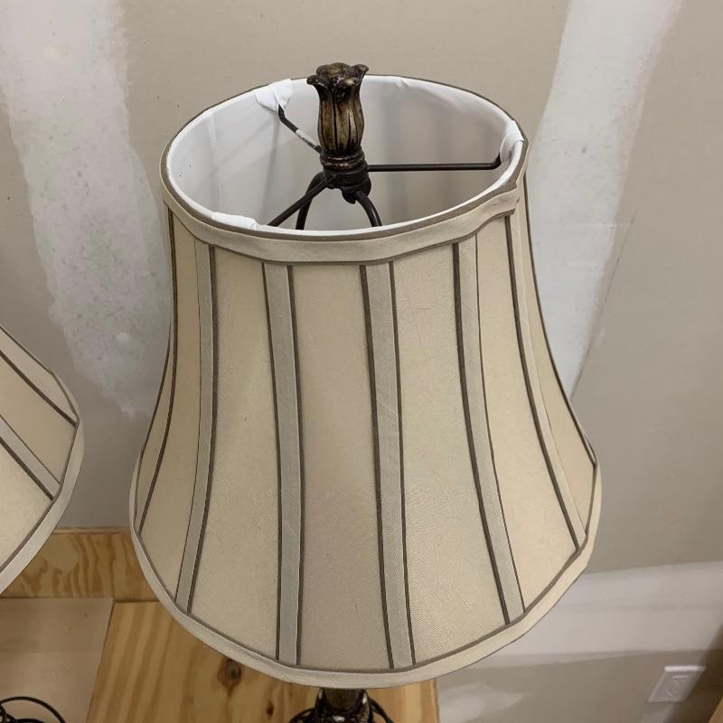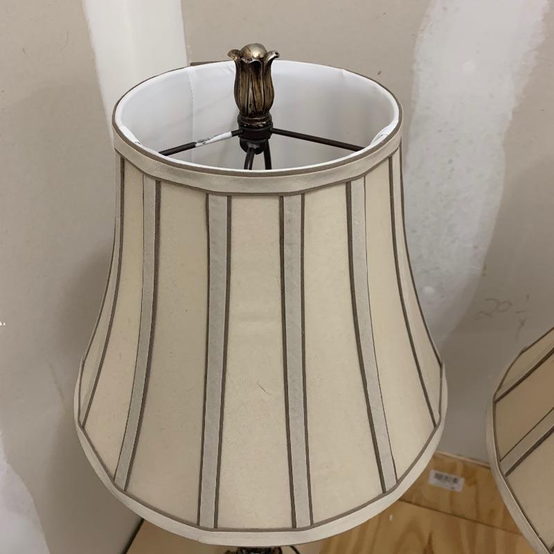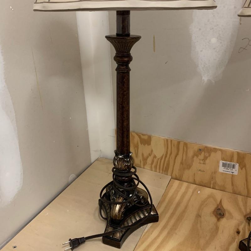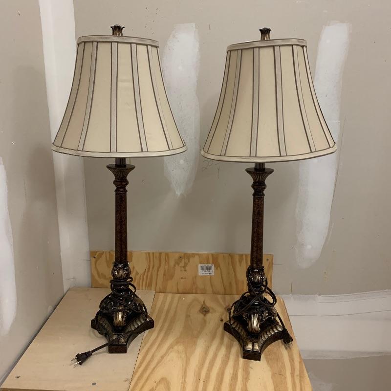 These skinny table lamps have a bronze hue to them and are in good condition. Each stands 31” tall and the shades are 12.5” diameter at the base. Local pick up only.