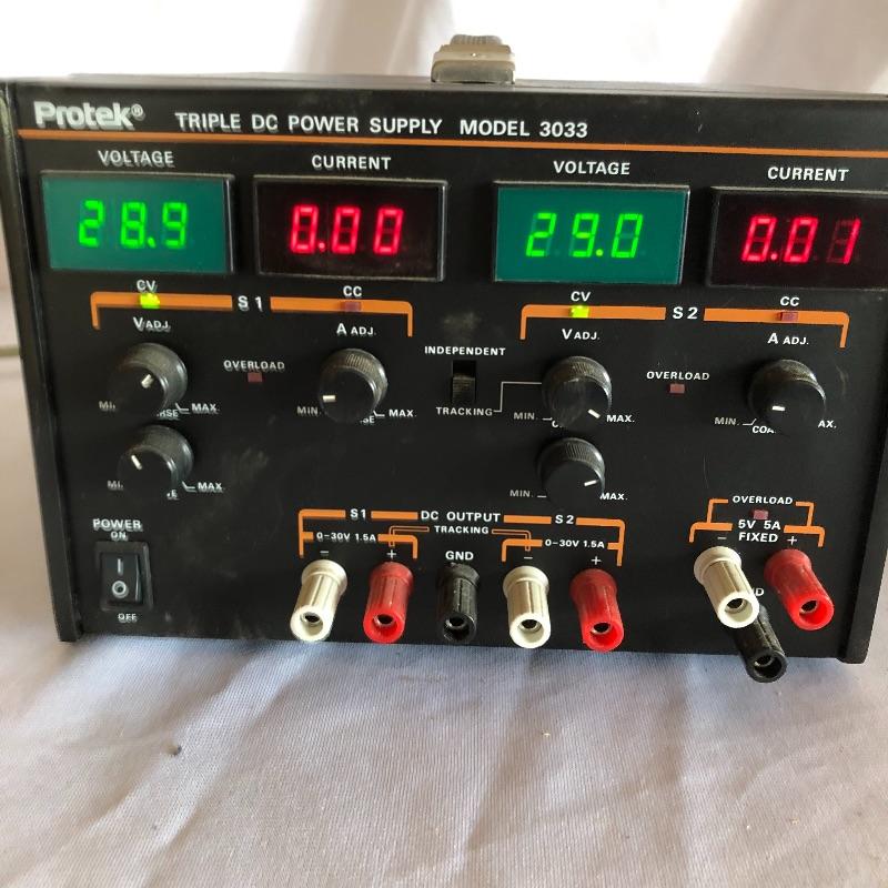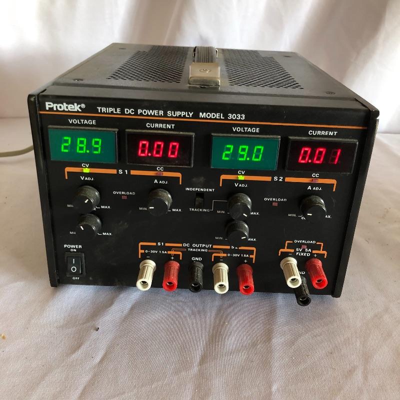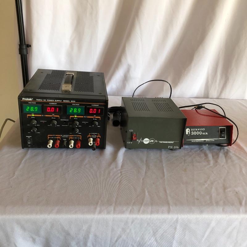 Keep all your DC equipment powered with this trio of DC power supplies. Lot includes Protek Triple DC power supply model#3033, Richmond 3model # 3000ECR and Tripp Lite model # PR- 10b.
