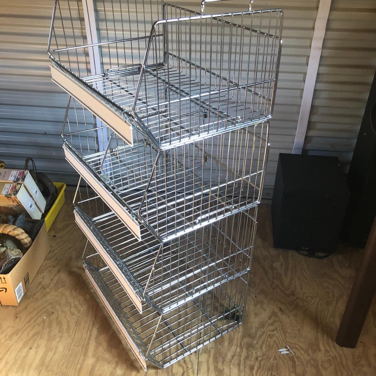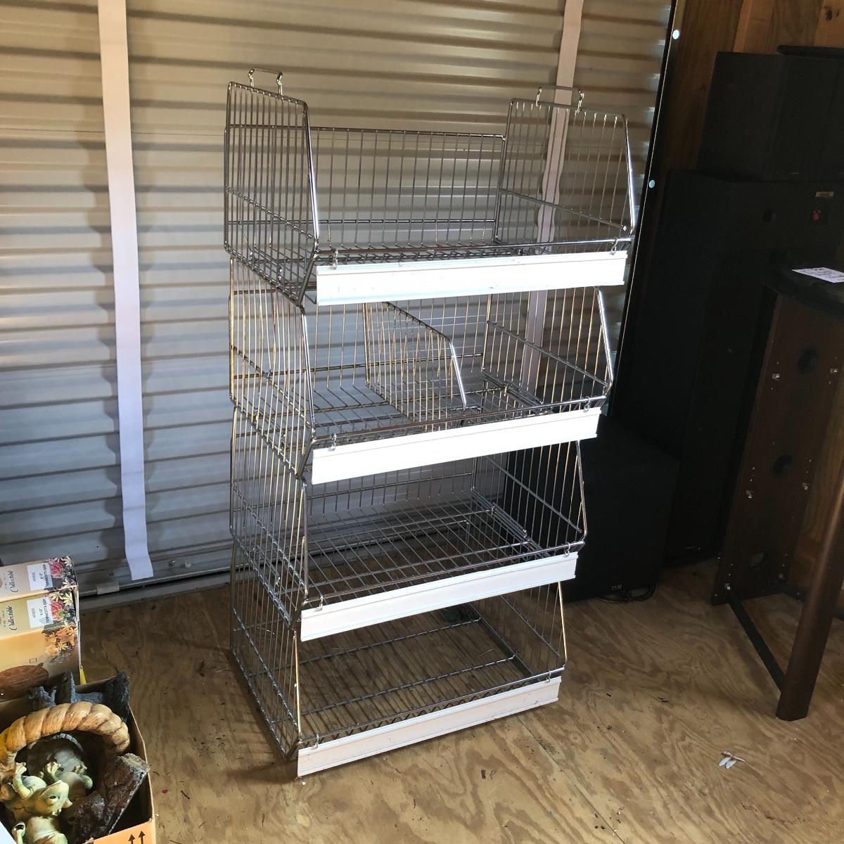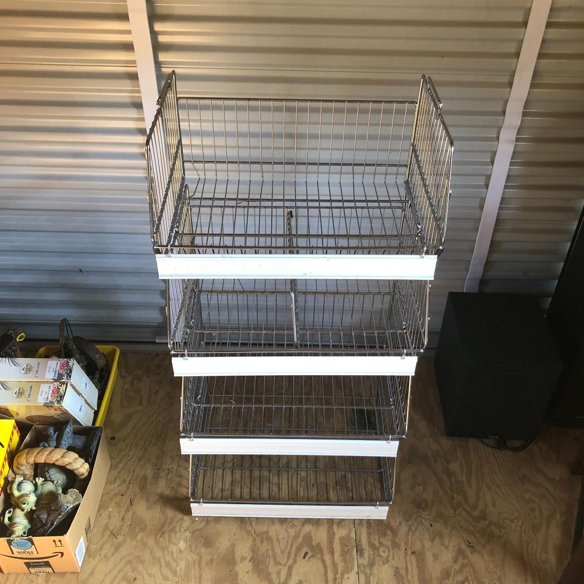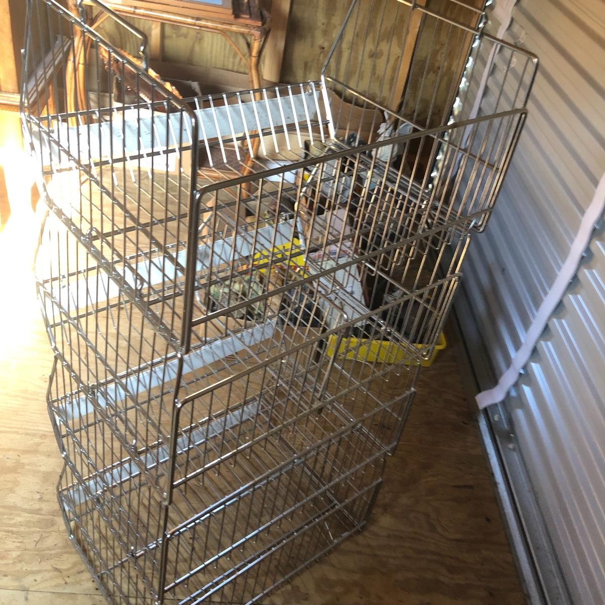 This four unit stacking shelf will pack a ton of storage. Each metal basket stacks effortlessly onto each other and all have white plastic pieces that are for sliding in labels, handles and one also has a divider. There is some minor surface rust just on the basket with the divider, all the rest look very clean.