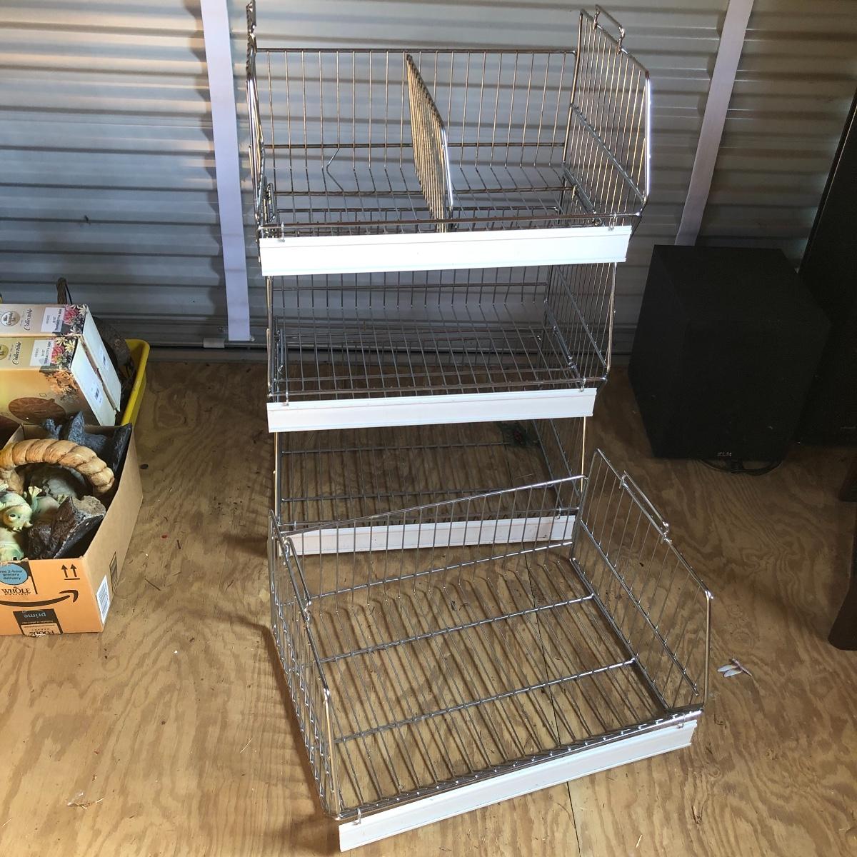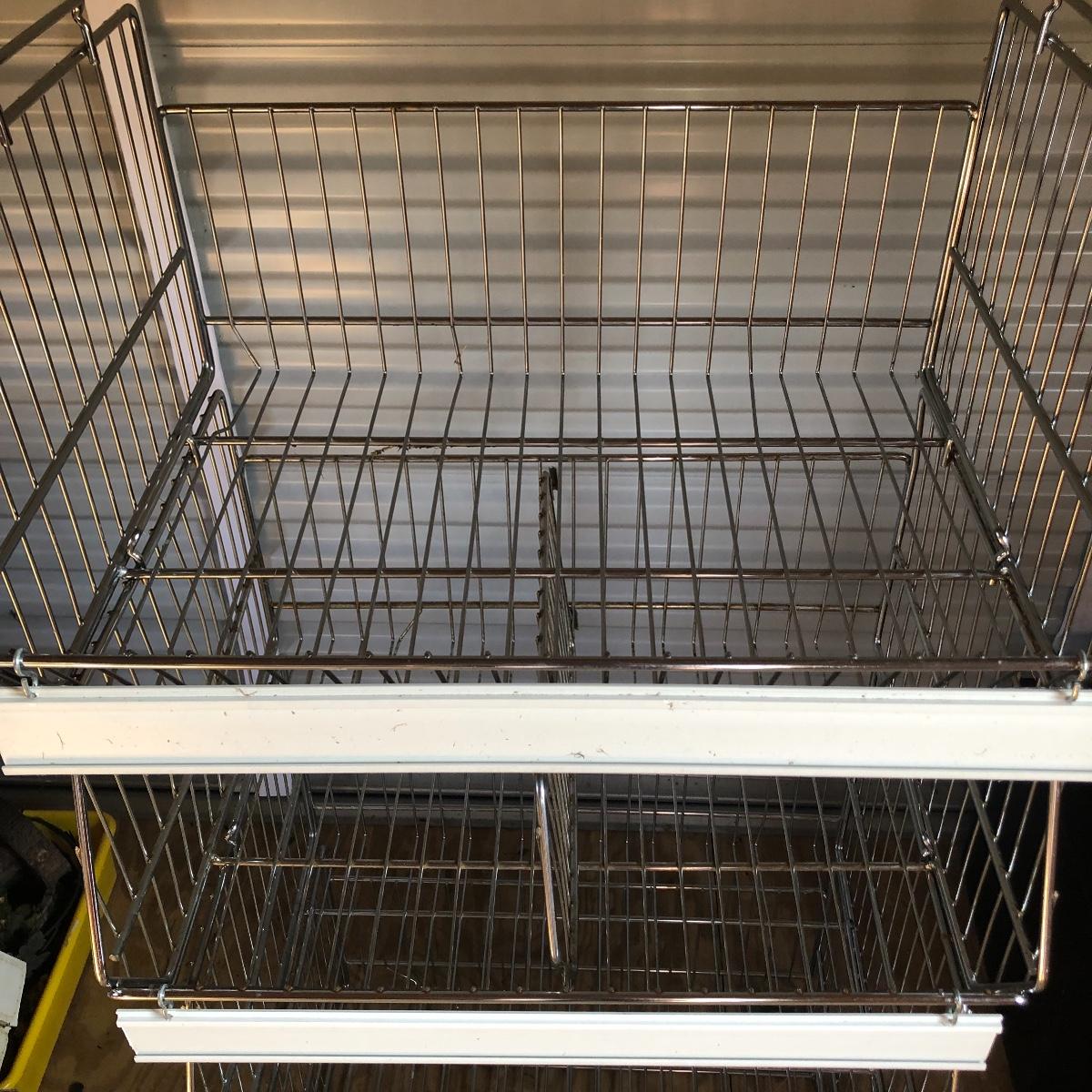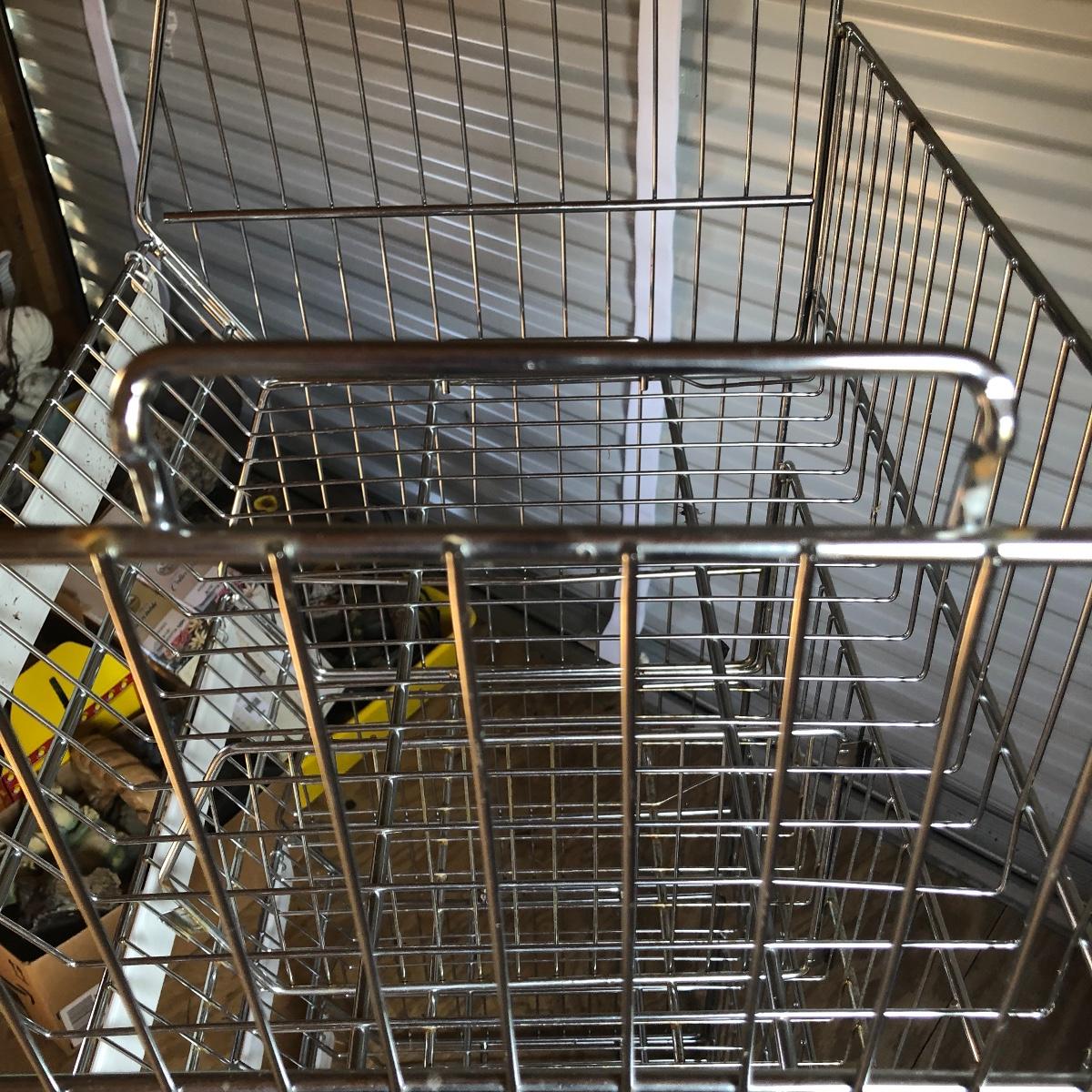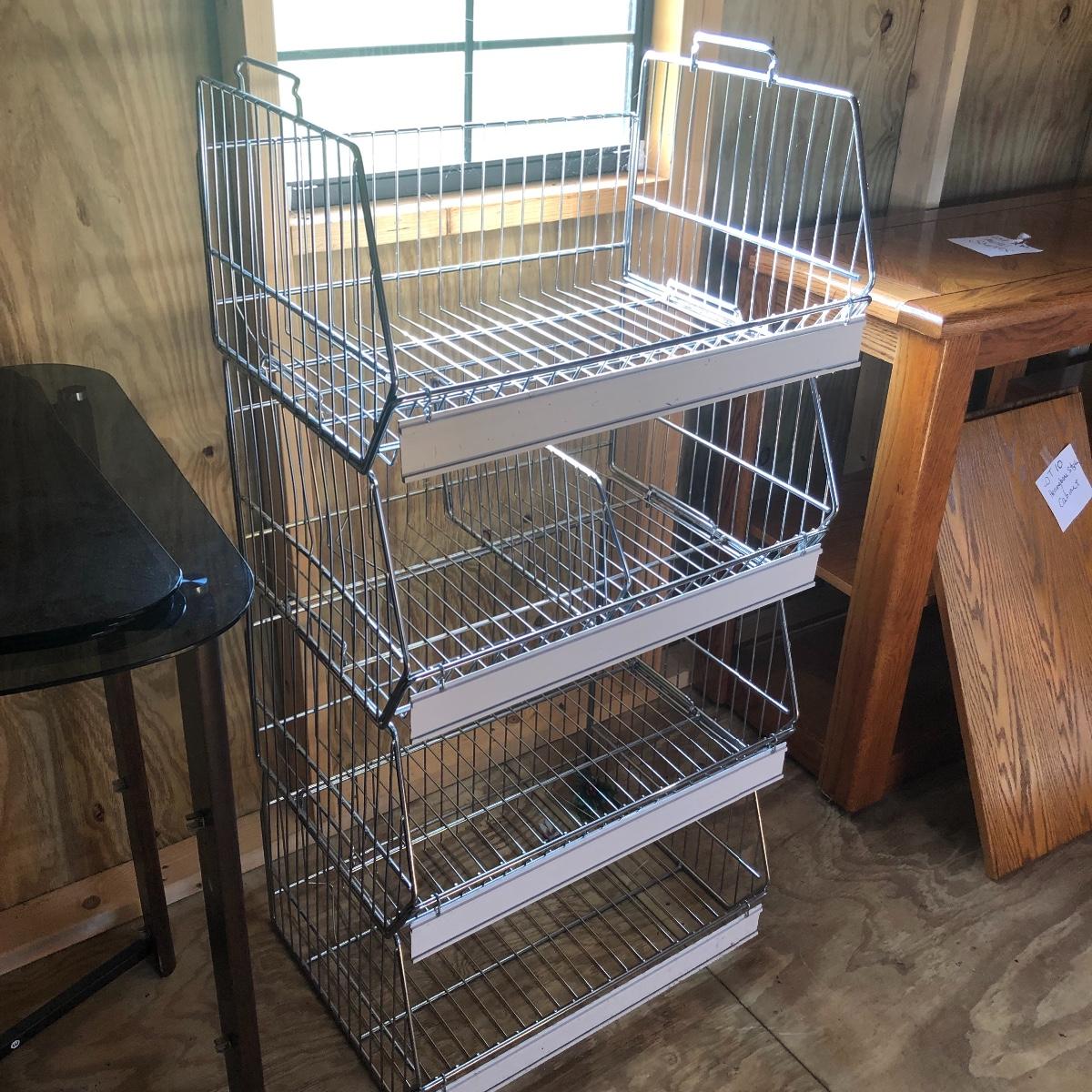 This four unit stacking shelf will pack a ton of storage. Each metal basket stacks effortlessly onto each other and all have white plastic pieces that are for sliding in labels, handles and one also has a divider. There is some minor surface rust just on the basket with the divider, all the rest look very clean.