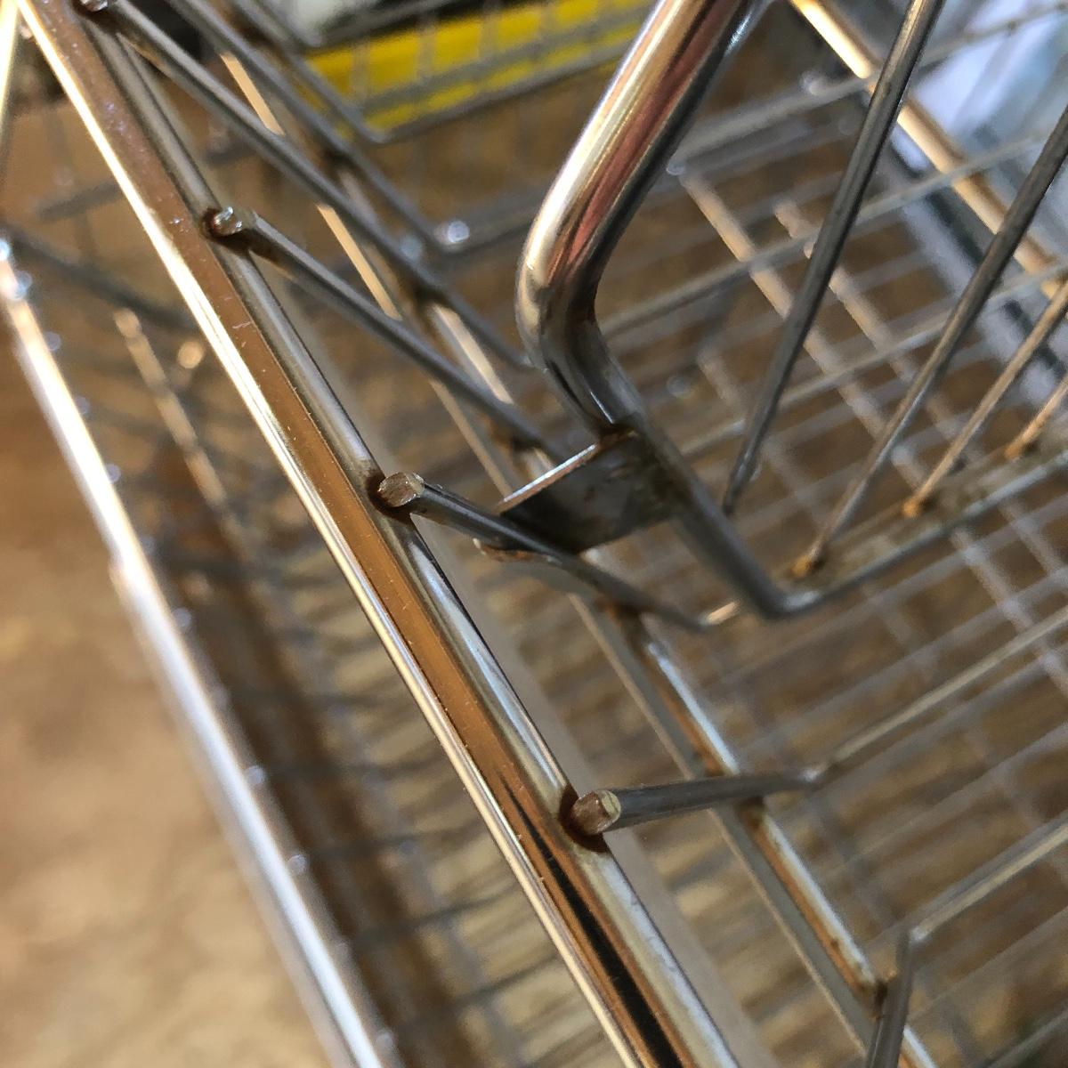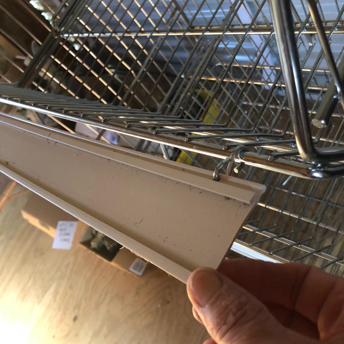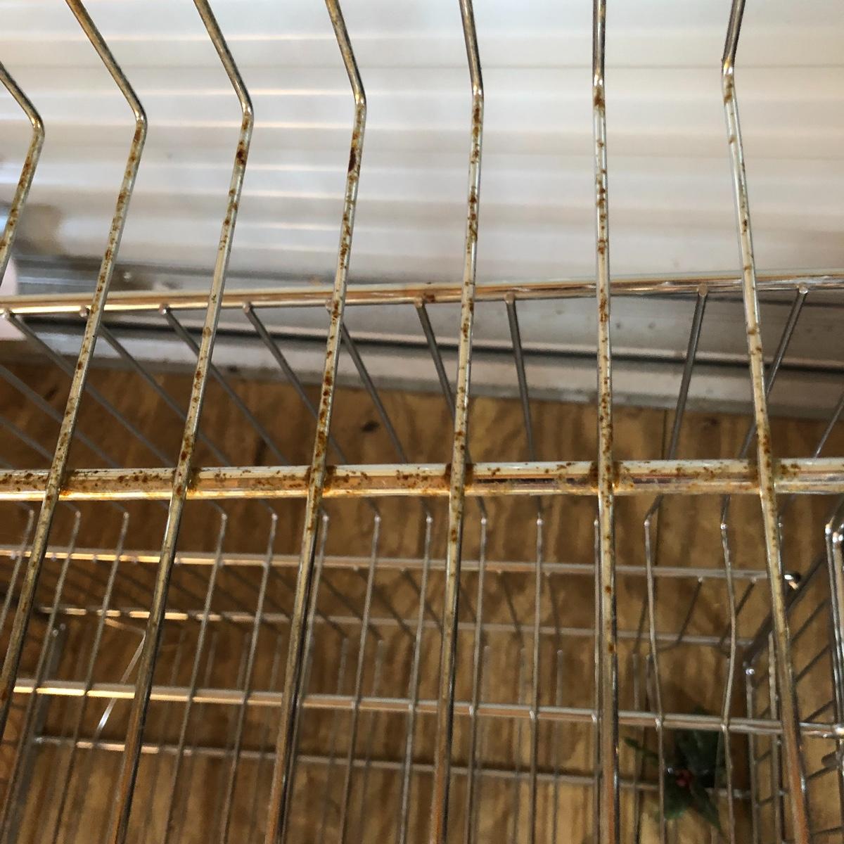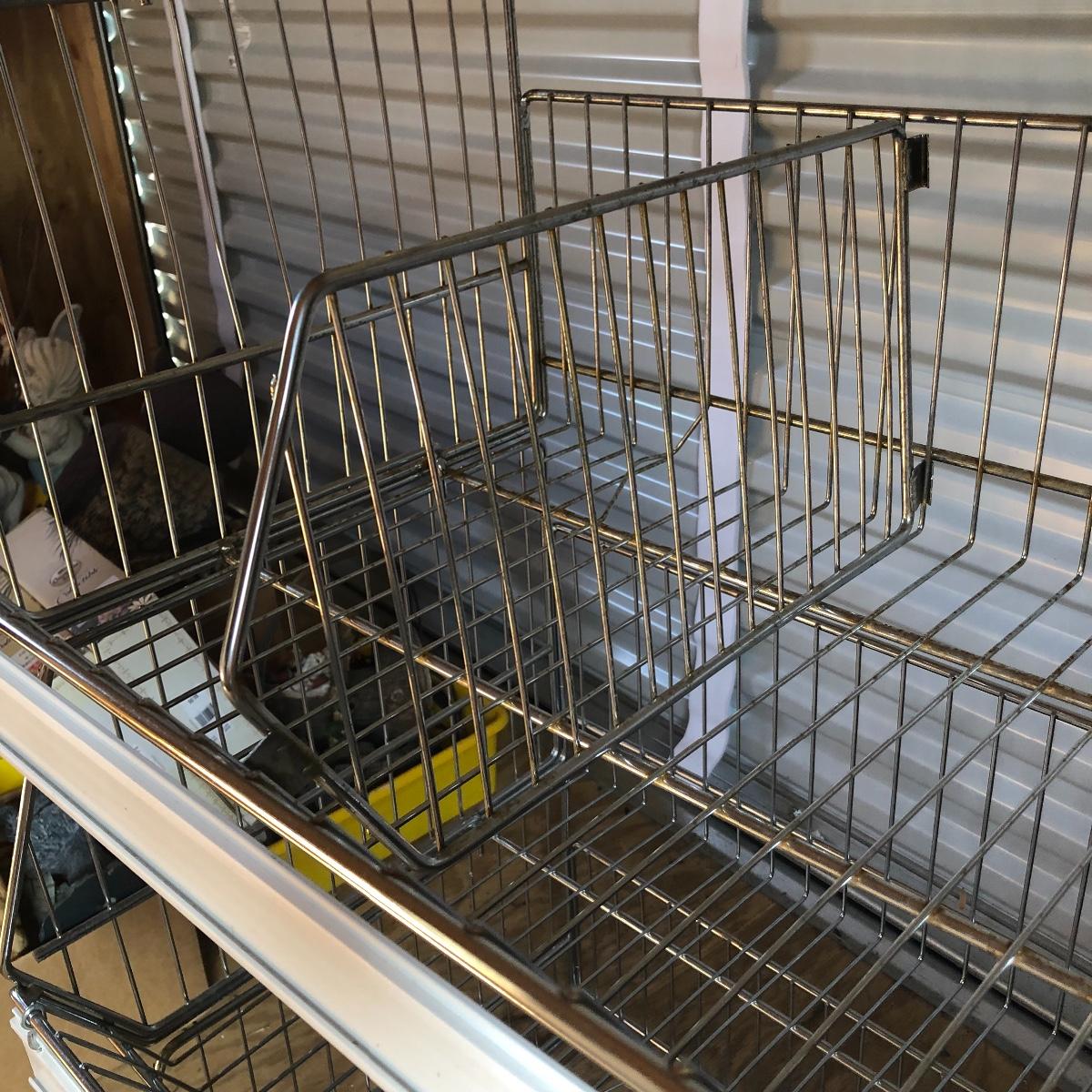 This four unit stacking shelf will pack a ton of storage. Each metal basket stacks effortlessly onto each other and all have white plastic pieces that are for sliding in labels, handles and one also has a divider. There is some minor surface rust just on the basket with the divider, all the rest look very clean.